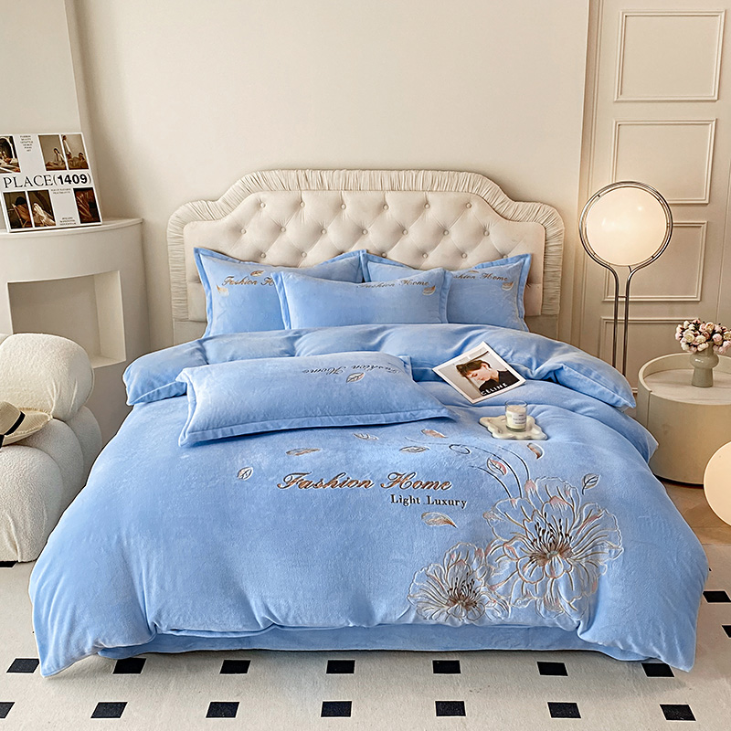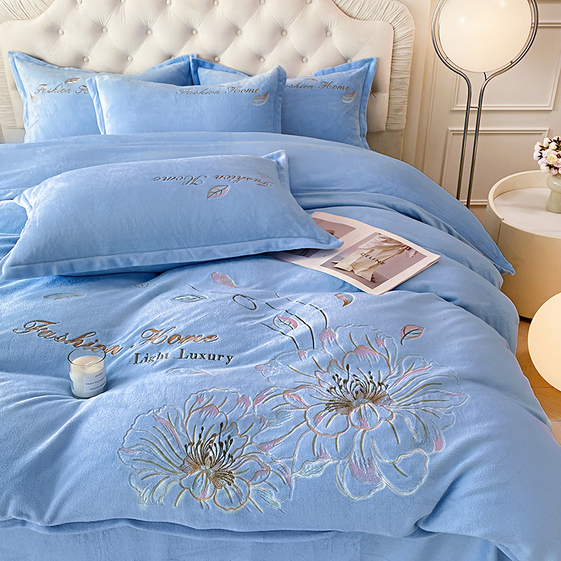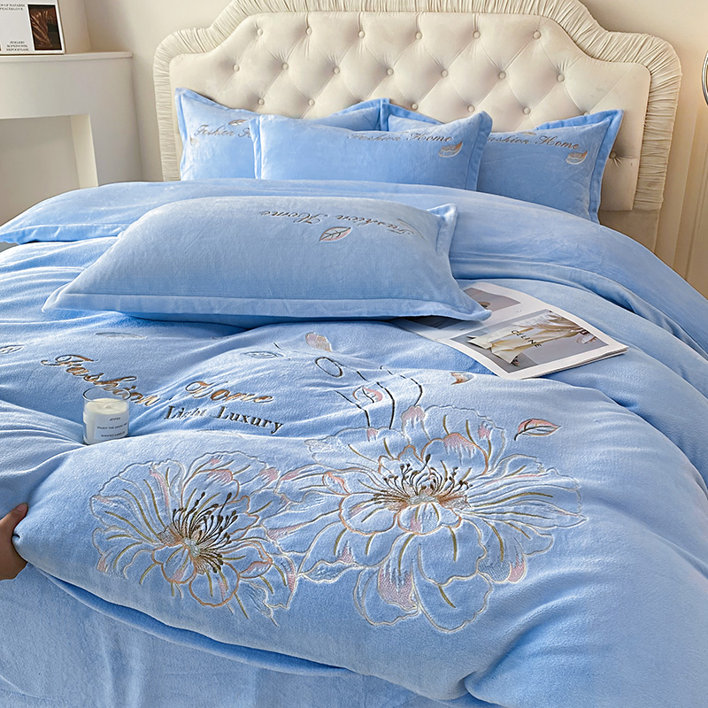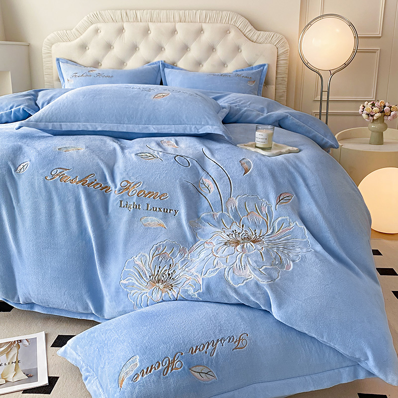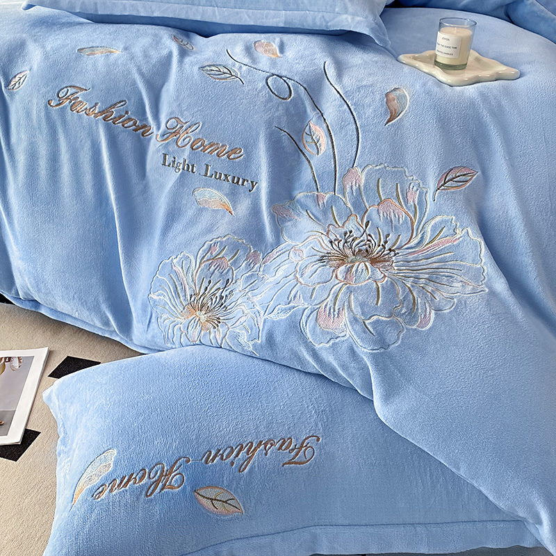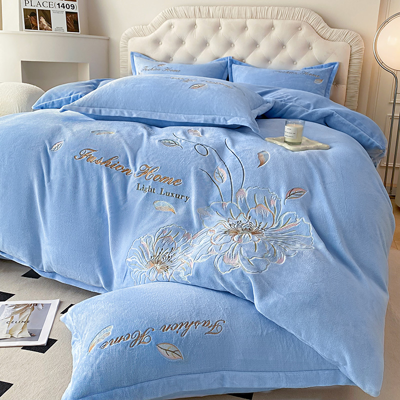 商品名称:航途席业 2025新款高克重牛奶绒刺绣四件套-花漾 花漾-海盐蓝