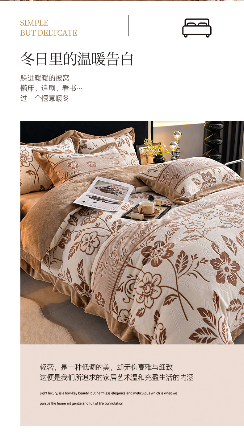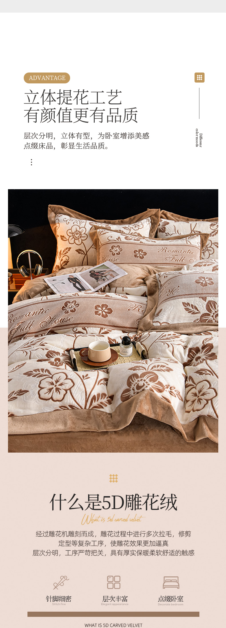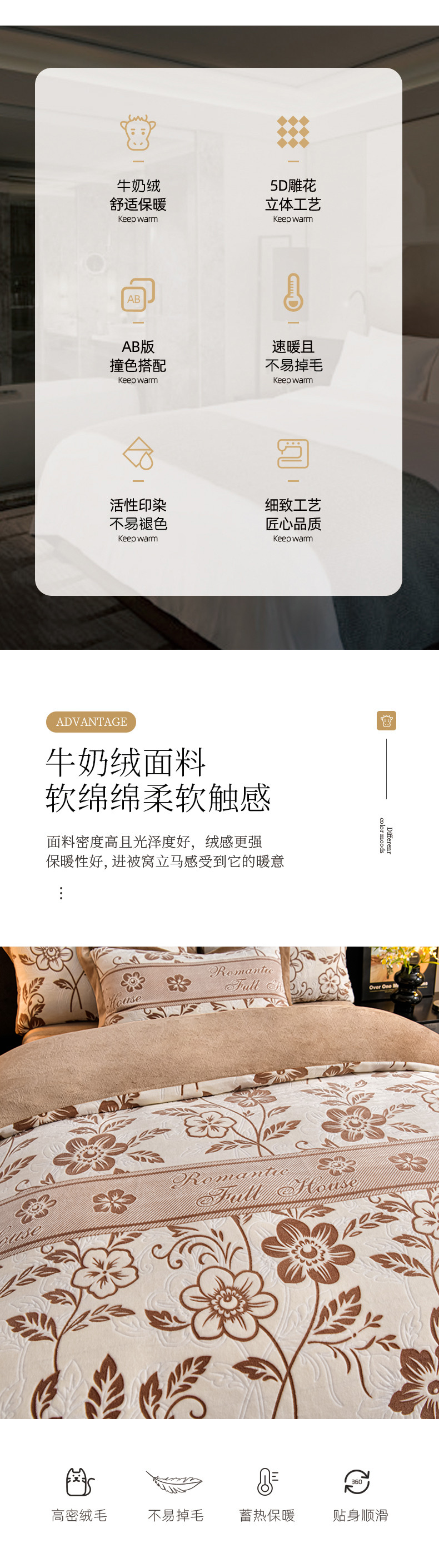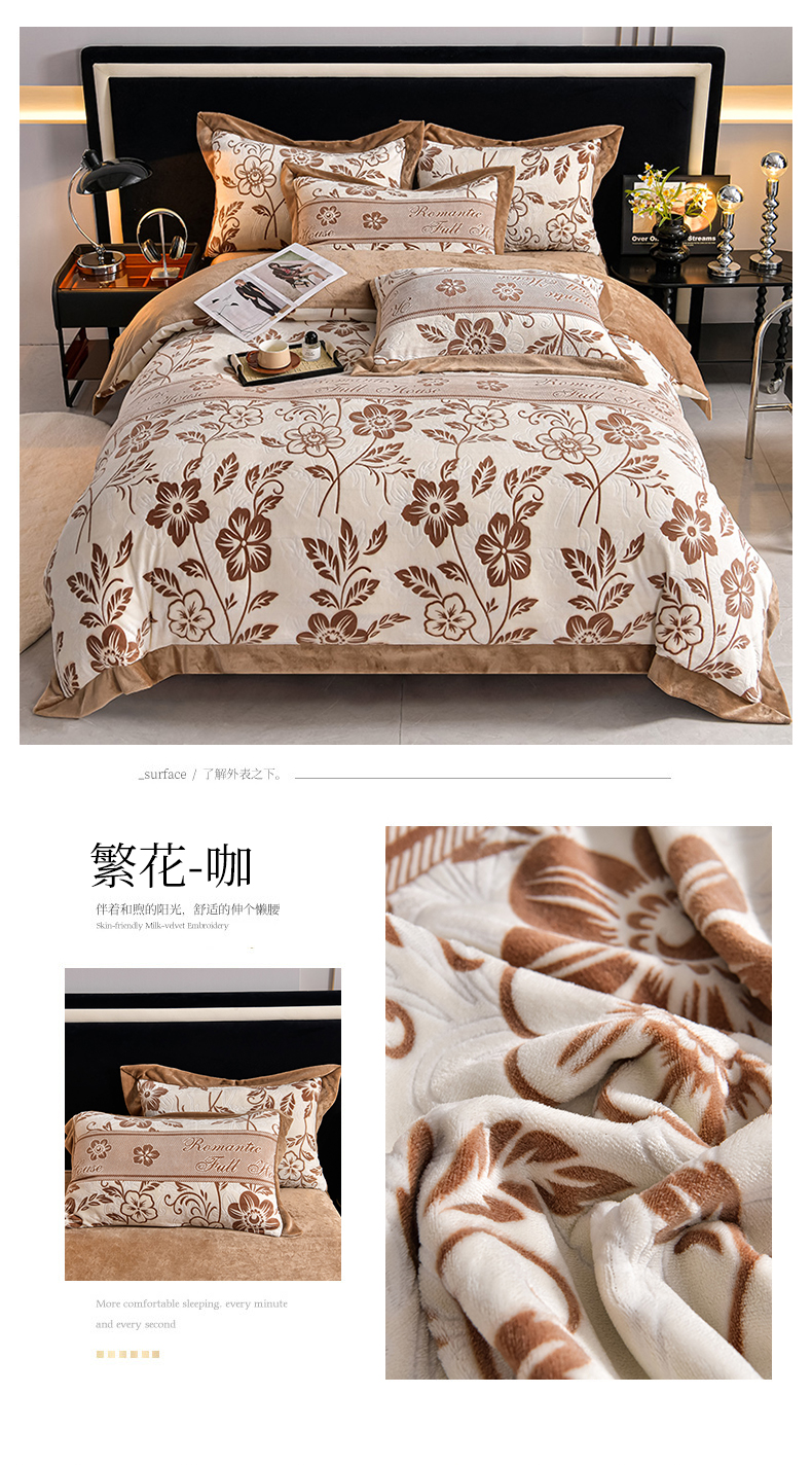 商品名称:馨梦缘 2025新款宽边5D雕花绒牛奶绒四件套 繁花-咖