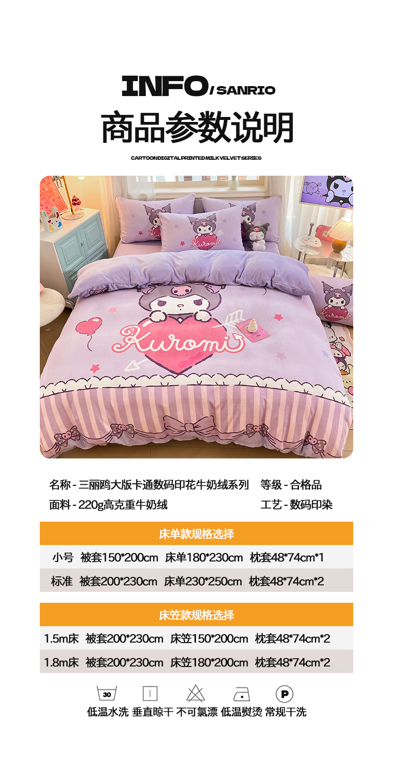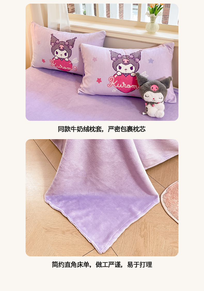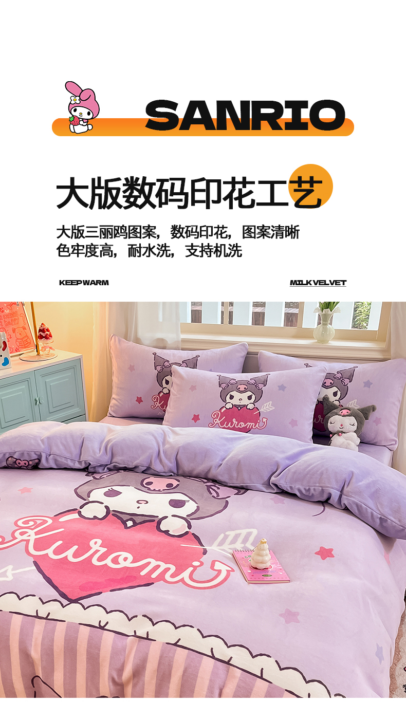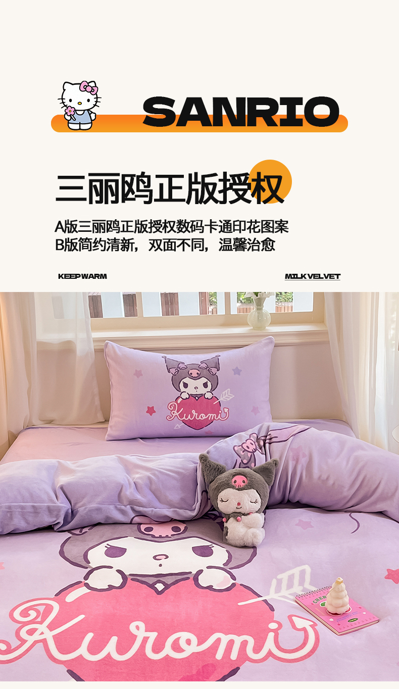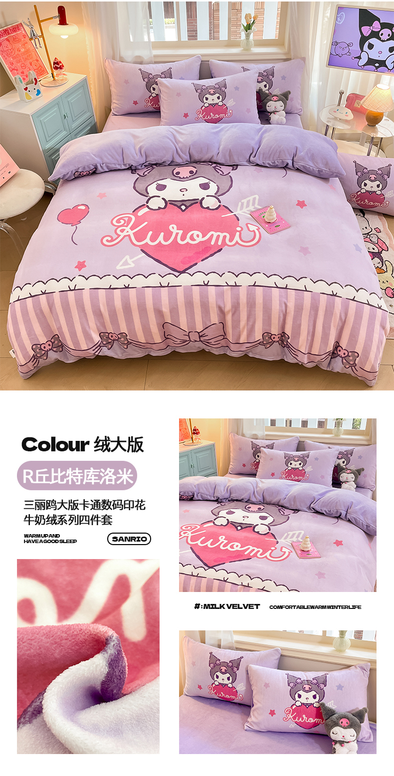 当前位置: 91家纺网 > 商品网购 > 床品套件 > 四件套 > 牛奶绒四件套 > 2024新品正版三丽鸥授权大版卡通平网数码印花加厚高克重牛奶绒系列四件套 绒大版-R丘比特库洛米