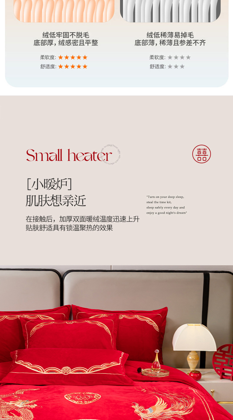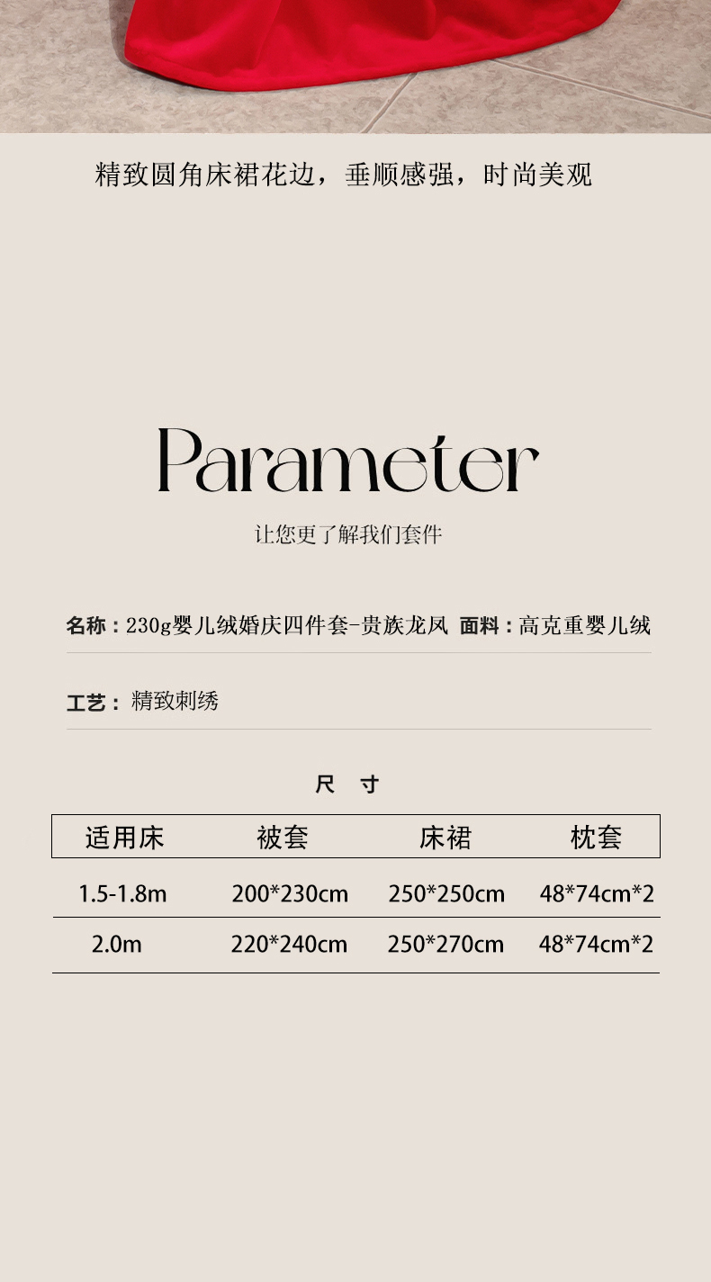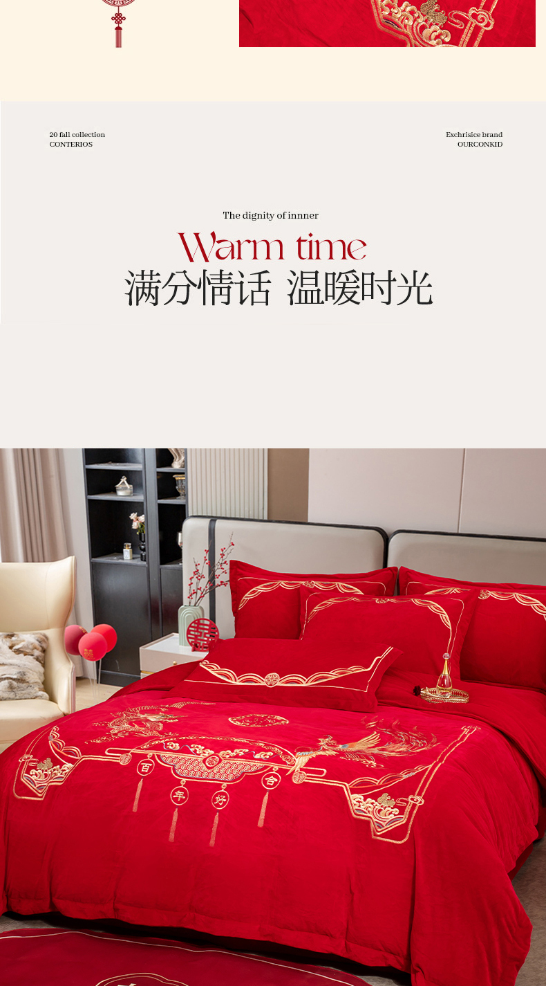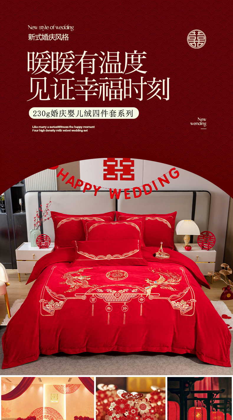 商品名称:张公子婚庆馆 2025新款宝宝绒婴儿绒婚庆刺绣四件套 高克重高端婚庆床上用品绣花四件套 贵族龙凤