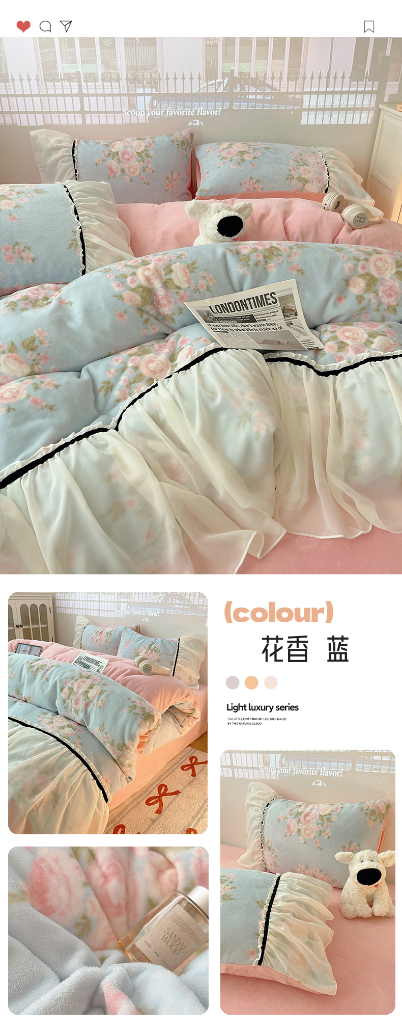 当前位置: 91家纺网 > 商品网购 > 床品套件 > 四件套 > 牛奶绒四件套 > 花漾家居 2024韩版蕾丝织带法式牛奶绒四件套 花香蓝