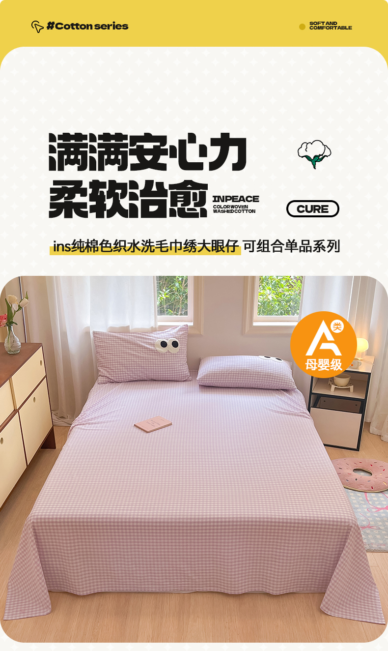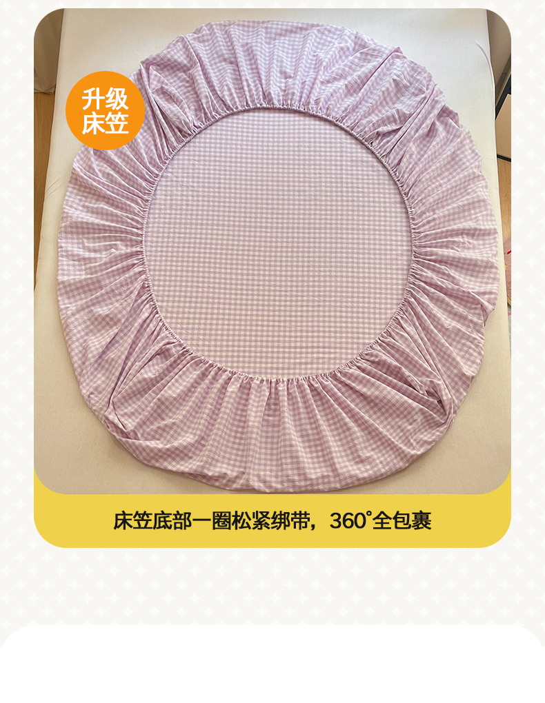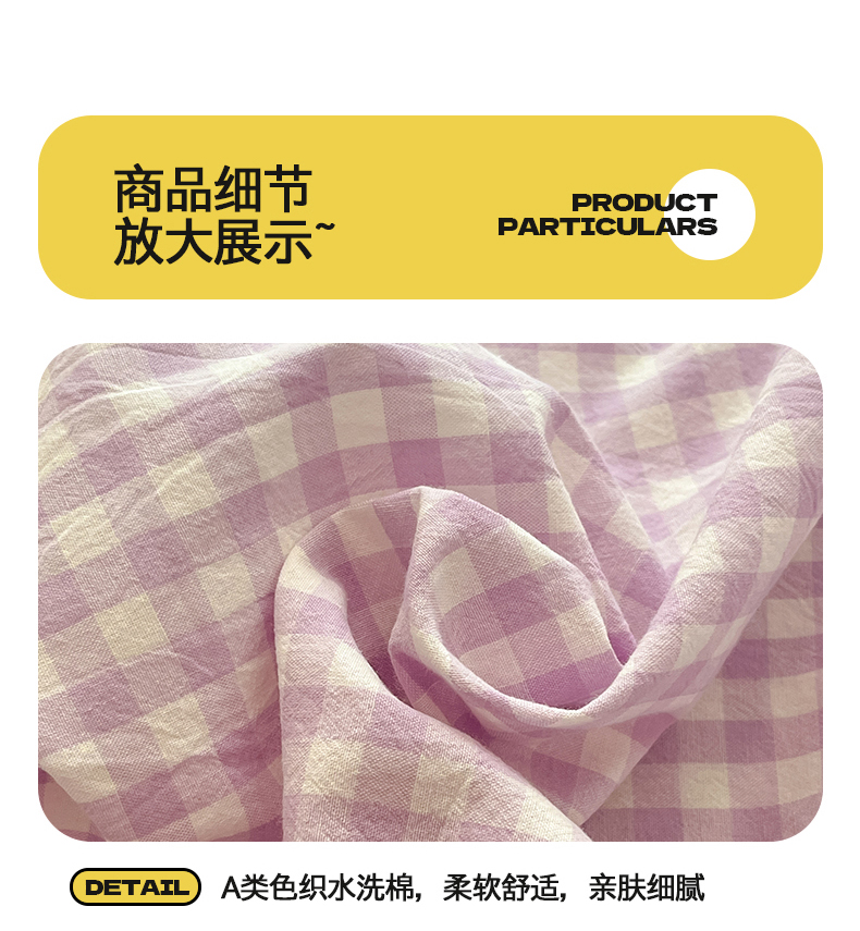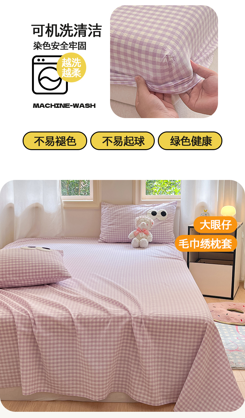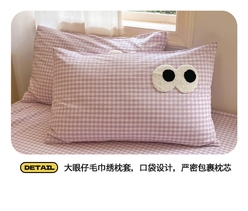 • 91家纺网 家纺一手货源 找家纺 桃子 2024新款ins纯棉色织水洗毛巾绣大眼仔单床笠 色织水洗棉-大眼仔紫格