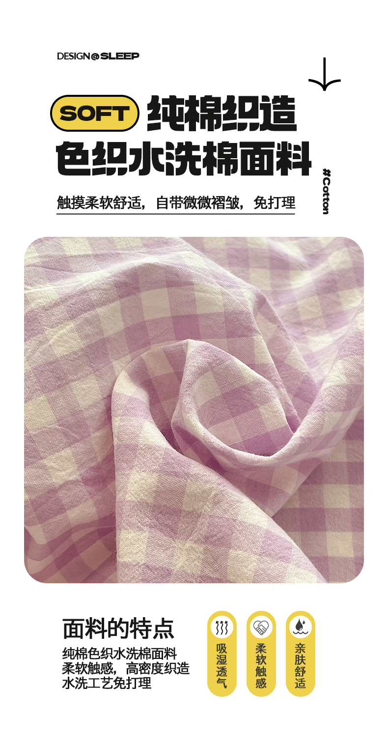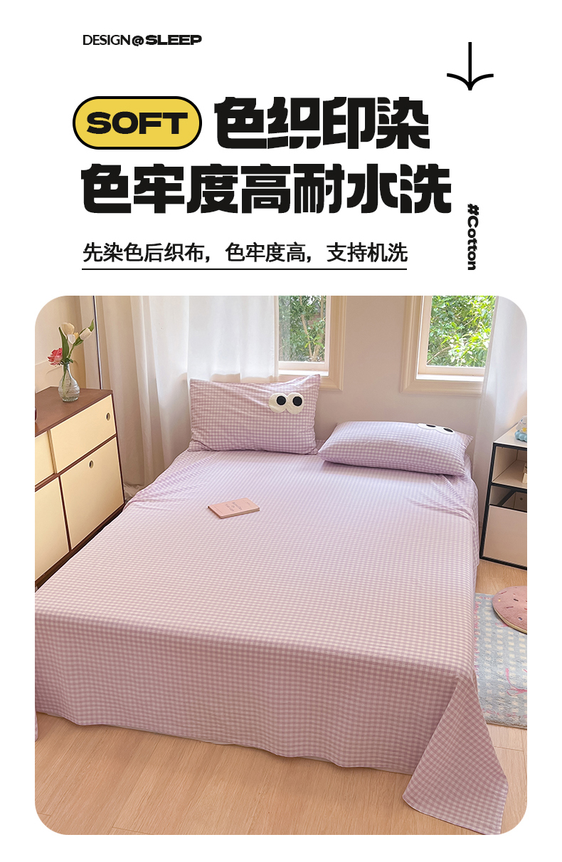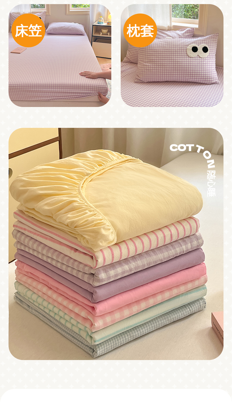 • 91家纺网 家纺一手货源 找家纺 桃子 2024新款ins纯棉色织水洗毛巾绣大眼仔单床笠 色织水洗棉-大眼仔紫格