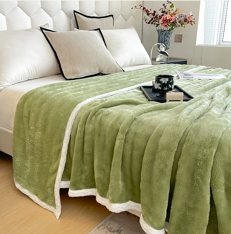 梵克保罗 2024新款仿兔毛泡泡绒牛奶绒毛毯盖毯包边毛毯 奶绿