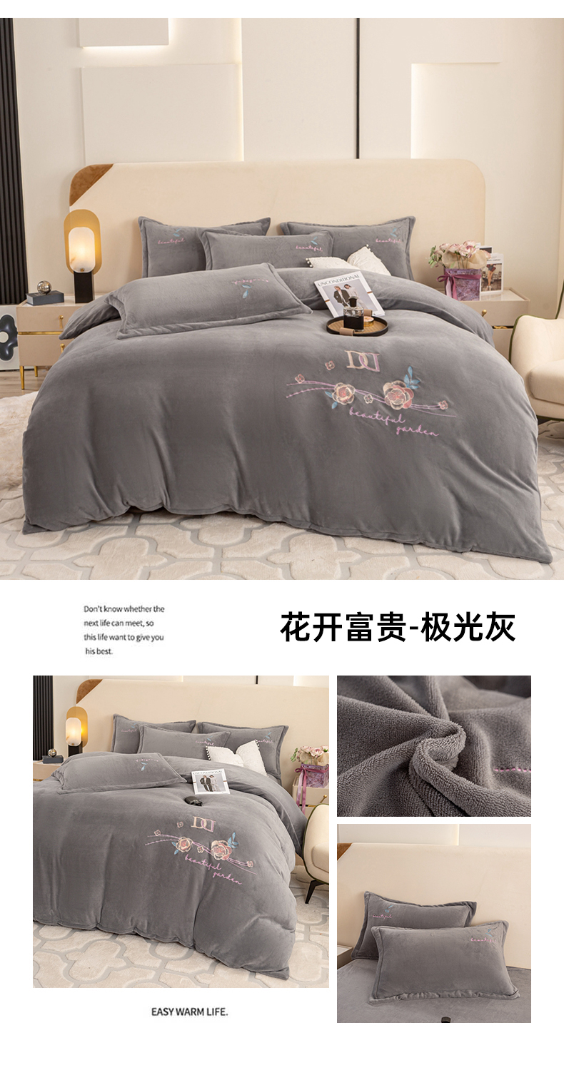 昊翔家纺 2024新款高克重牛奶绒刺绣四件套 花开富贵-极光灰