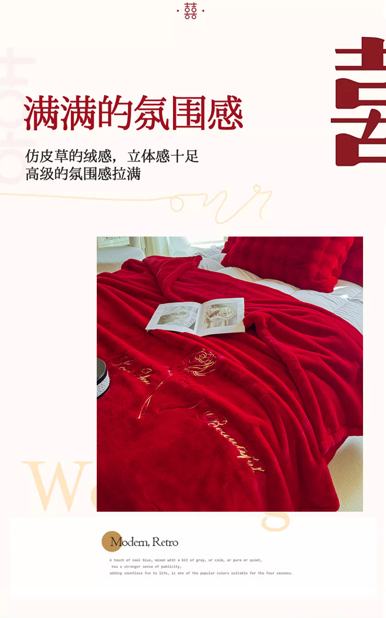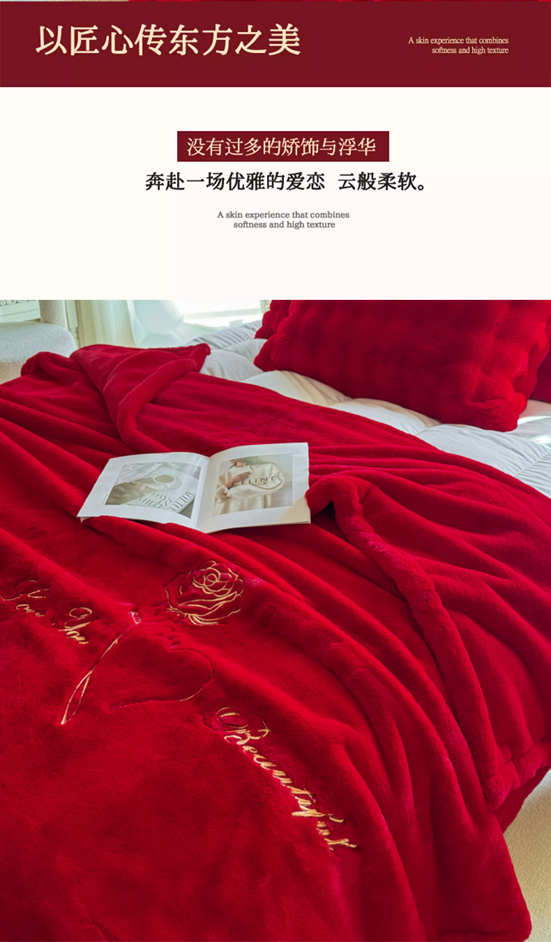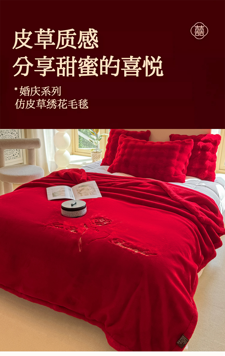 尚品绵羊毛毯 2025新款高端婚庆毛毯双层加厚仿貂皮草绣花毯盖毯 玫瑰情深-大红