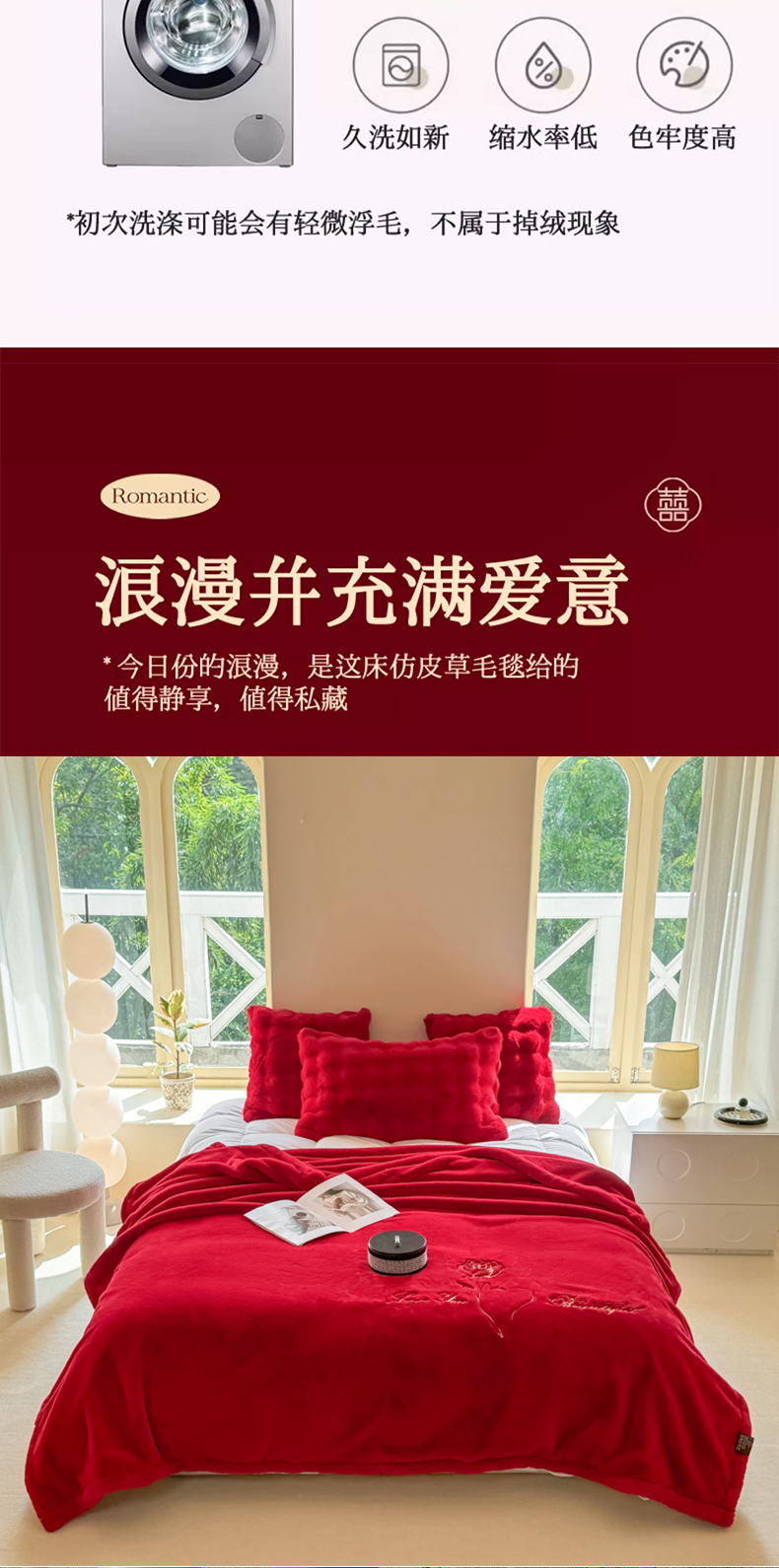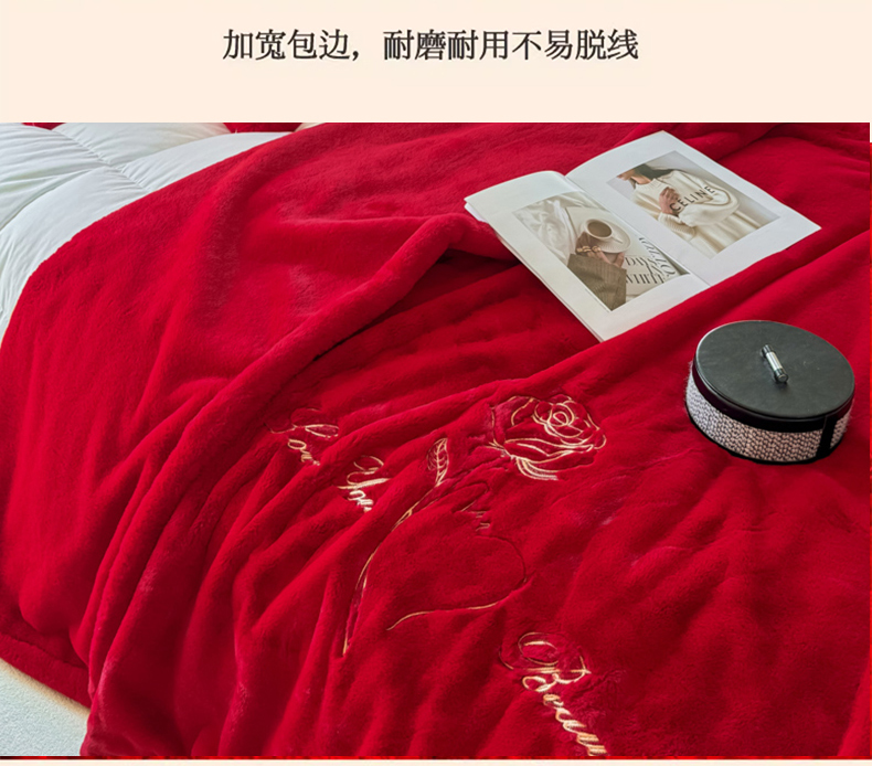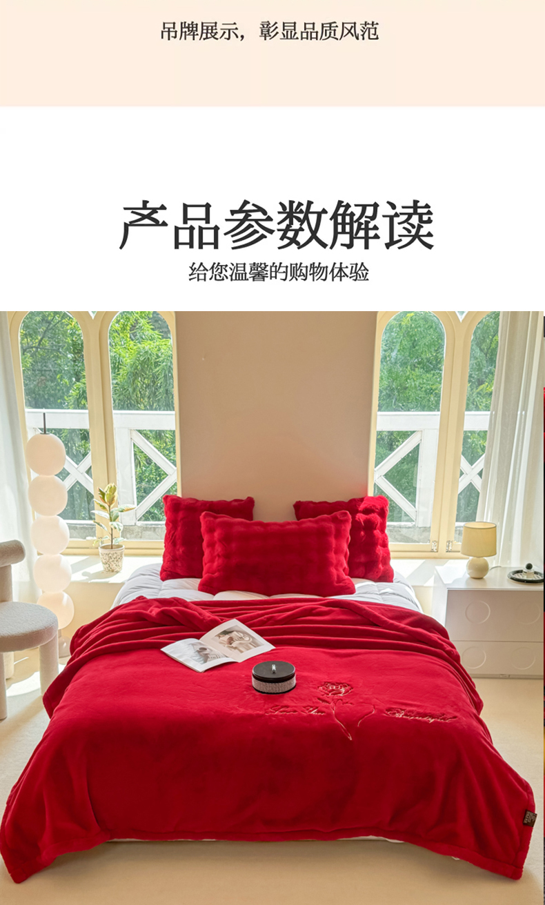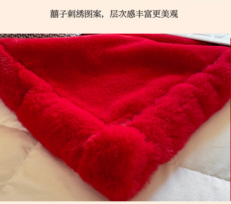 商品名称:尚品绵羊毛毯 2025新款高端婚庆毛毯双层加厚仿貂皮草绣花毯盖毯 玫瑰情深-大红