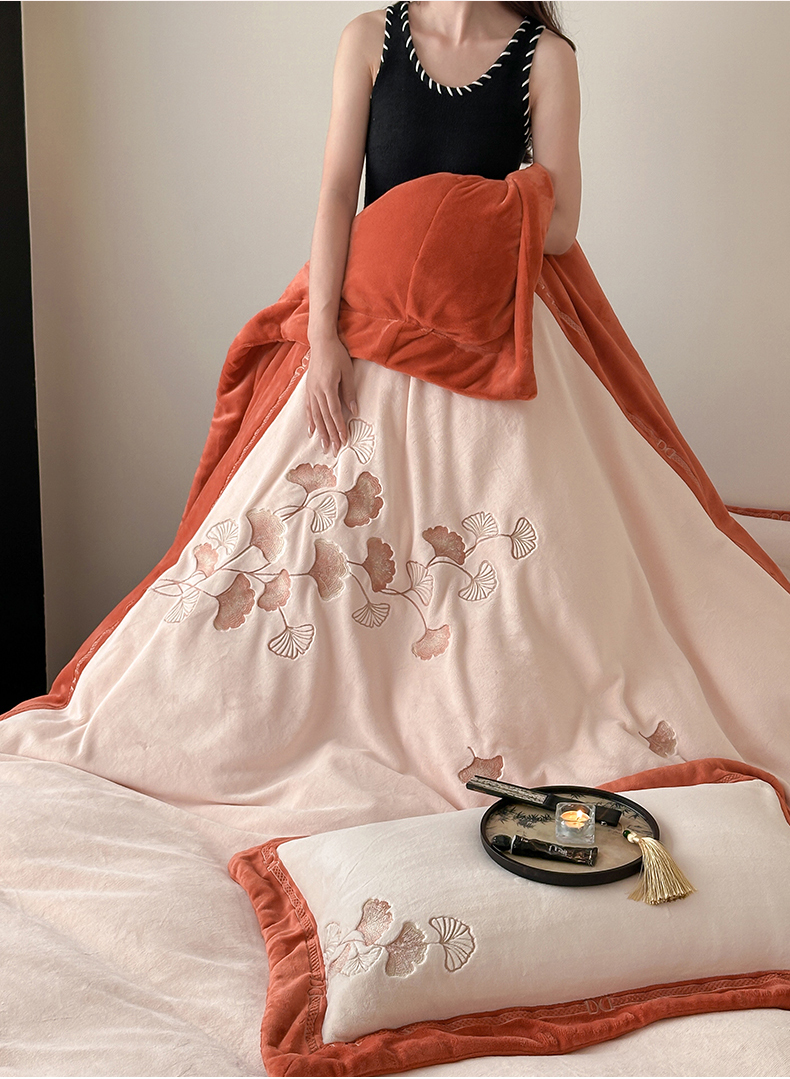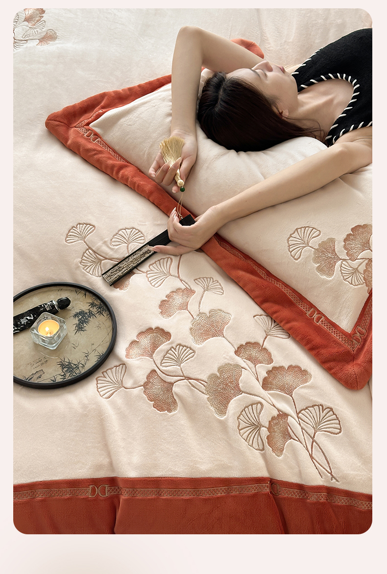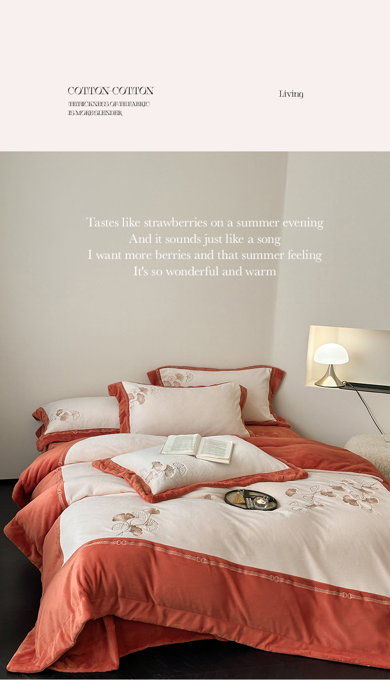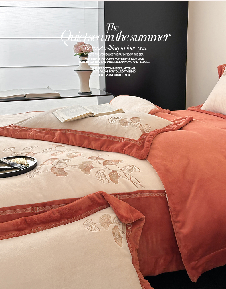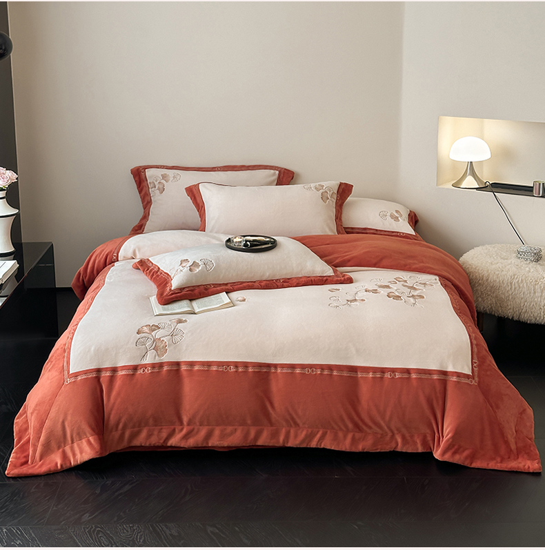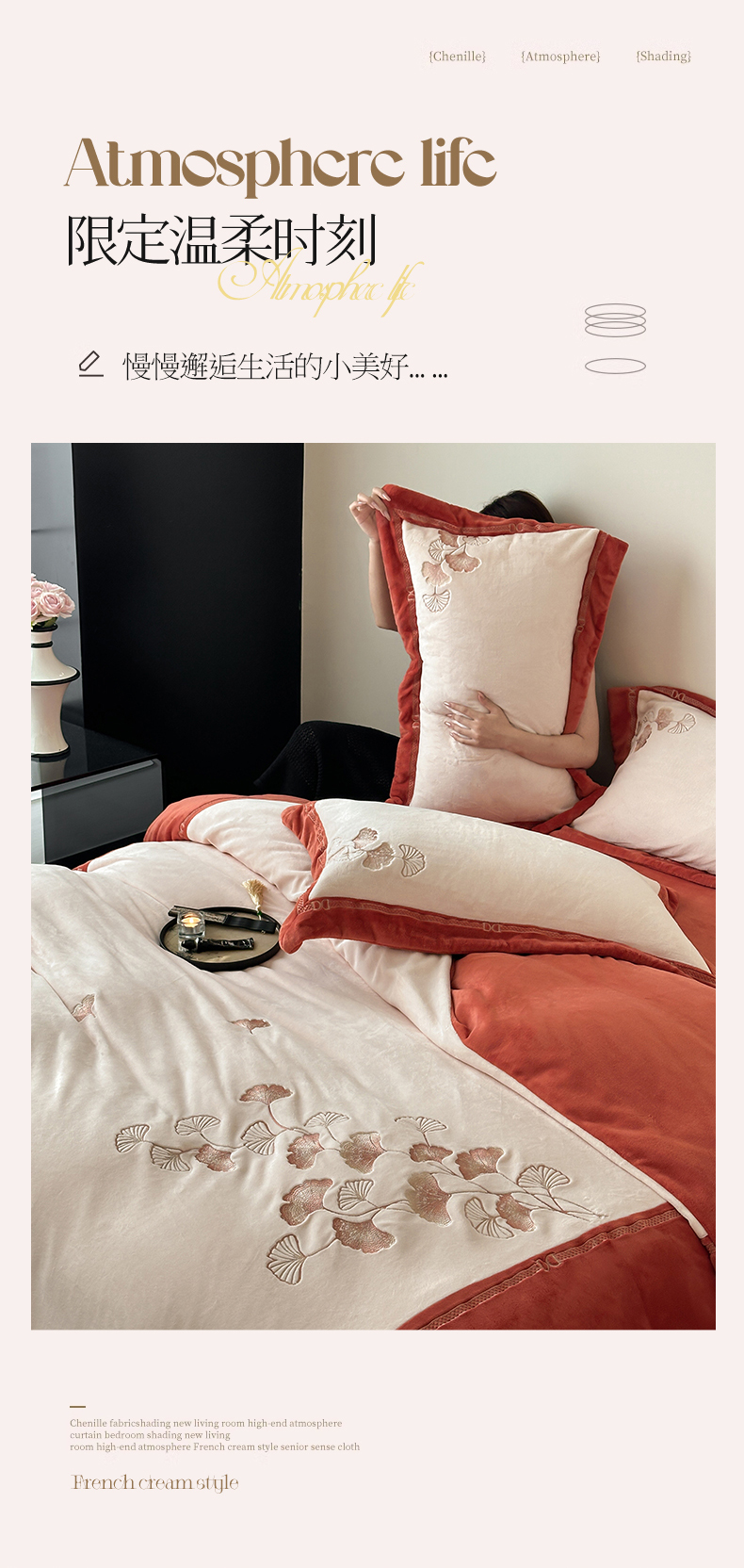 2024新款高克重牛奶绒绣花四件套-叶起华裳 太妃红