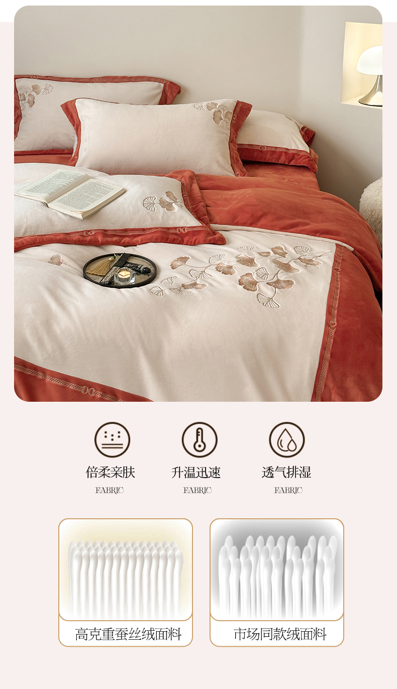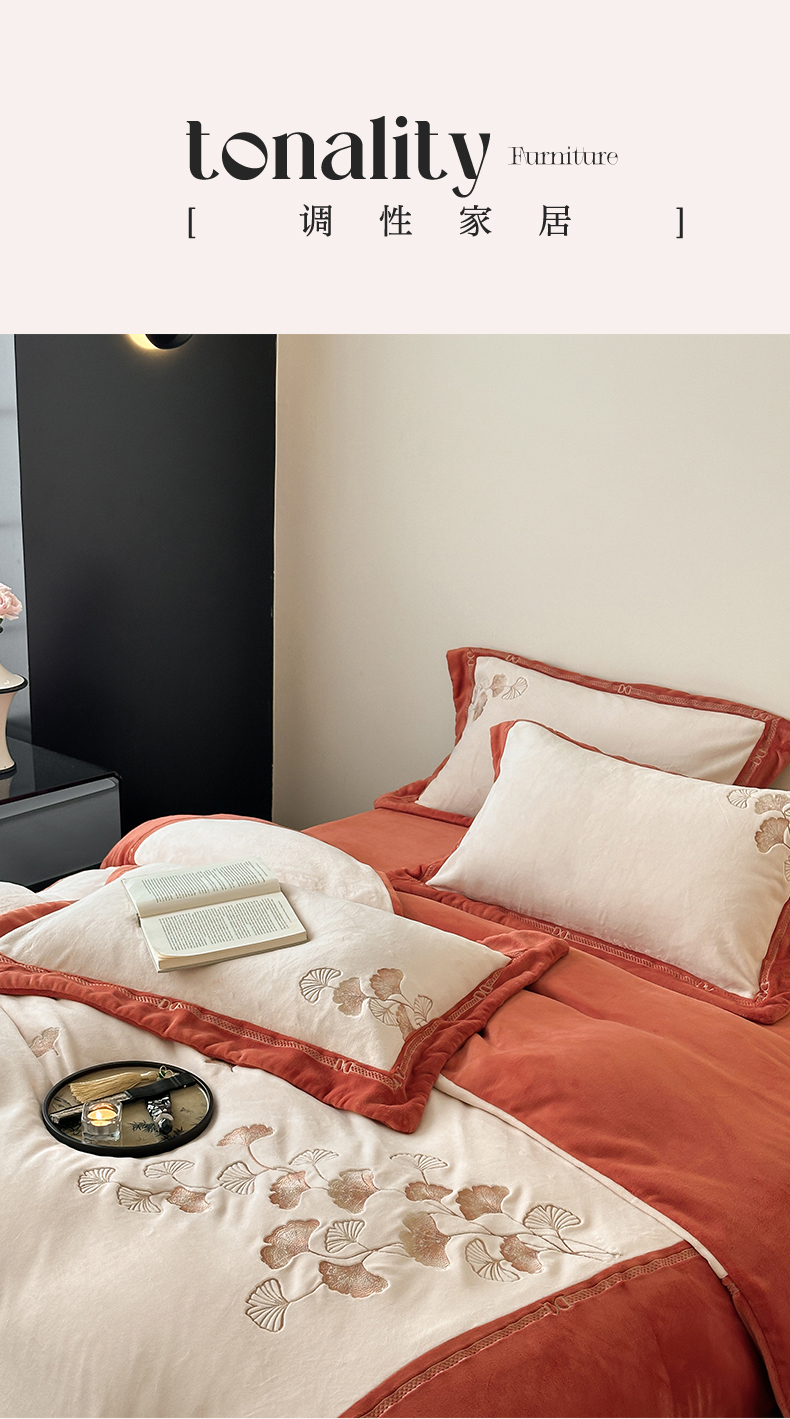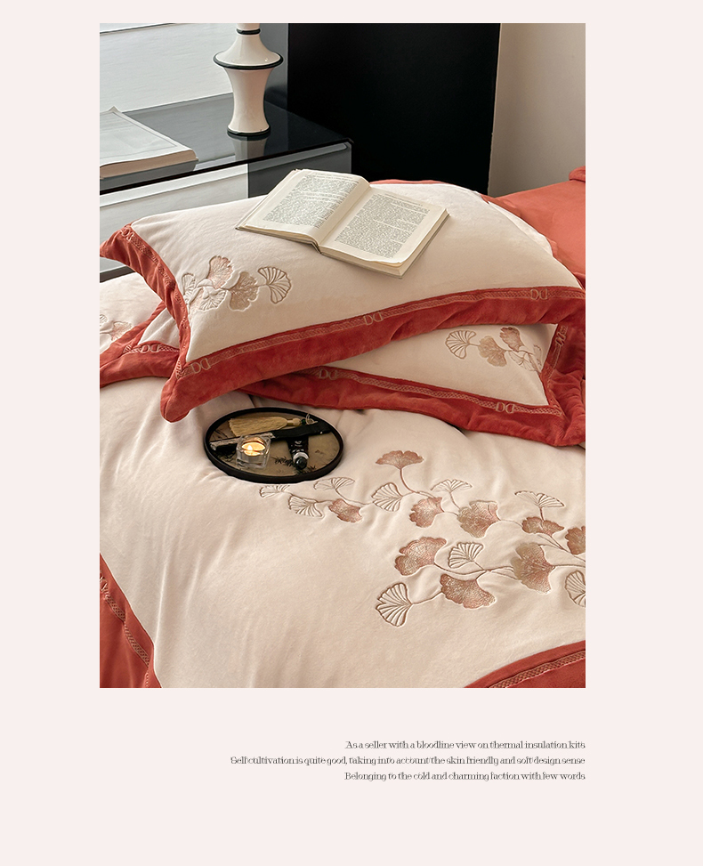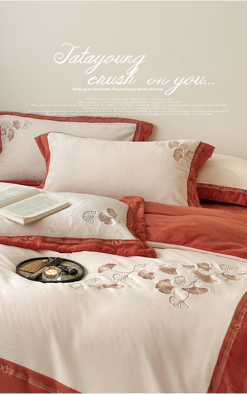 商品名称:2024新款高克重牛奶绒绣花四件套-叶起华裳 太妃红