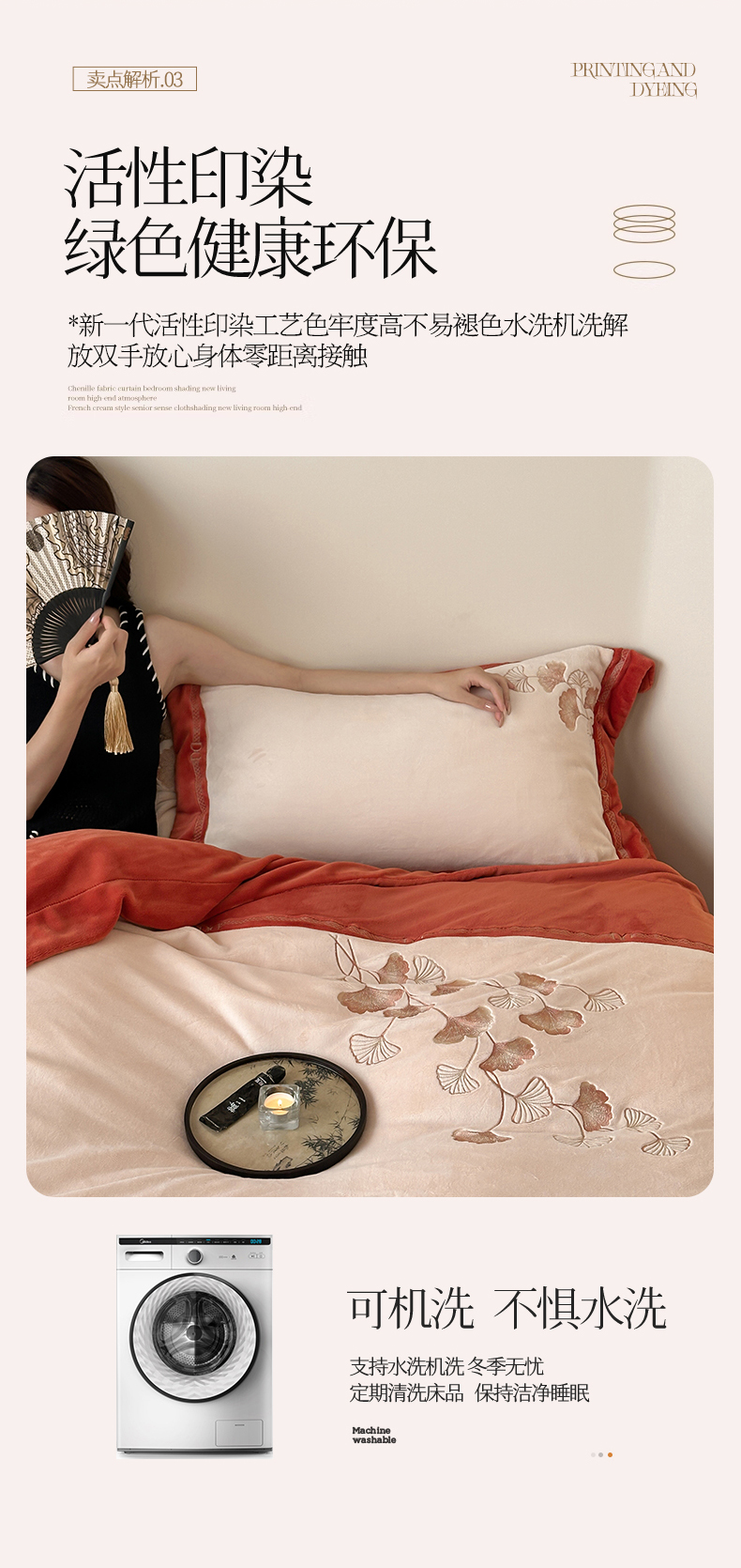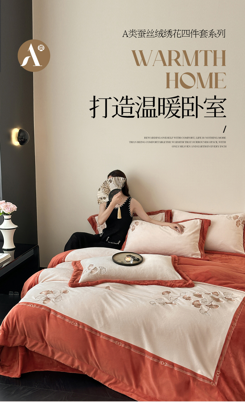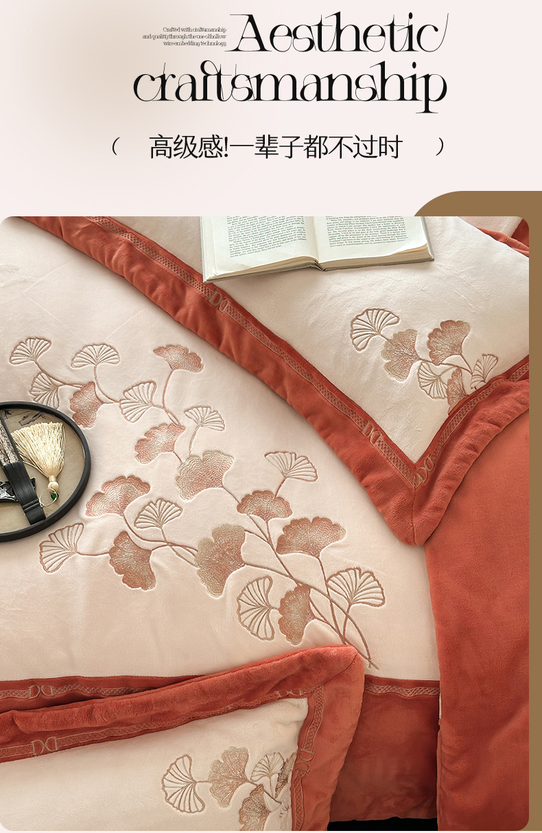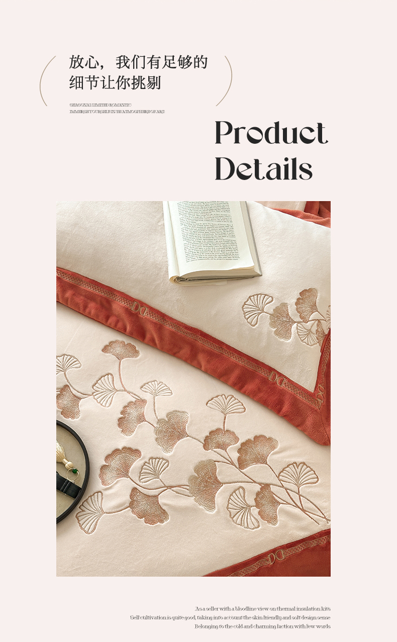 商品名称:2024新款高克重牛奶绒绣花四件套-叶起华裳 太妃红