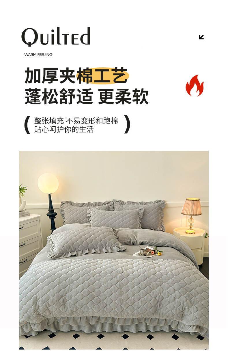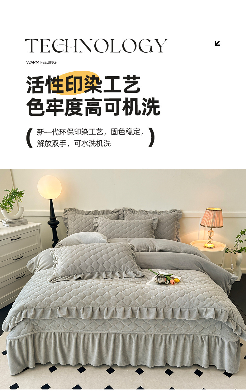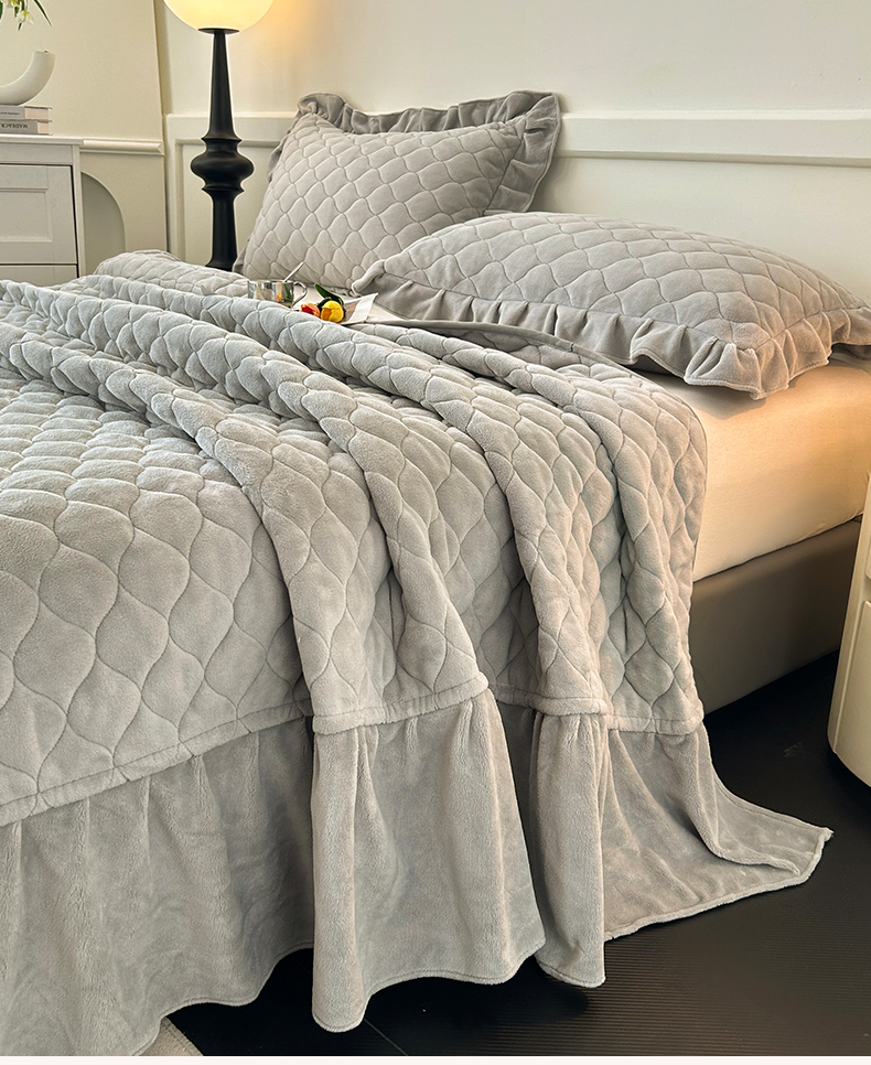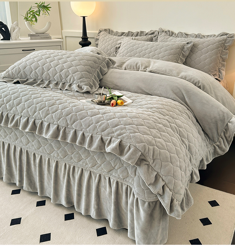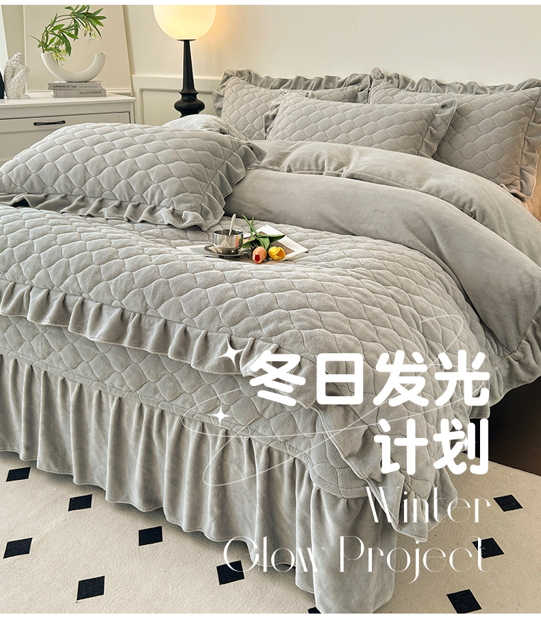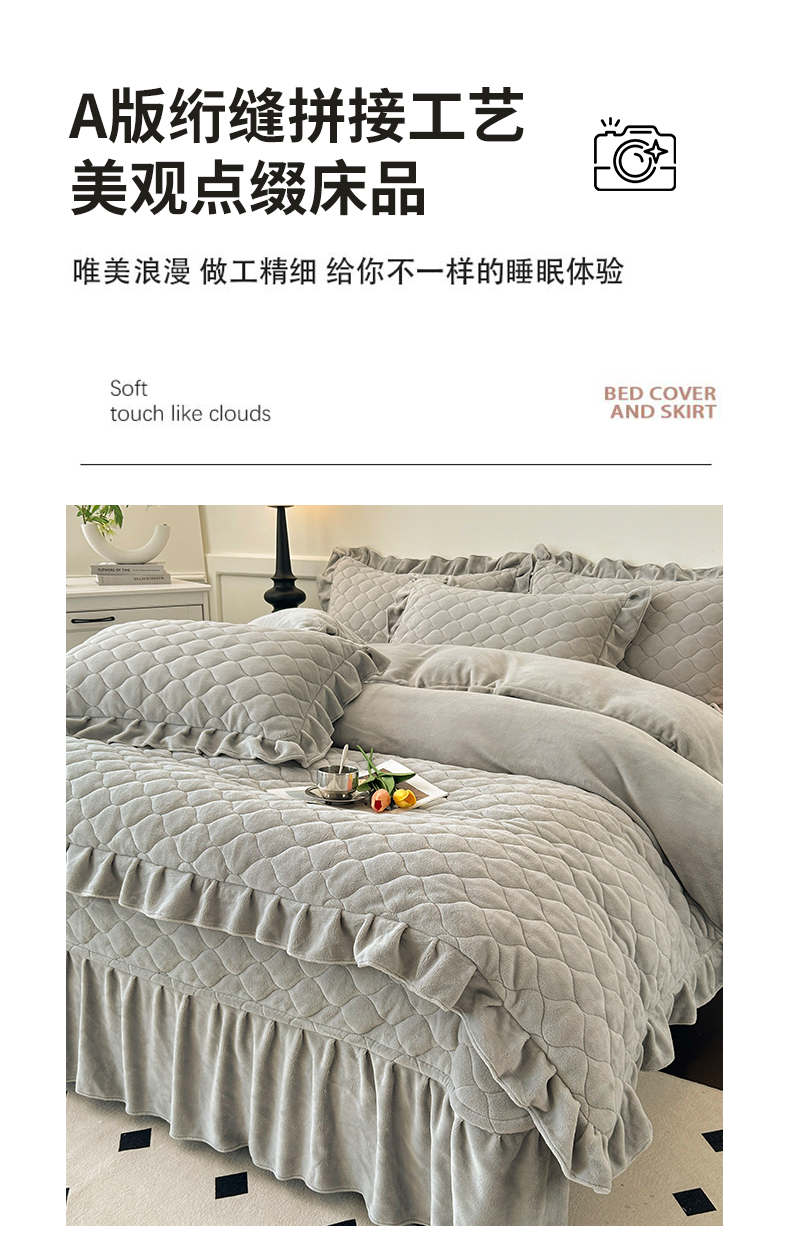 (总)屹成家纺2025新款水晶绒夹棉绗缝床裙四件套(塞纳河畔)四件套起售价不低于230元,大红,豆沙,翡翠绿,粉玉,橄榄绿,蔚蓝,银灰