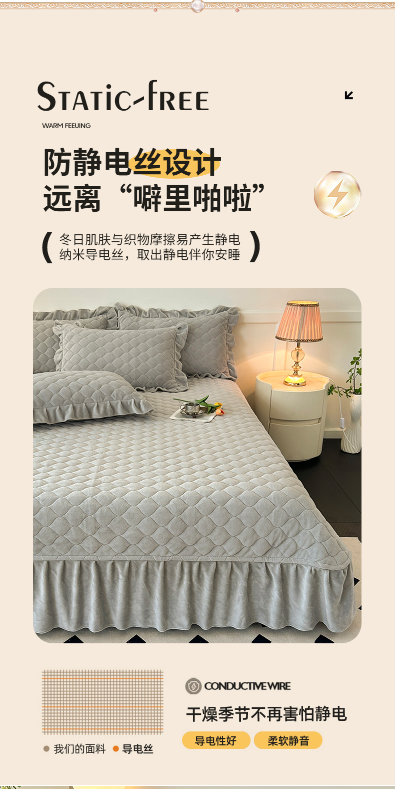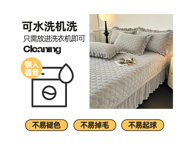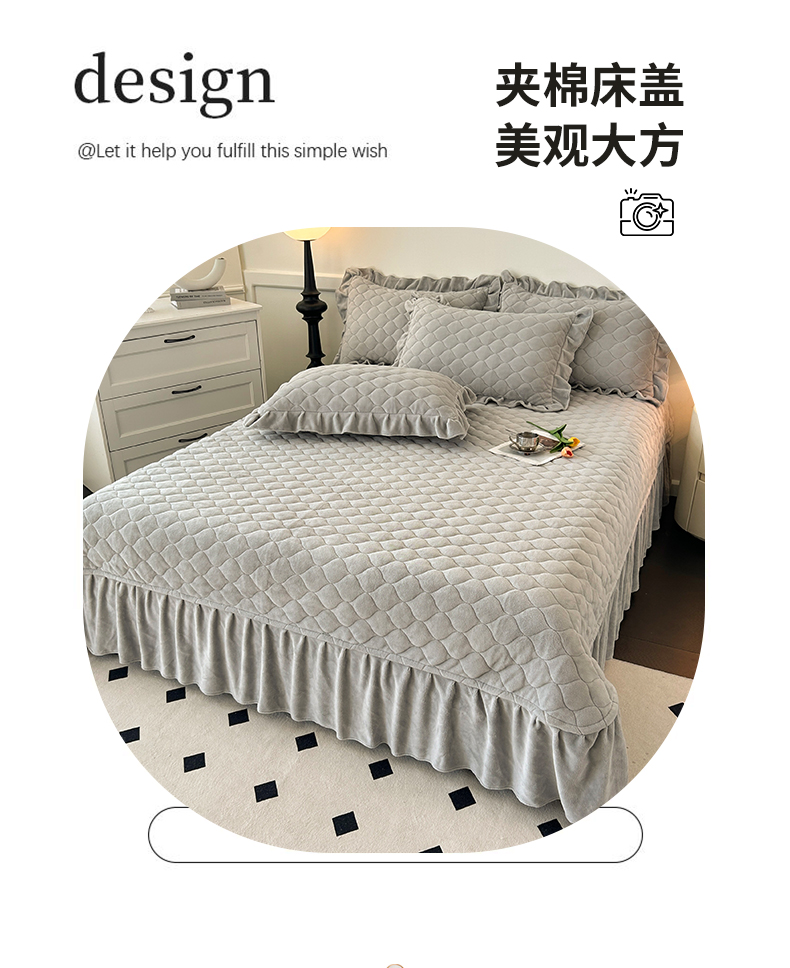 (总)屹成家纺2025新款水晶绒夹棉绗缝蕾丝床裙三件套(塞纳河畔)床裙单件起售价不低于105元,大红,豆沙,翡翠绿,粉玉,橄榄绿,蔚蓝,银灰