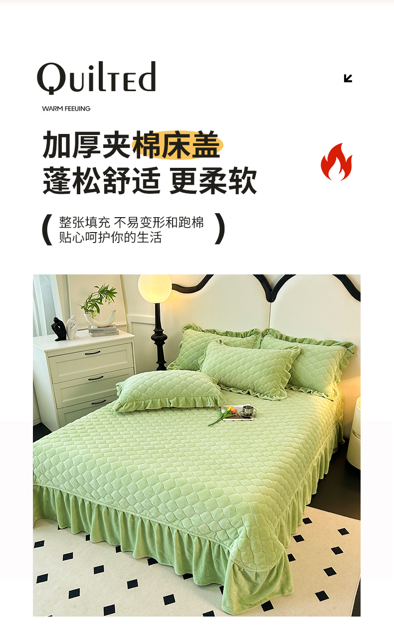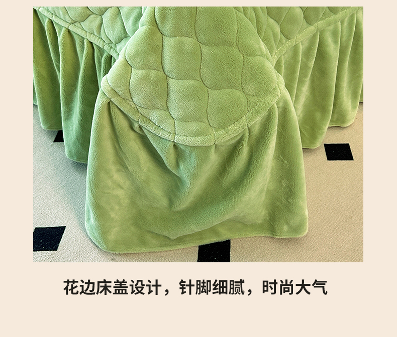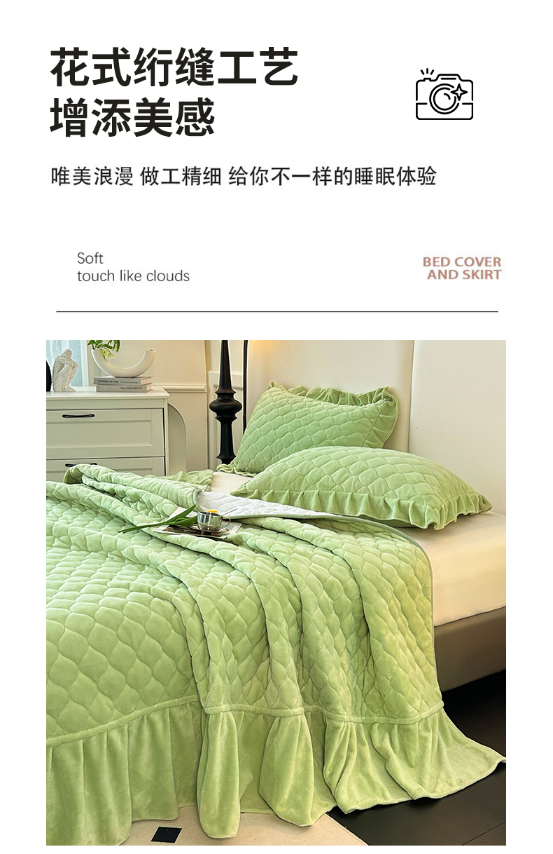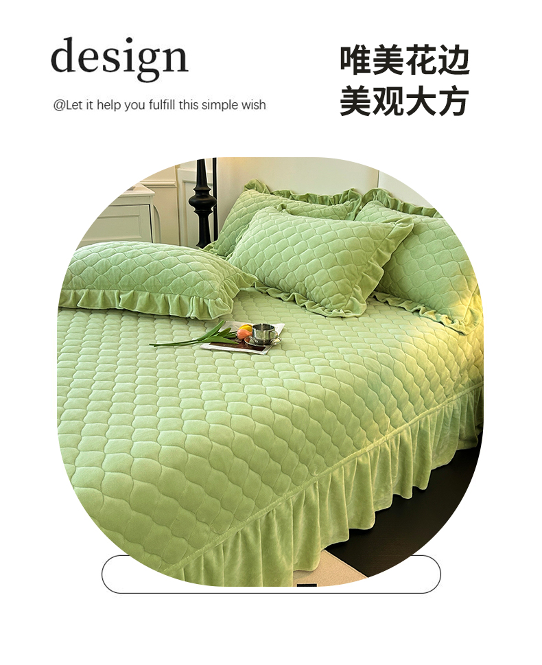 (总)屹成家纺2025新款水晶绒夹棉绗缝蕾丝床裙三件套(塞纳河畔)床裙单件起售价不低于105元,大红,豆沙,翡翠绿,粉玉,橄榄绿,蔚蓝,银灰
