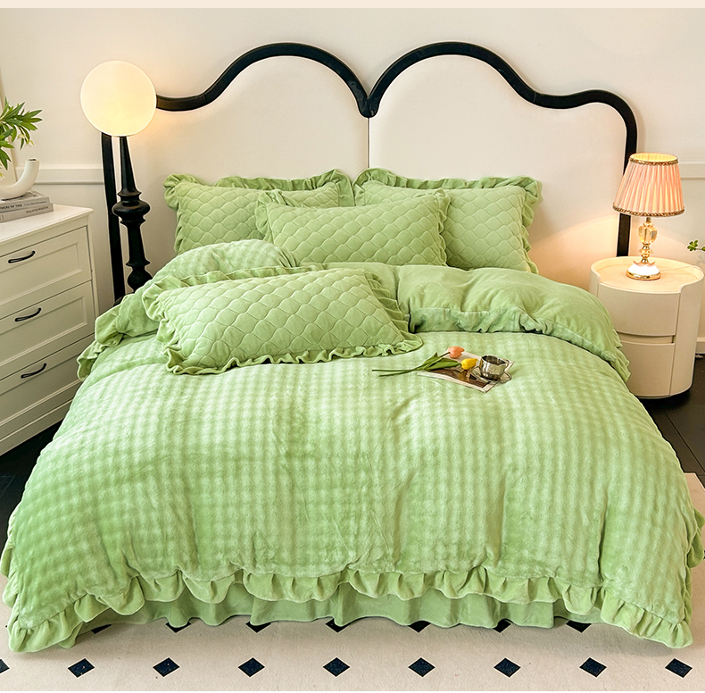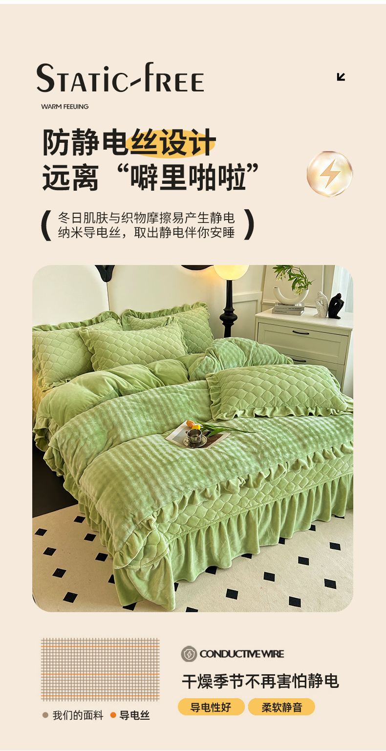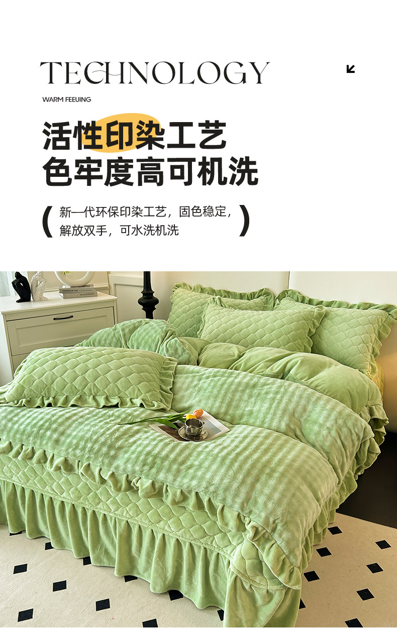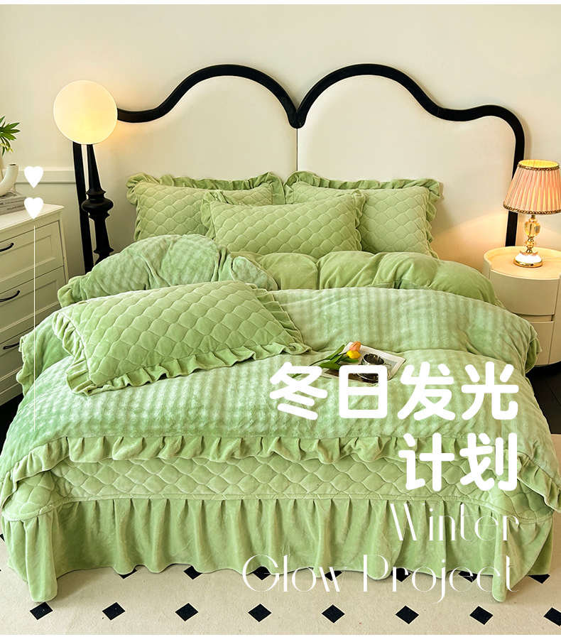 (总)屹成家纺2025新款水晶绒夹棉绗缝床裙四件套(塞纳河畔)四件套起售价不低于230元,大红,豆沙,翡翠绿,粉玉,橄榄绿,蔚蓝,银灰