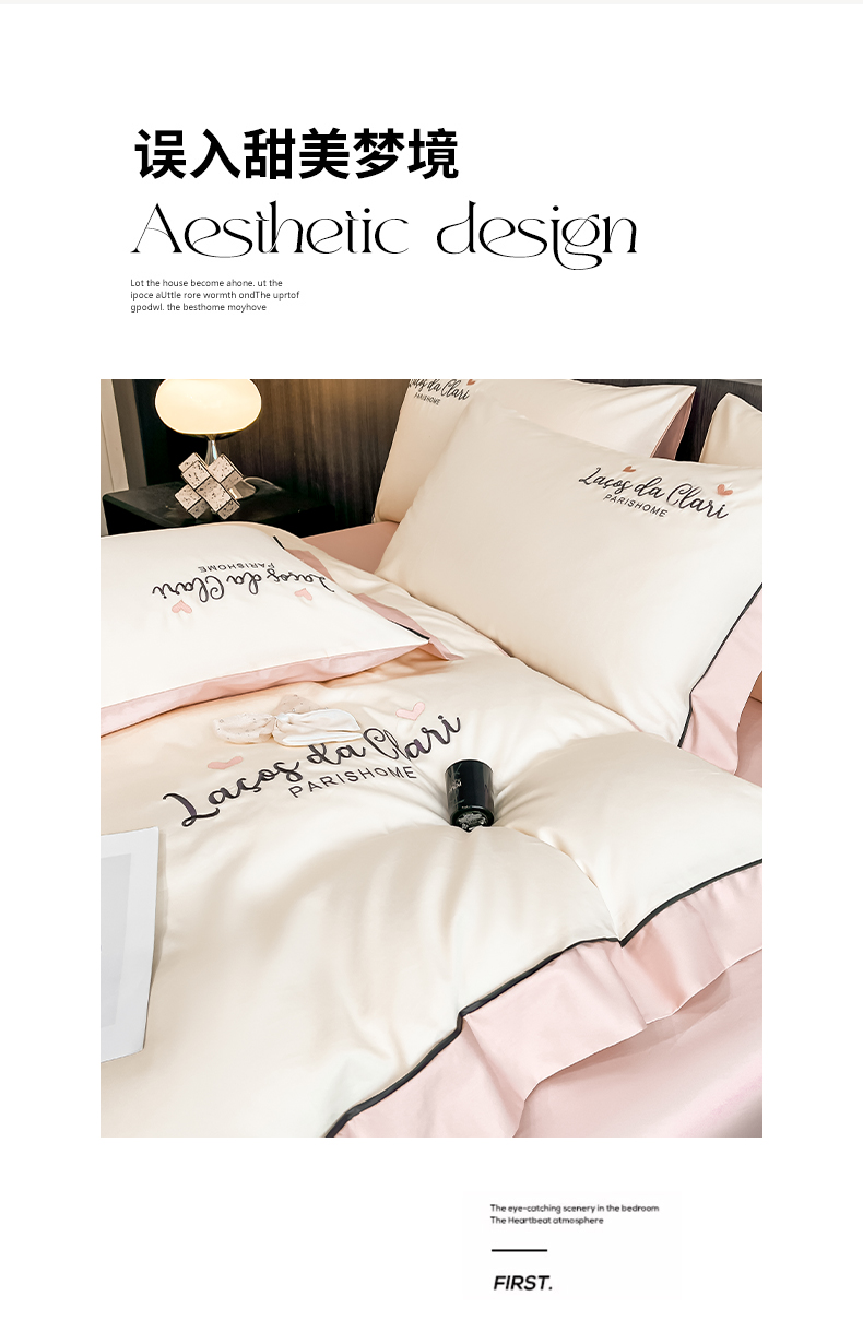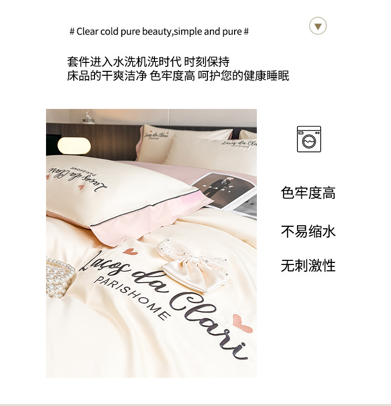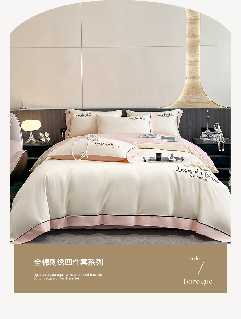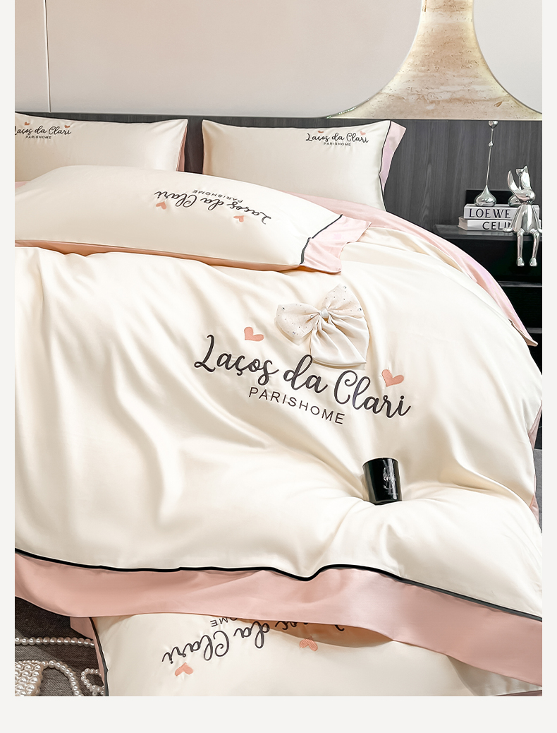 商品名称:娜娜 2024新款全棉时尚刺绣AB版双拼宽边绣花四件套--蝴蝶结系列 蝴蝶結-奶昔白+粉