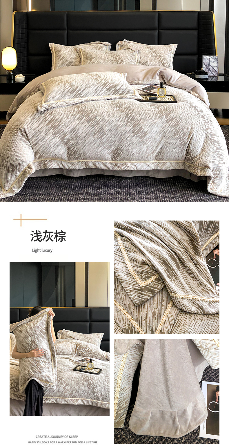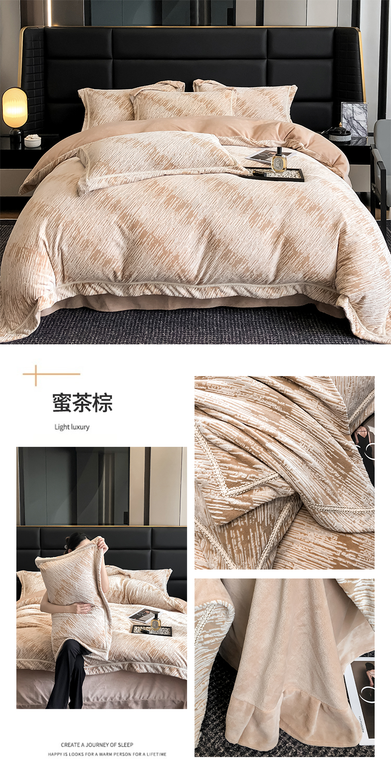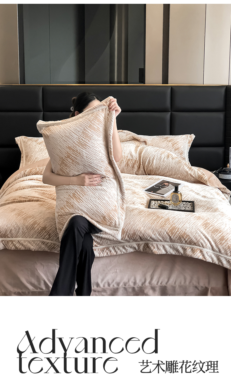 (总)金喜 2024新款高克重全消光牛奶绒雕花绒轻奢风四件套加厚双面牛奶绒四件套-星川鎏金梦系列,蜜茶棕,清水绿,桃花粉,浅灰棕