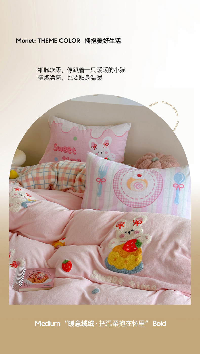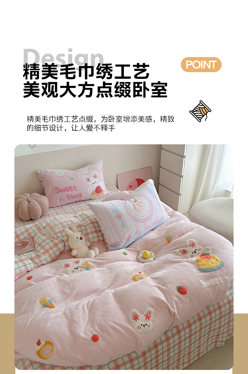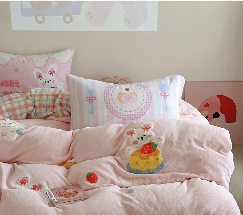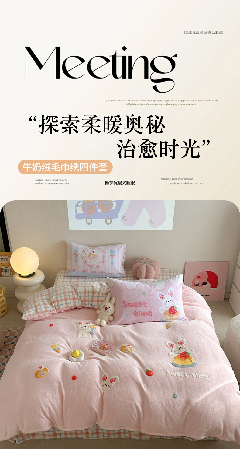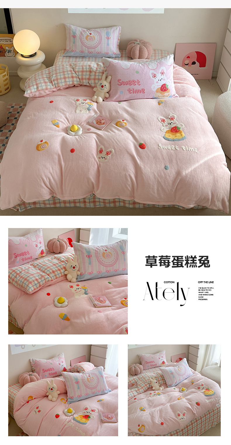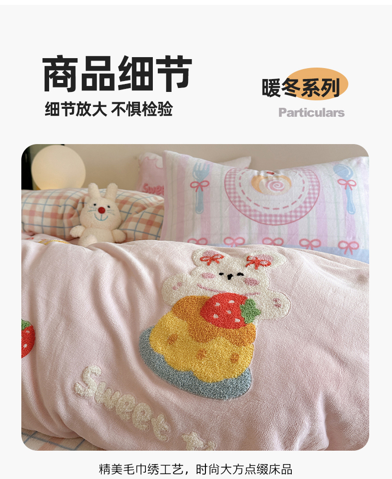 眠屿家纺 2024新款牛奶绒毛巾绣四件套 牛奶绒草莓蛋糕兔