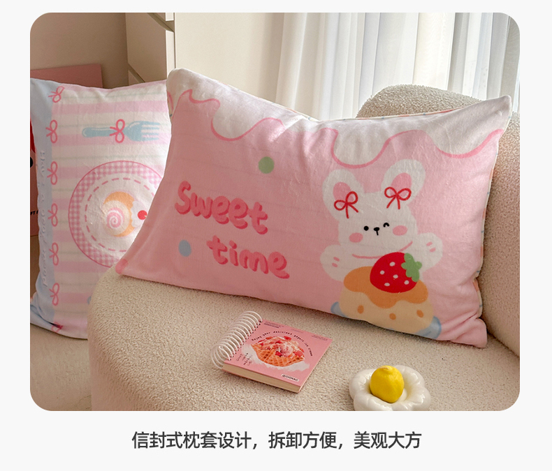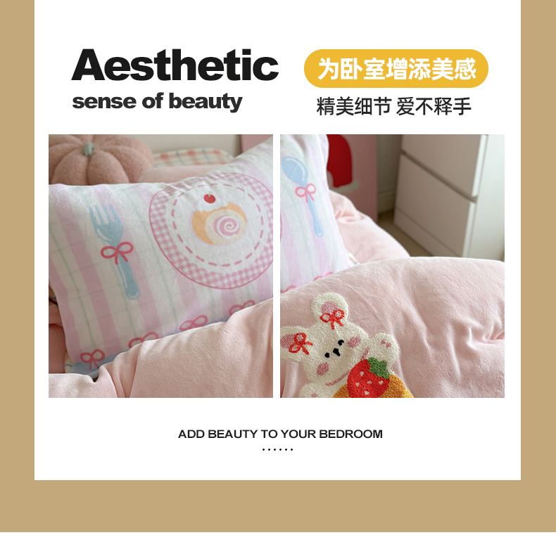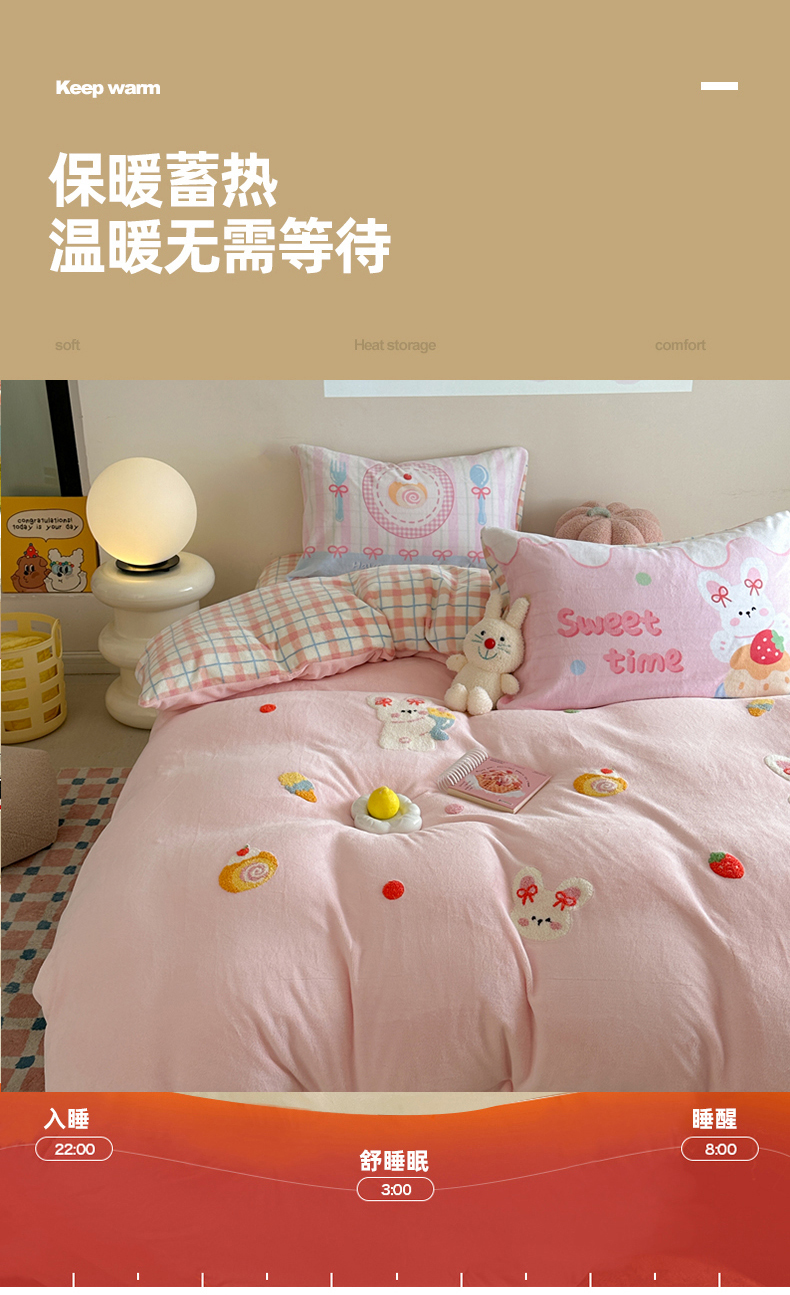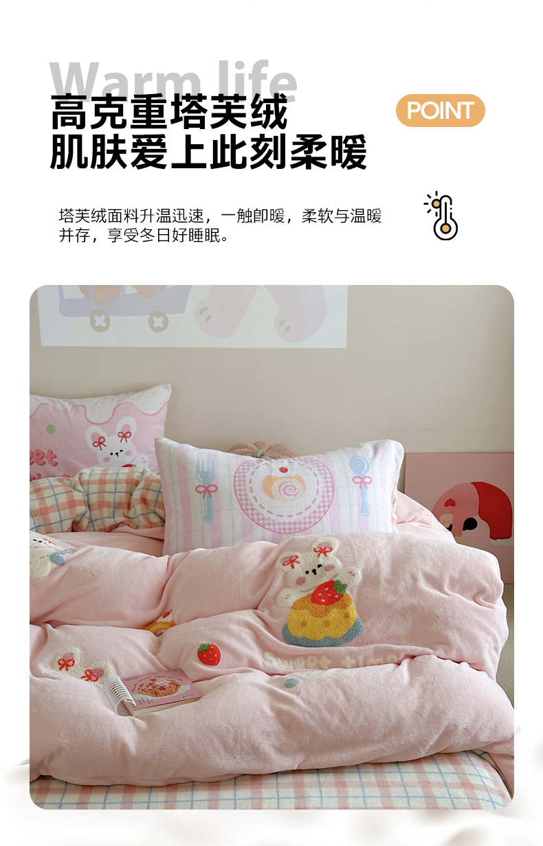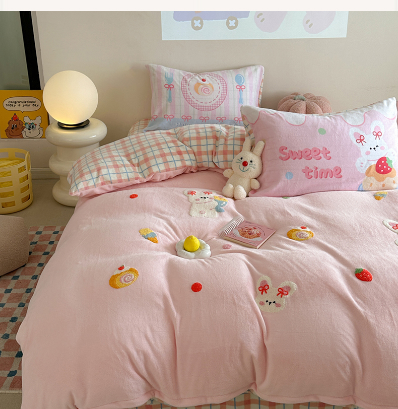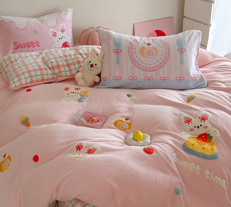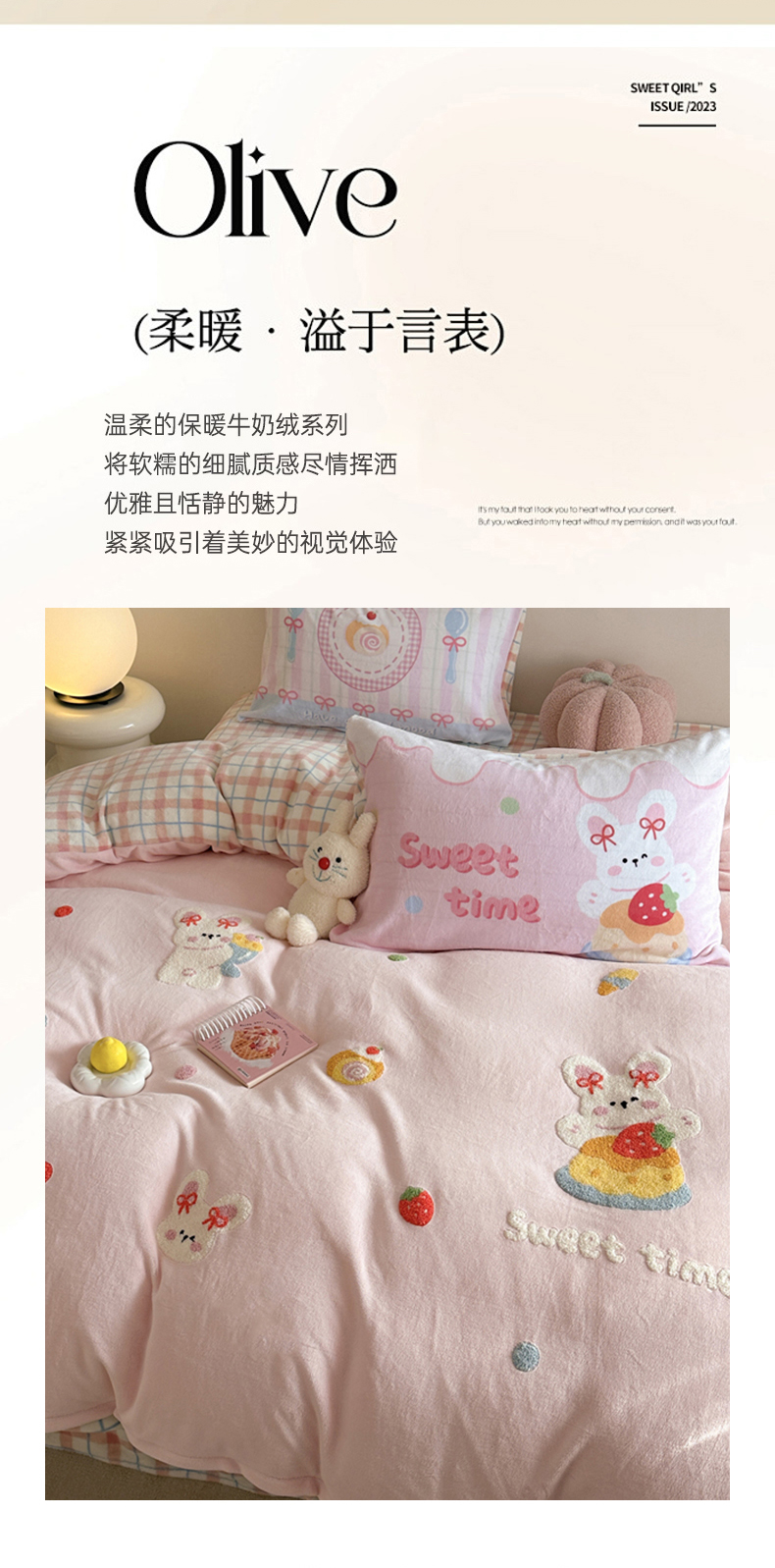 眠屿家纺 2024新款牛奶绒毛巾绣四件套 牛奶绒草莓蛋糕兔