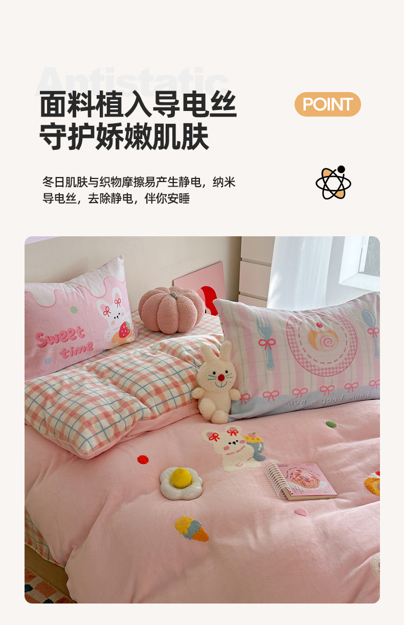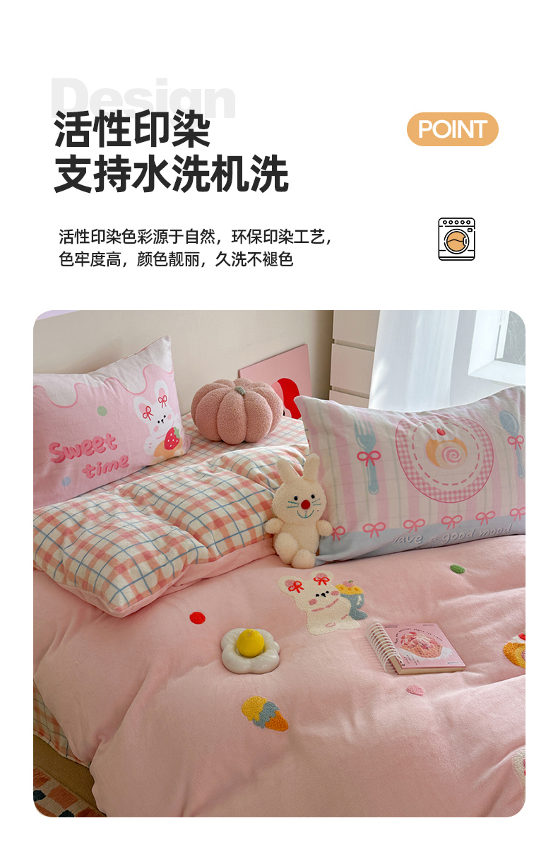 商品名称:眠屿家纺 2024新款牛奶绒毛巾绣四件套 牛奶绒草莓蛋糕兔