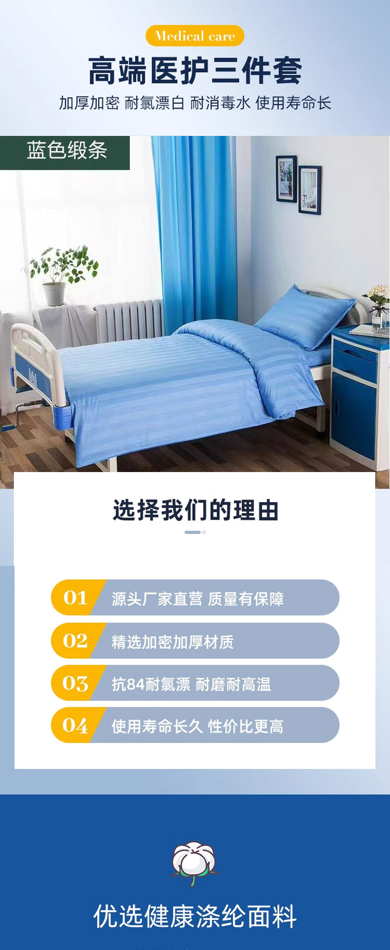医院用品专用医用诊所床品卫生院养老院病床三件套医院床单医疗,涤棉兰色缎条,涤棉粉色缎条,涤棉蓝绿缎条,涤棉白色缎条