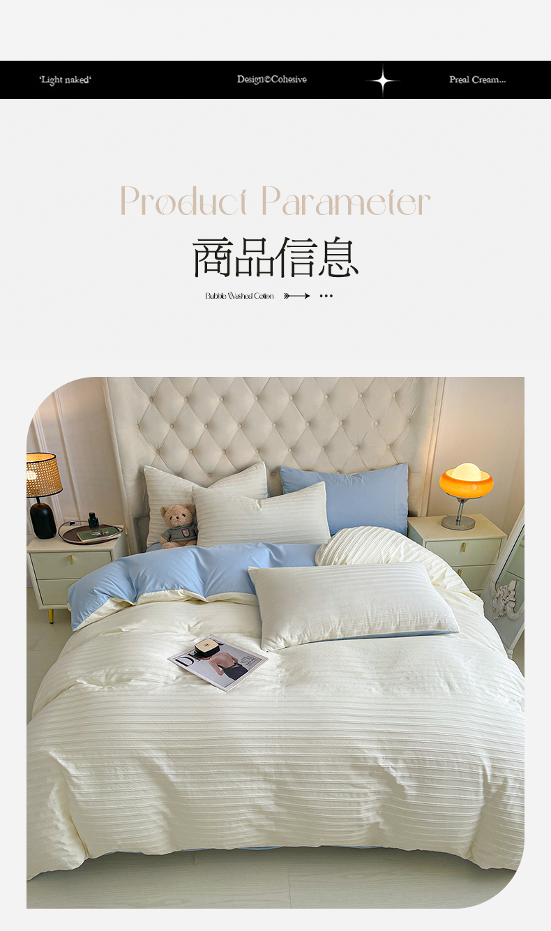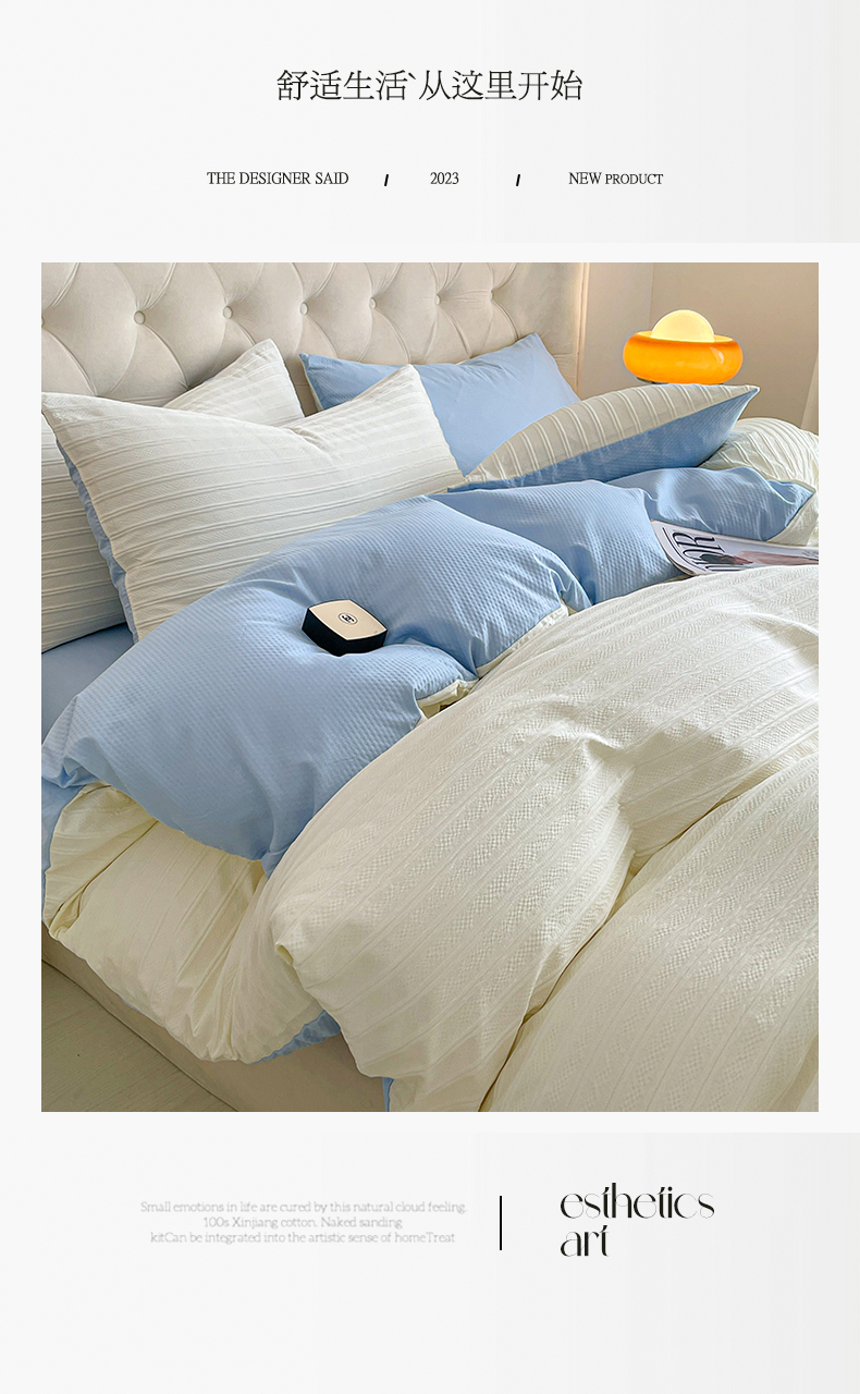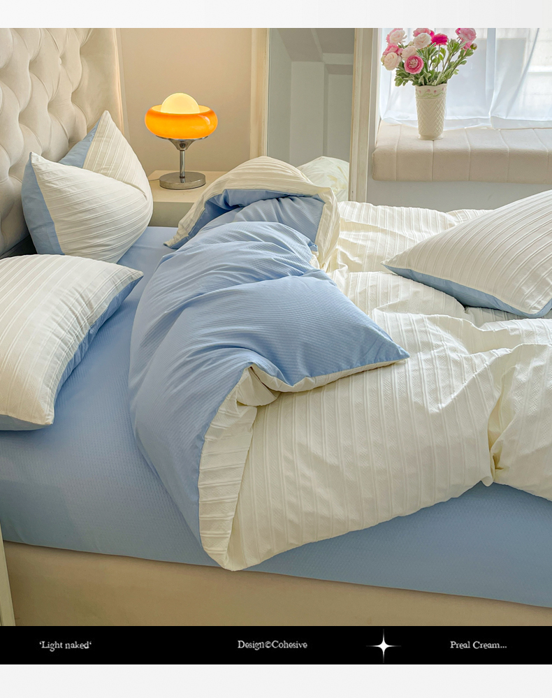 当前位置: 91家纺网 > 商品网购 > 床品套件 > 四件套 > 其它四件套 > 新款色织提花立体床上用品四件套轻奢时尚 提花立体条纹奶白浅兰
