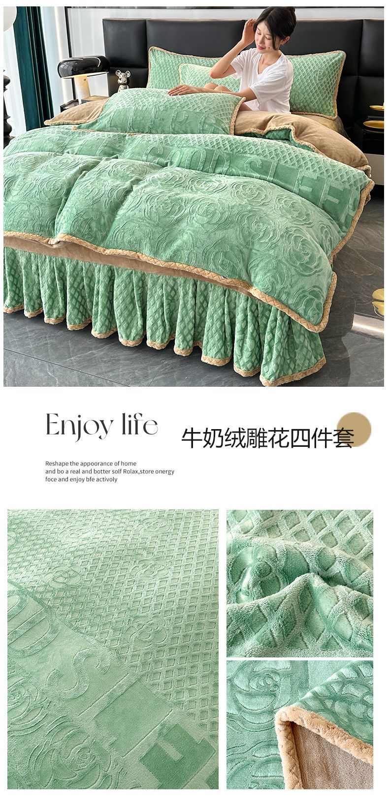 商品名称:(买家秀爆款不断货)A类母婴级8D牛奶雕花绒四件套珊瑚绒四件套雪花绒四件套花卉雕花牛奶绒四件套北欧风 挚爱-翡翠绿
