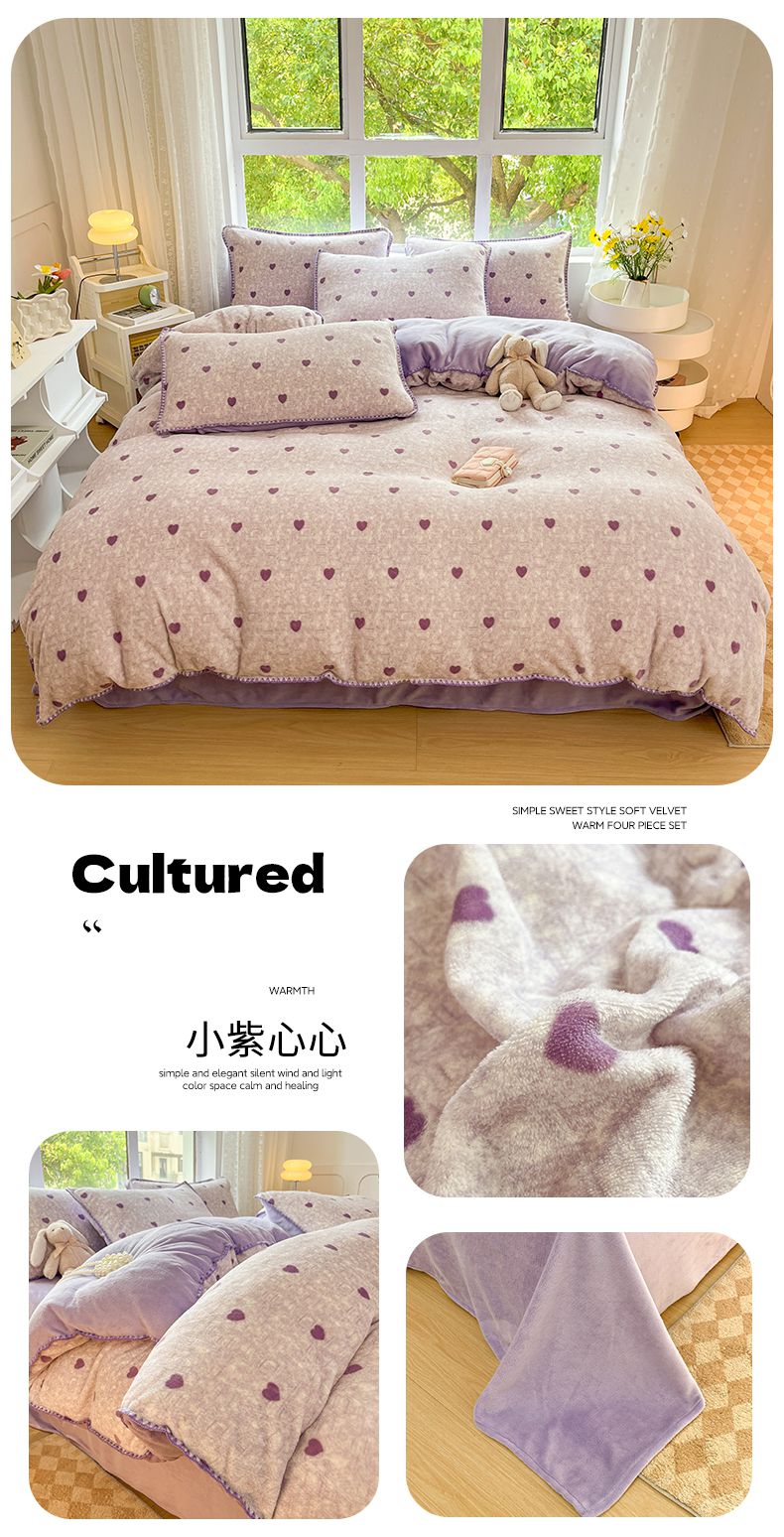 当前位置: 91家纺网 > 商品网购 > 床品套件 > 四件套 > 牛奶绒四件套 > (买家秀 爆款不断货)A类母婴级双面牛奶绒四件套三角针珊瑚绒雪花绒四件套高克重卡通牛奶绒四件套花卉 小紫心心