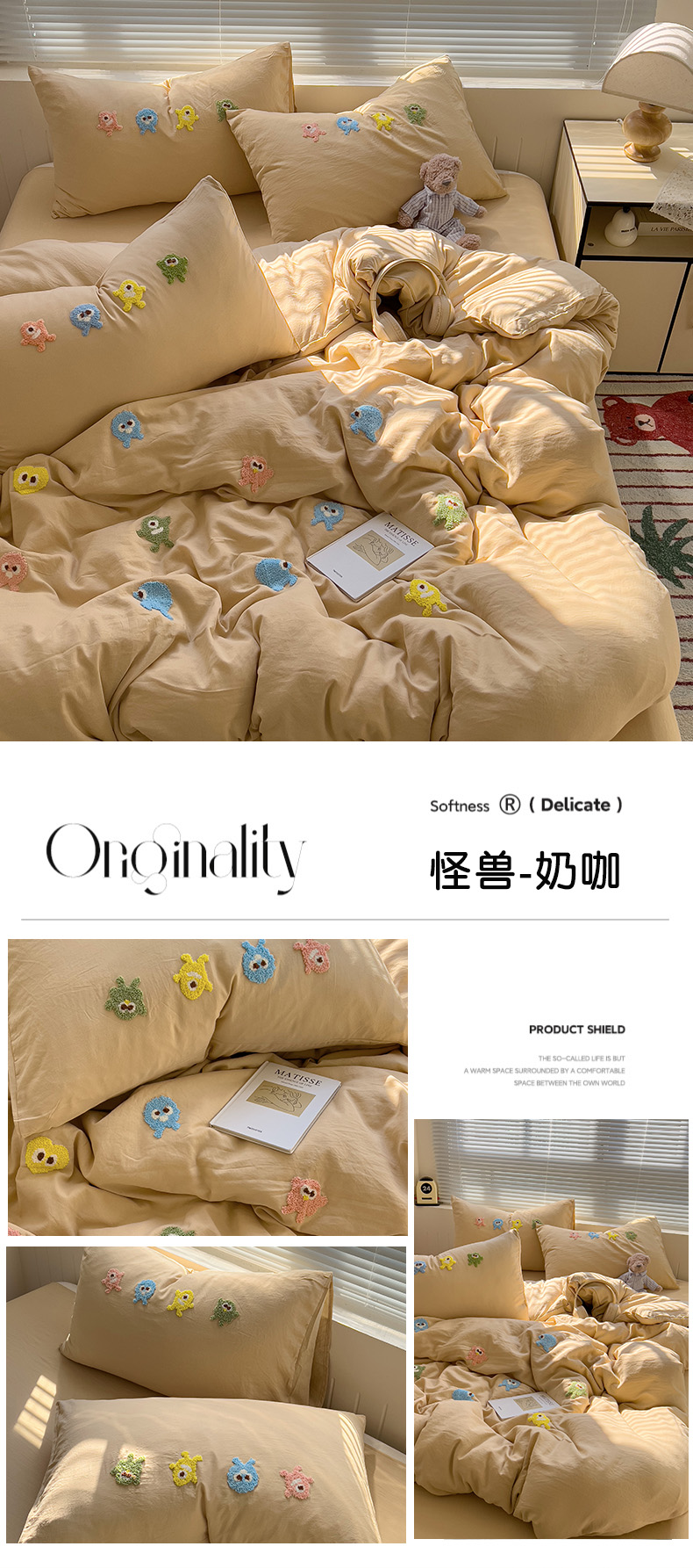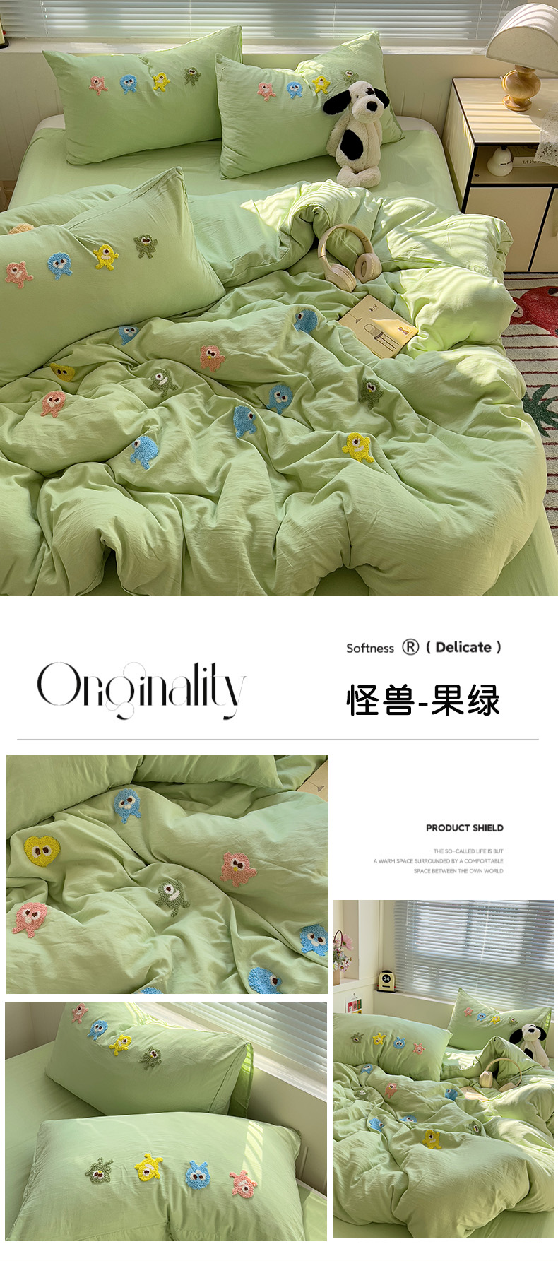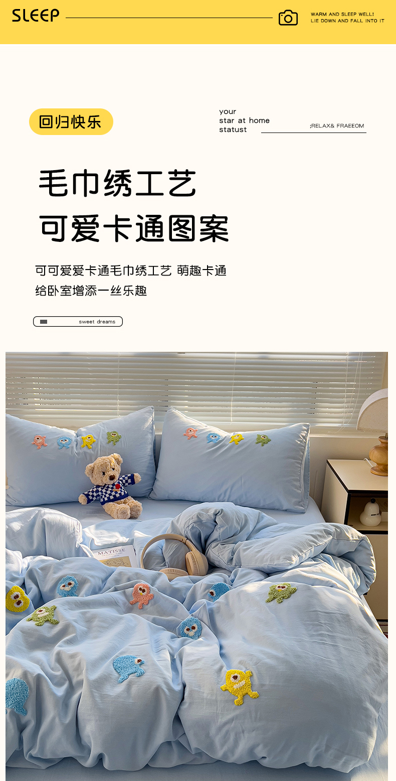 商品名称:(总)悦织湾家纺 2025春秋新款超柔水洗棉毛巾绣单被套四件套-怪兽