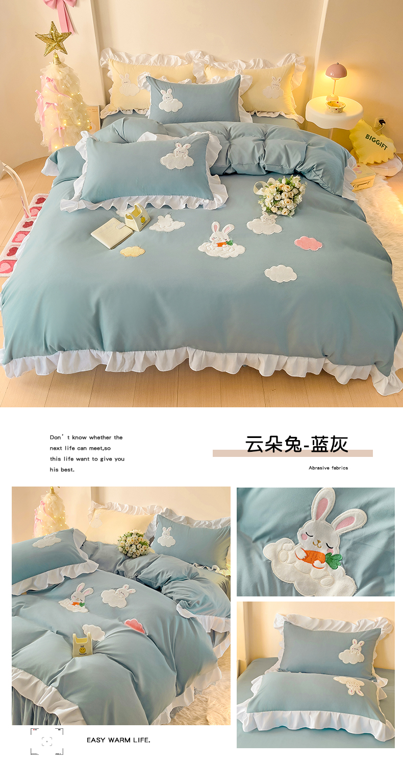 当前位置: 91家纺网 > 商品网购 > 床品套件 > 四件套 > 水洗棉四件套 > 慕语家纺 2025新款韩版水洗磨毛棉卡通贴布绣四件套-云朵兔 云朵兔-蓝灰