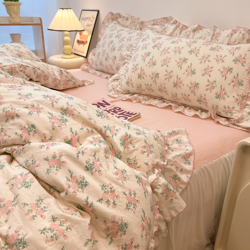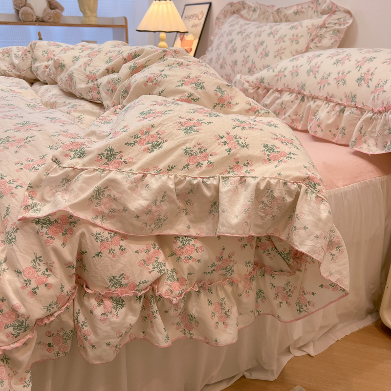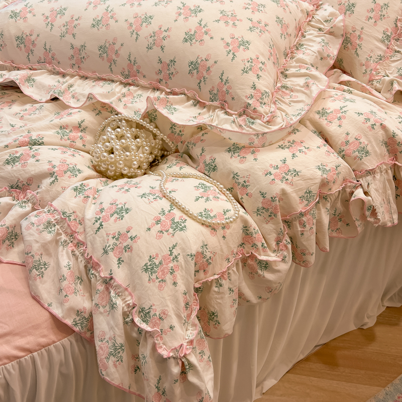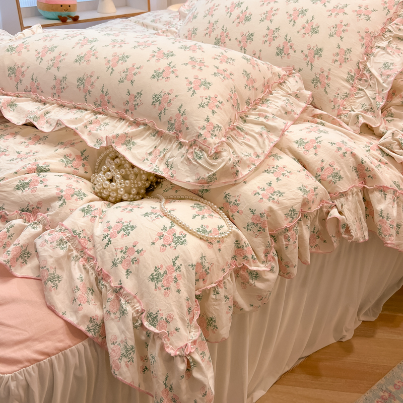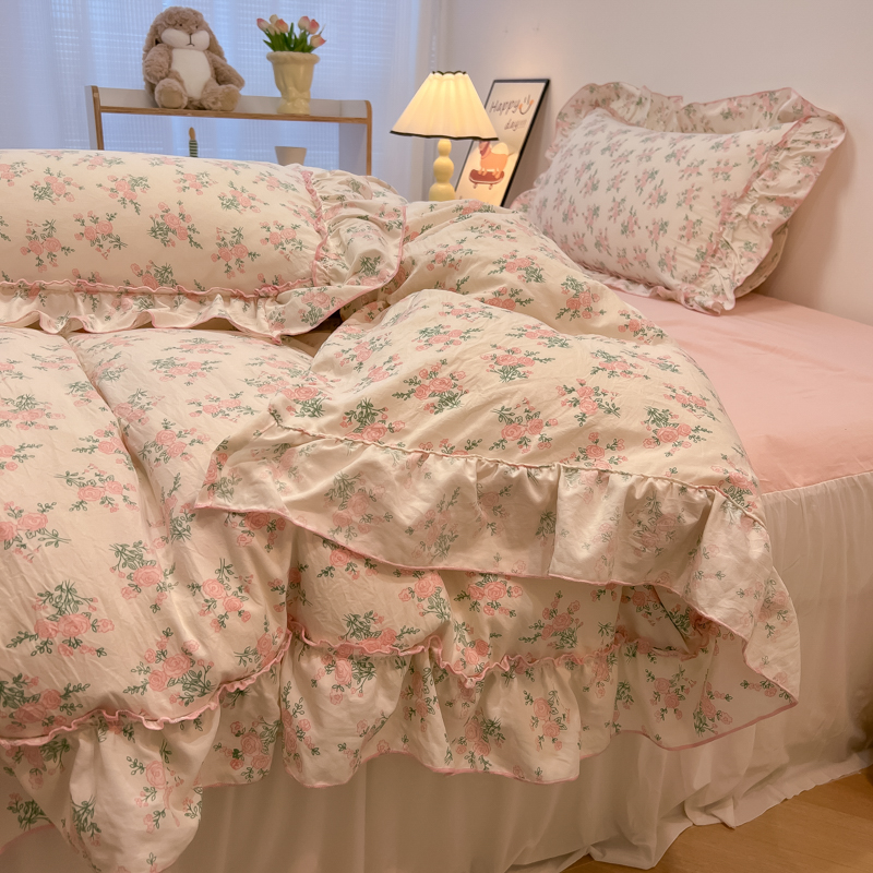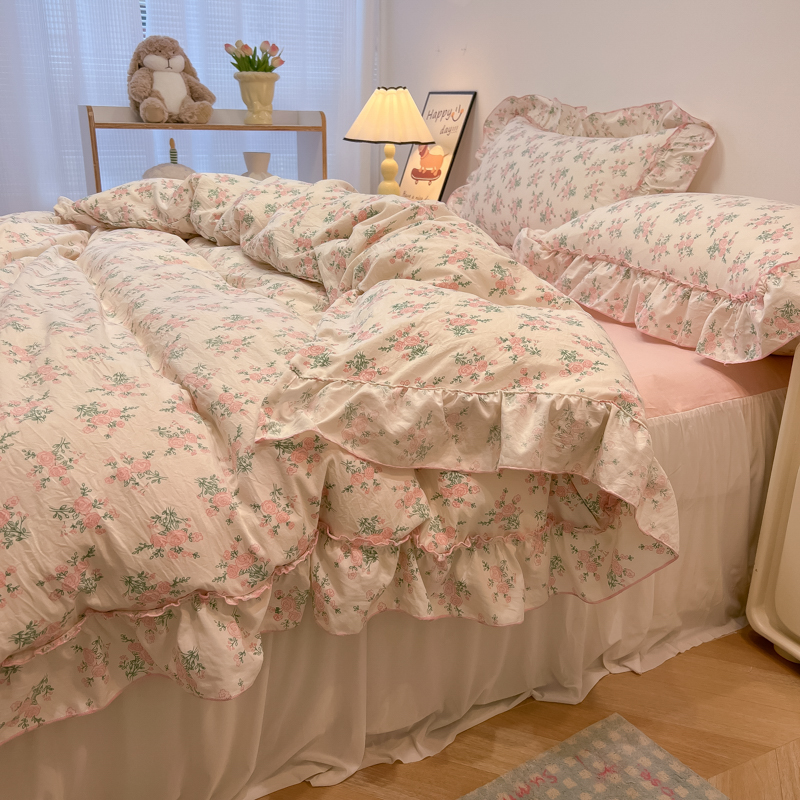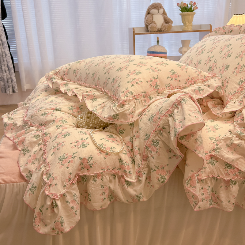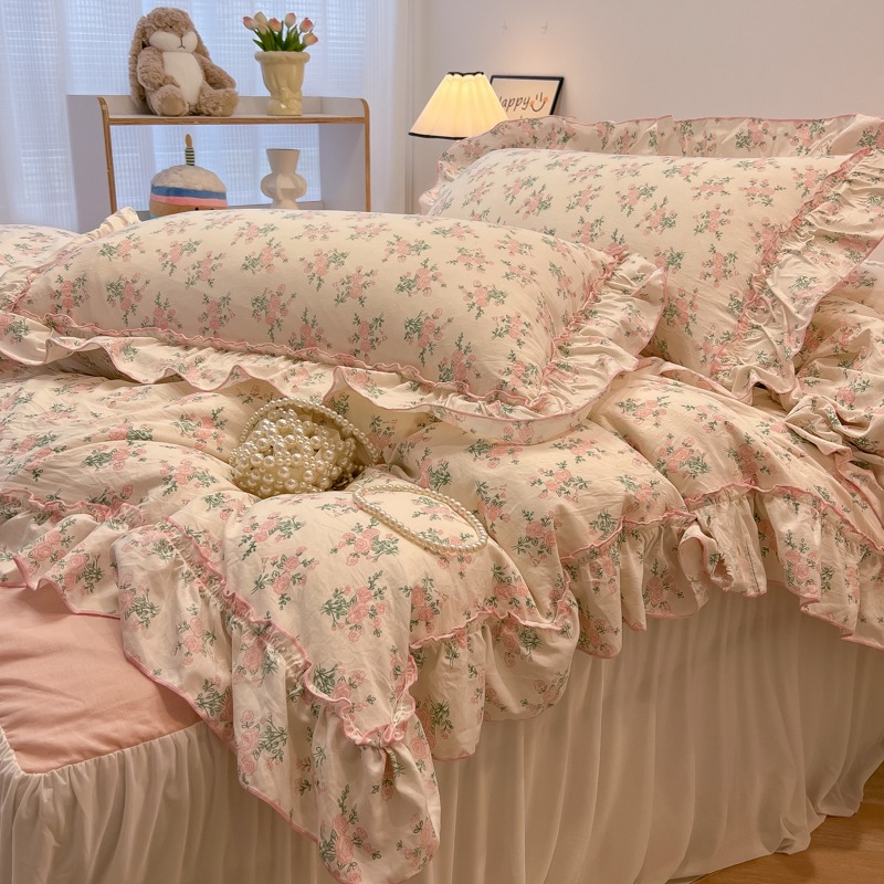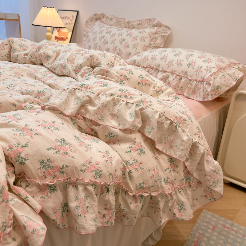 当前位置: 91家纺网 > 商品网购 > 床品套件 > 四件套 > 其它四件套 > 盼季家纺 2025新款公主风花边小清新水洗棉床上四件套床单被套床裙三件套-风格一 花团