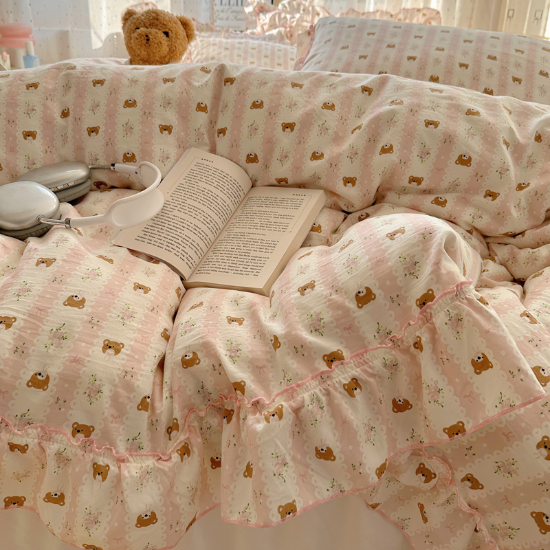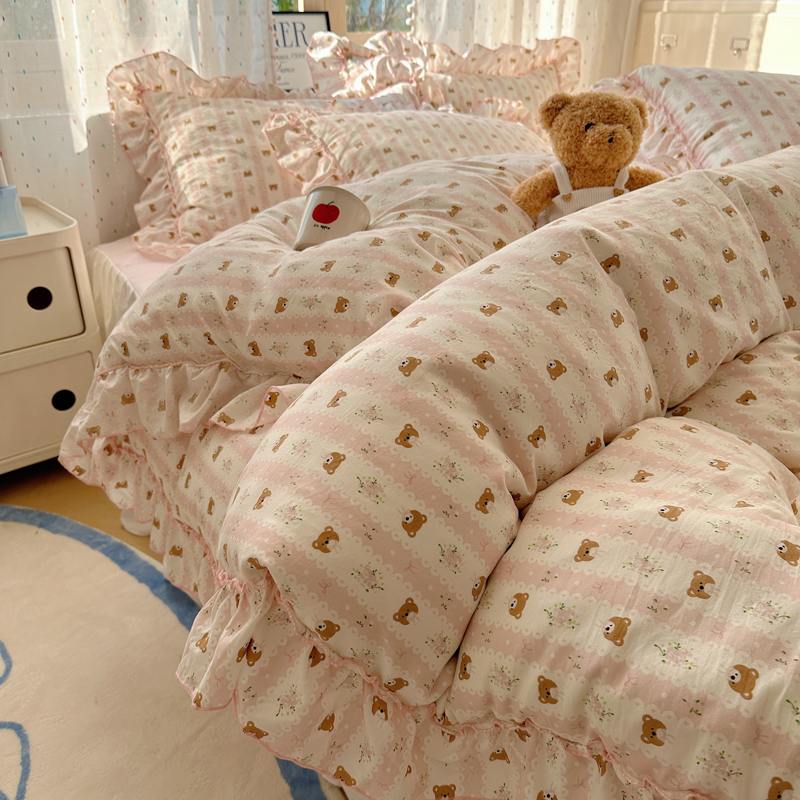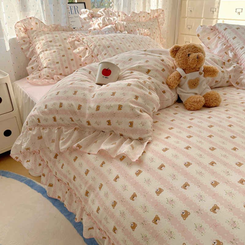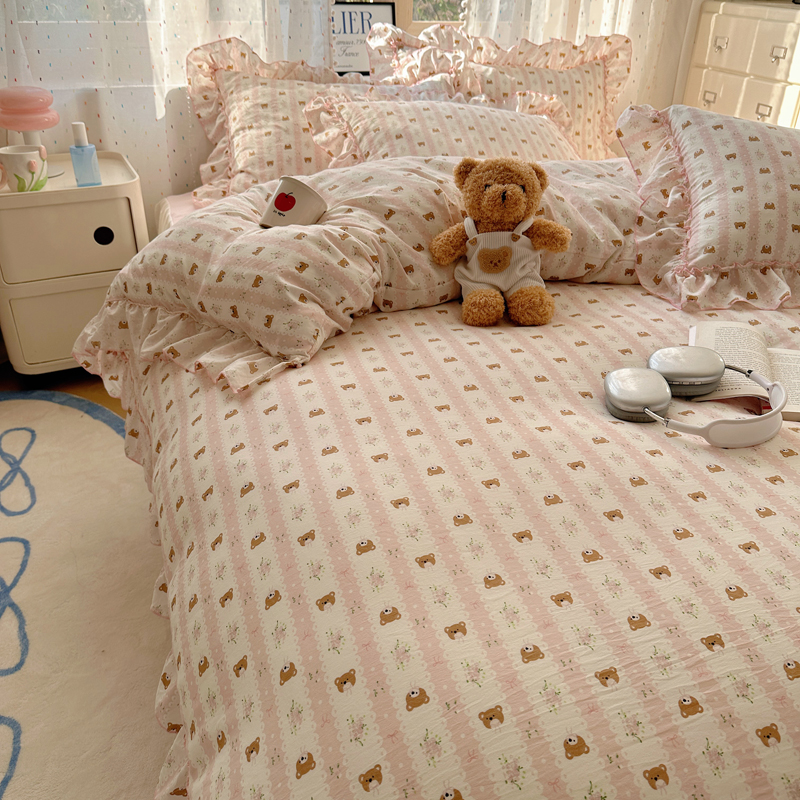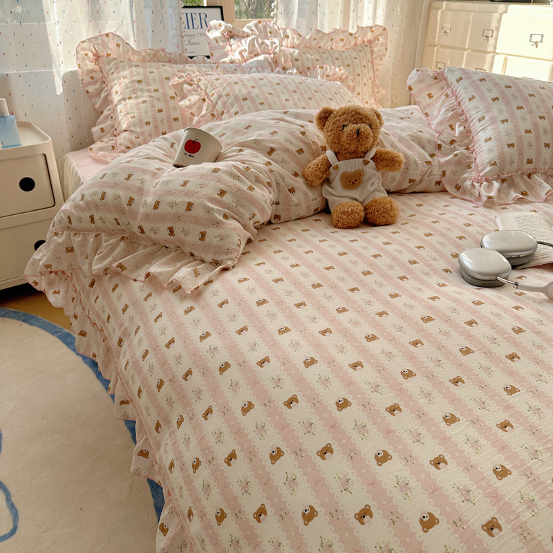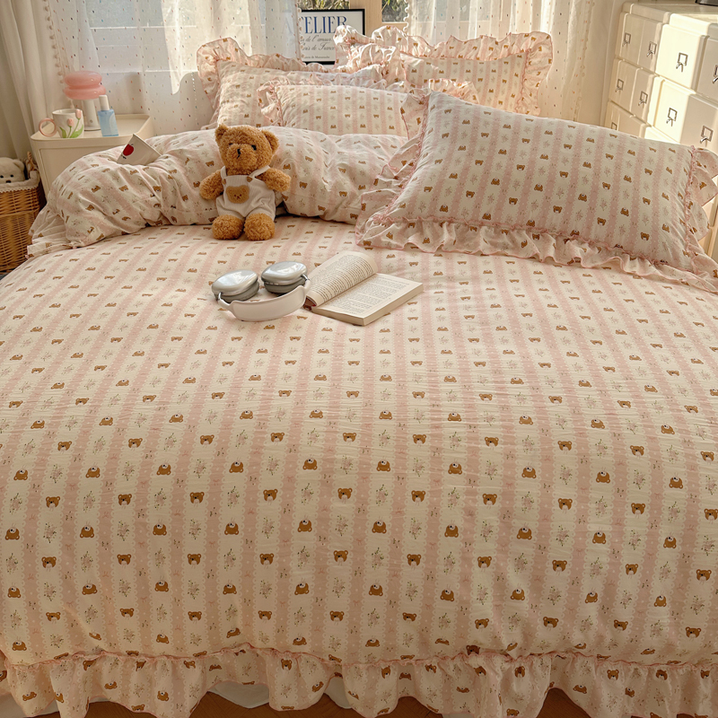 当前位置: 91家纺网 > 商品网购 > 床品套件 > 四件套 > 其它四件套 > 盼季家纺 2025新款公主风花边小清新水洗棉床上四件套床单被套床裙三件套-风格二 排排熊-粉