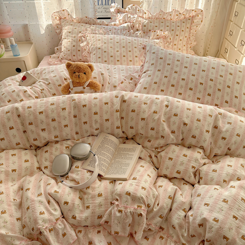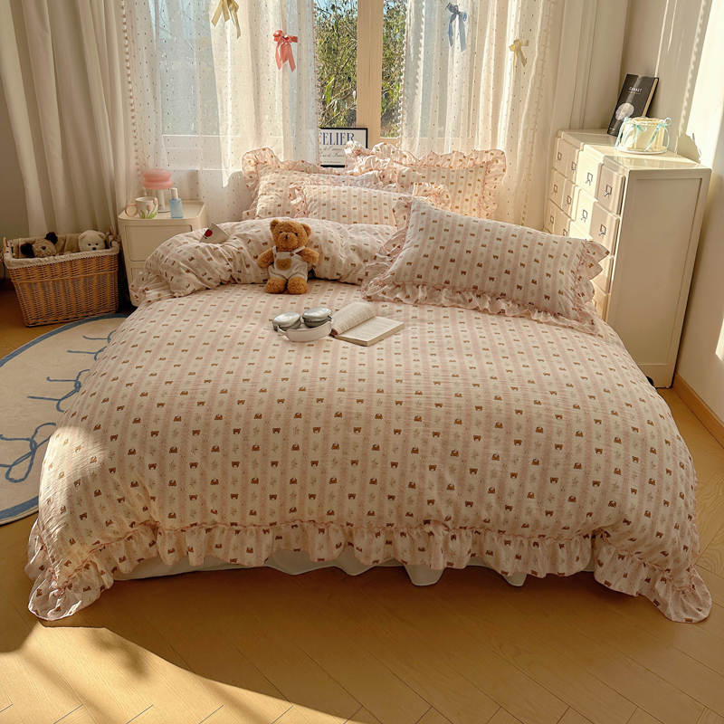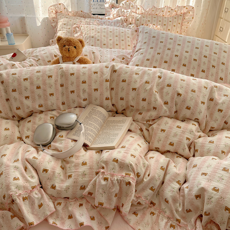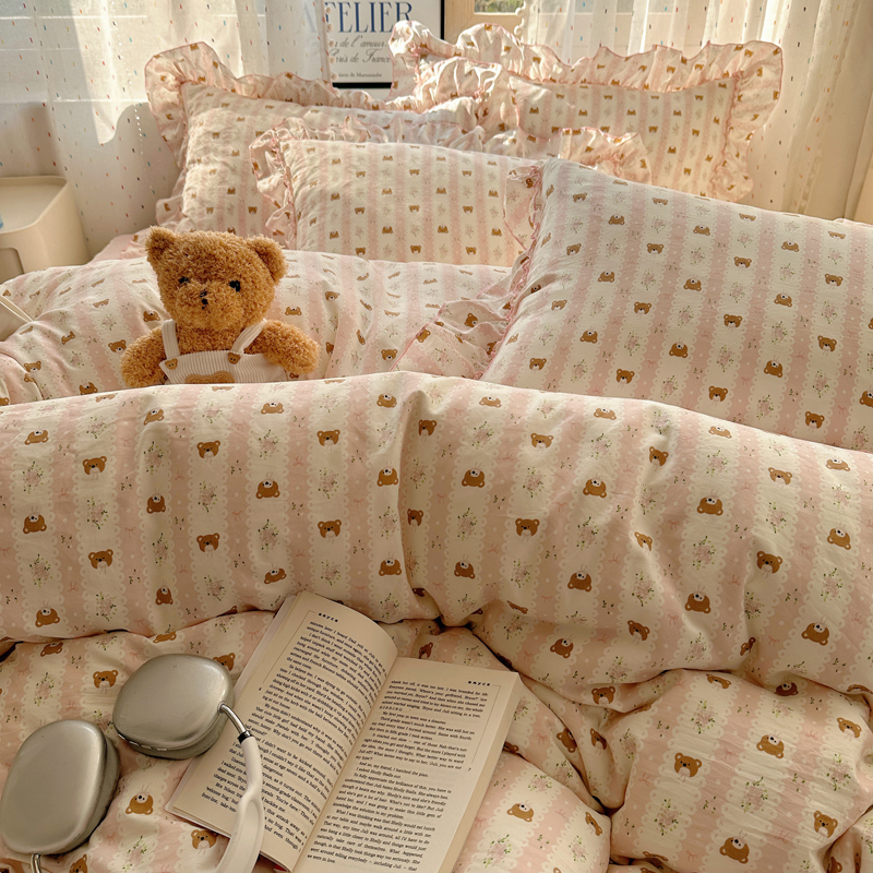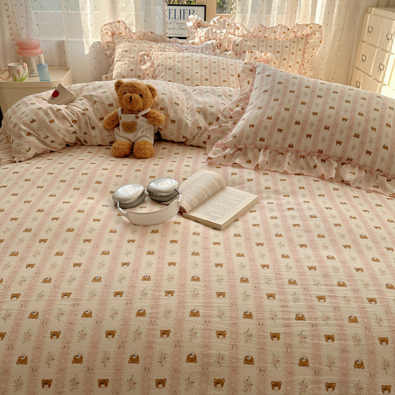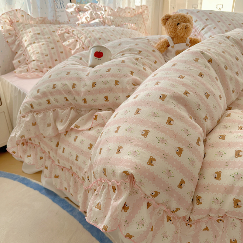 当前位置: 91家纺网 > 商品网购 > 床品套件 > 四件套 > 其它四件套 > 盼季家纺 2025新款公主风花边小清新水洗棉床上四件套床单被套床裙三件套-风格二 排排熊-粉