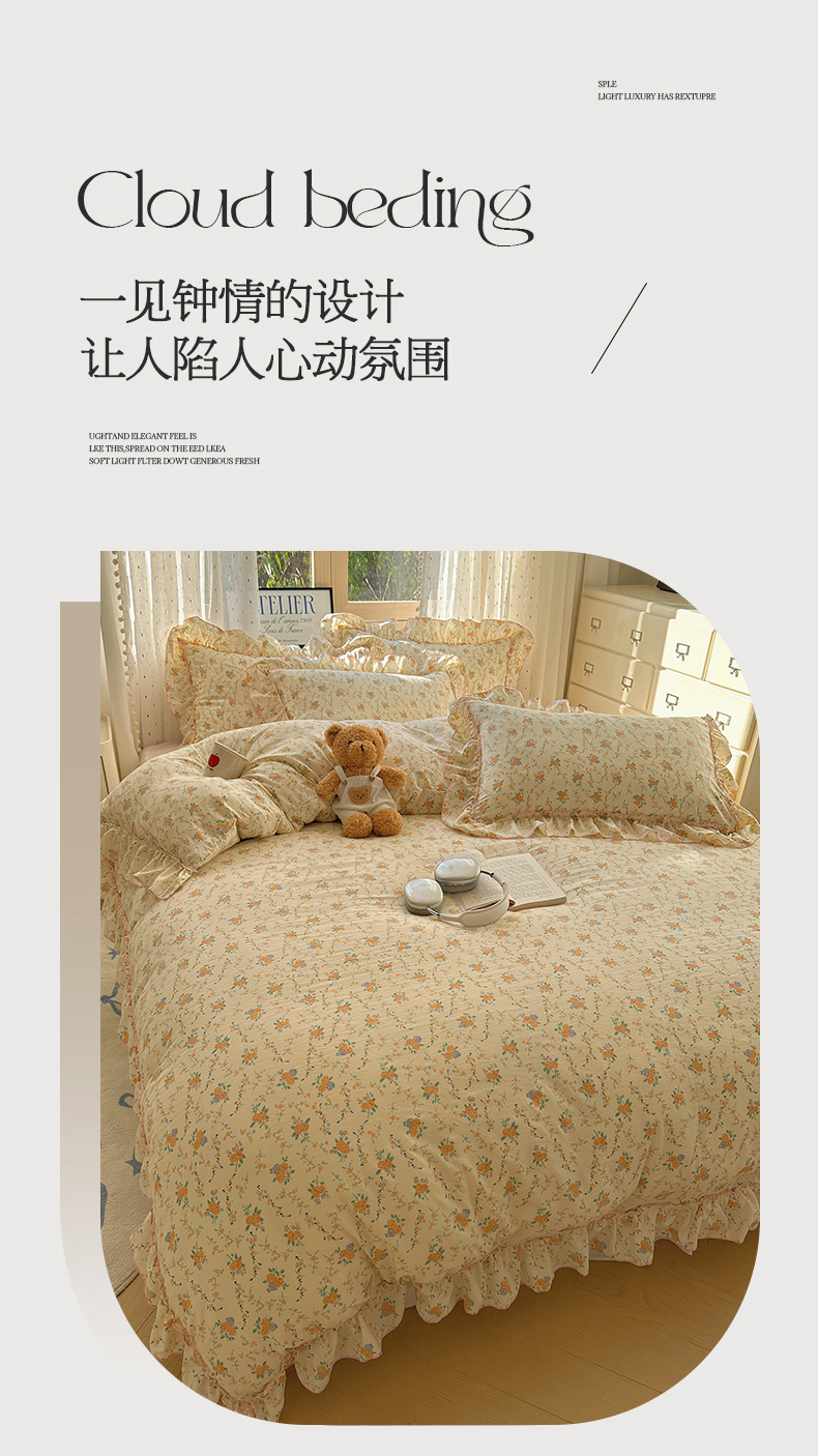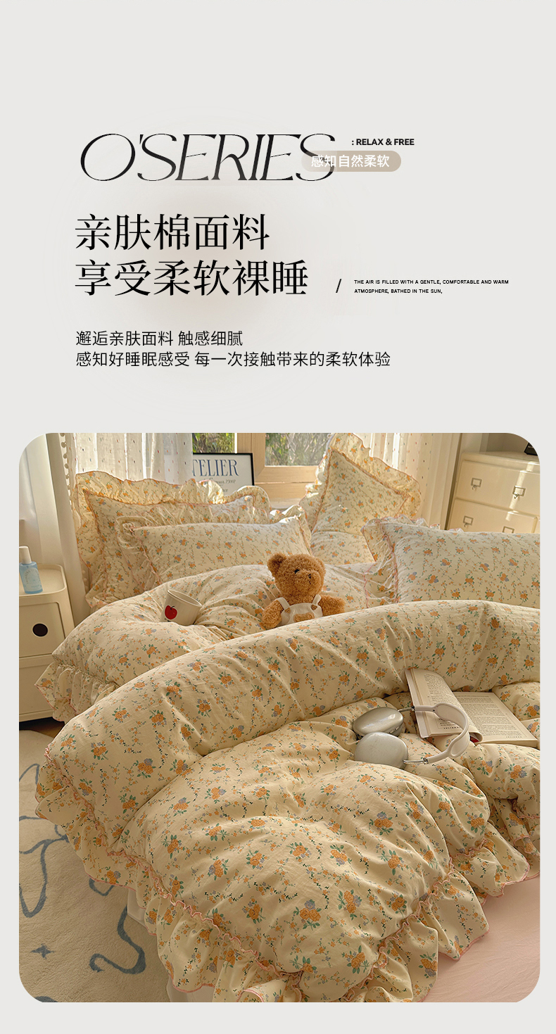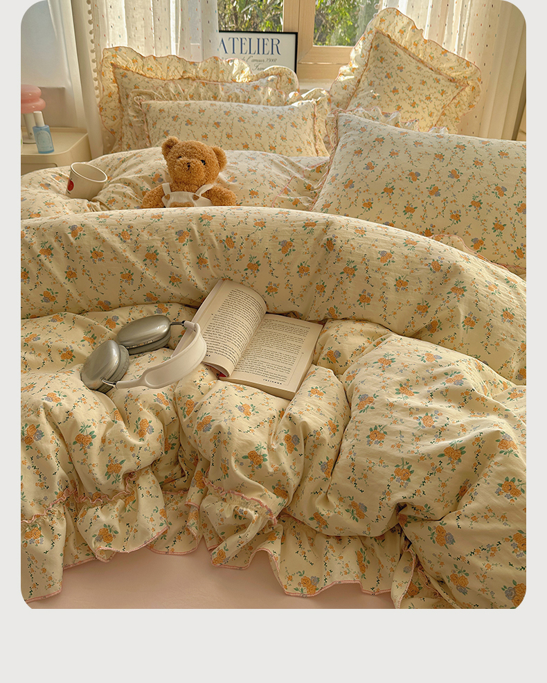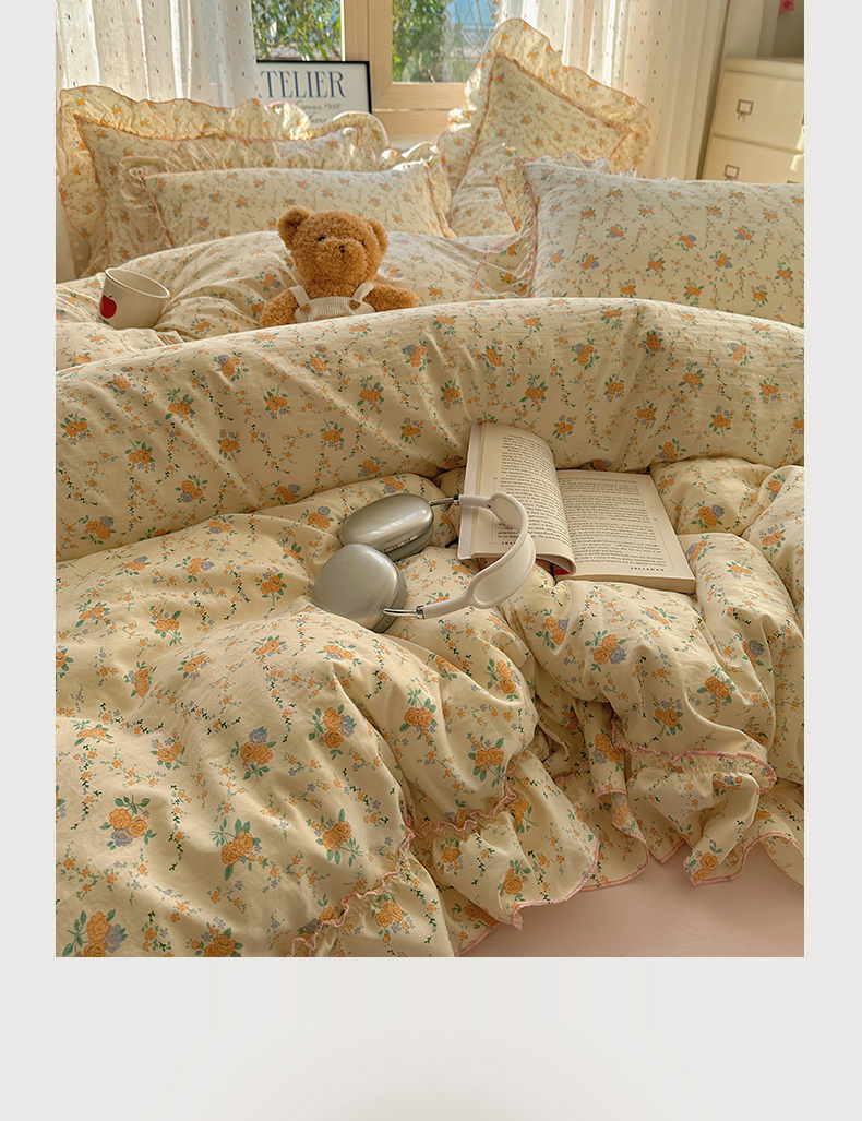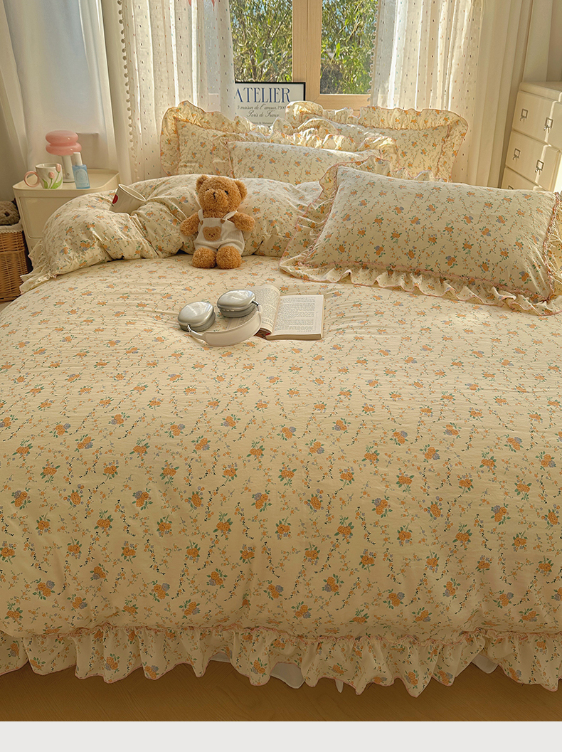 当前位置: 91家纺网 > 商品网购 > 床品套件 > 四件套 > 其它四件套 > 盼季家纺 2025新款公主风花边小清新水洗棉床上四件套床单被套床裙三件套-风格二 焦朵花