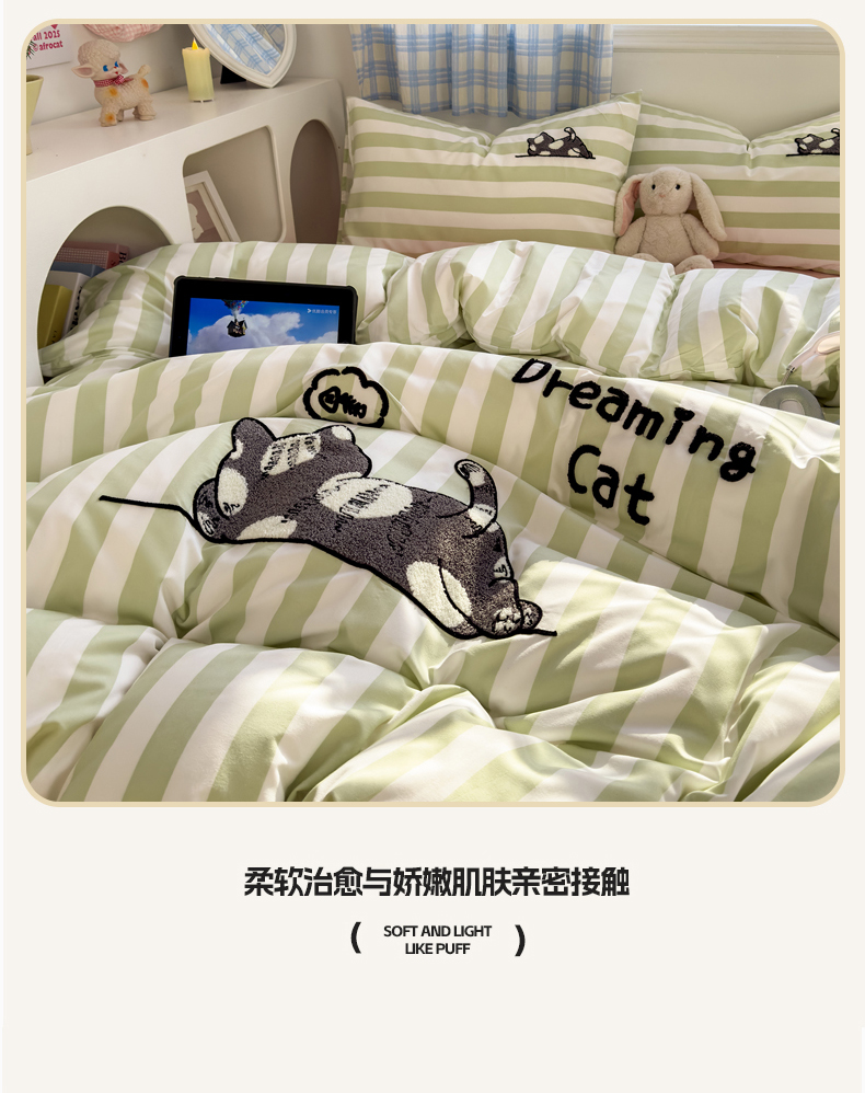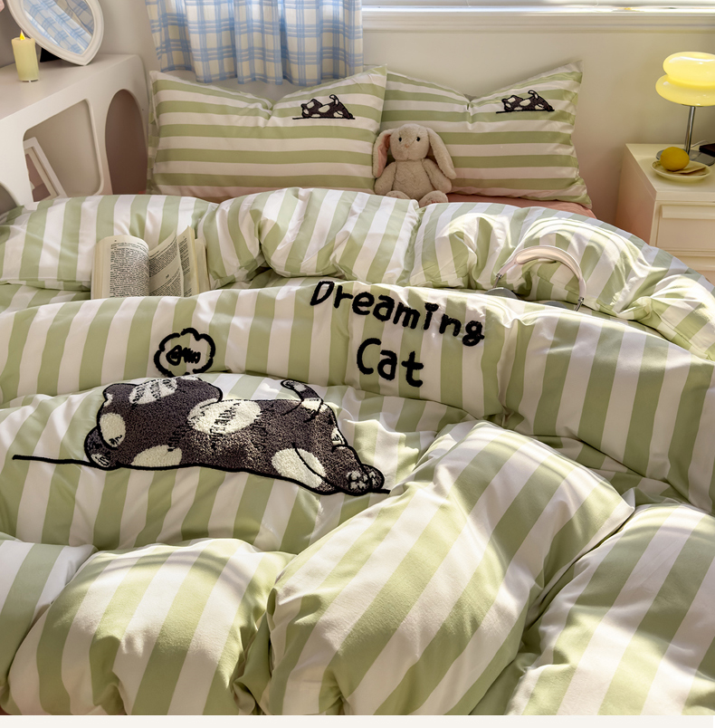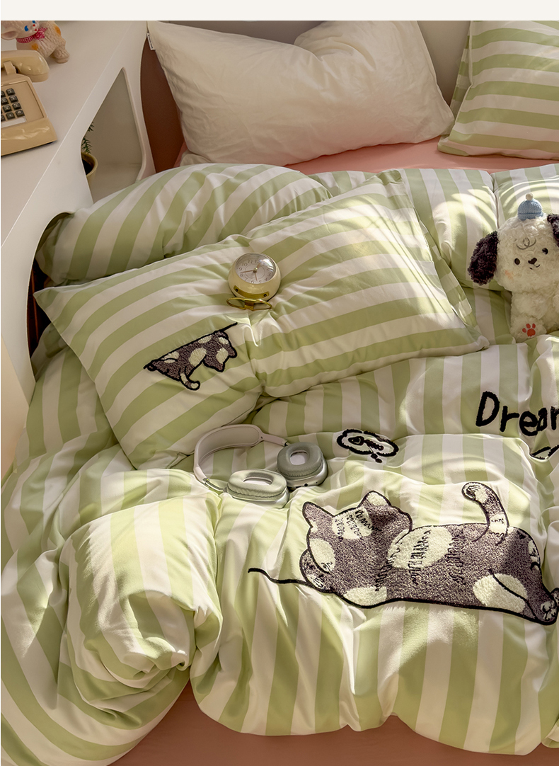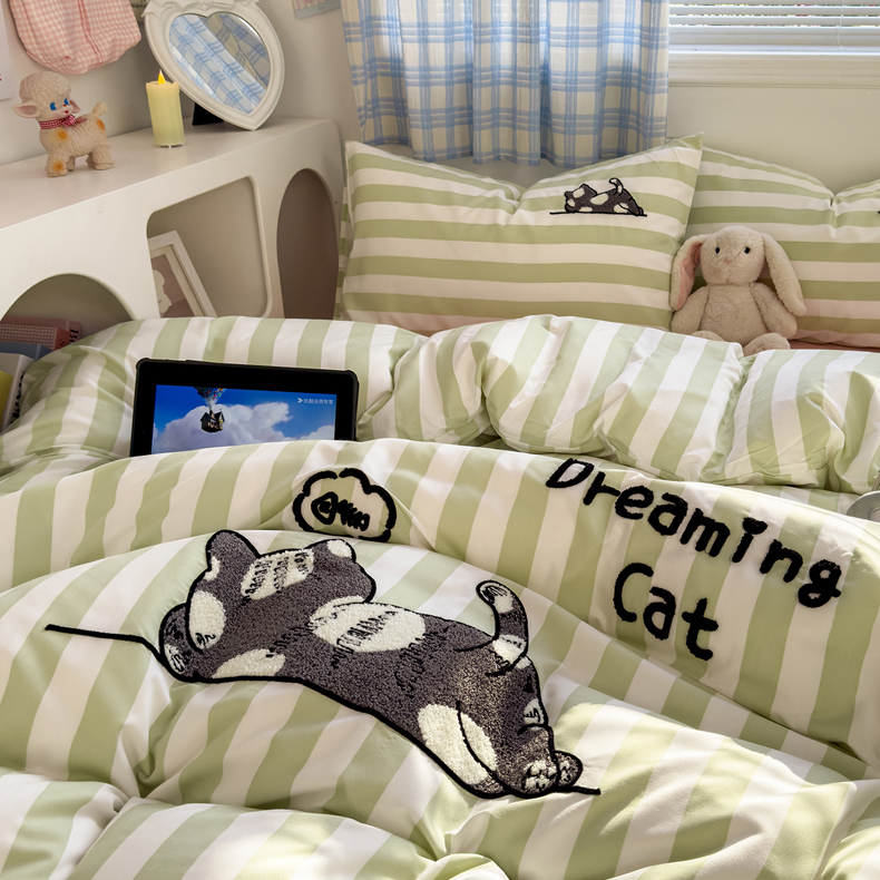 当前位置: 91家纺网 > 商品网购 > 床品套件 > 四件套 > 水洗棉四件套 > 优兰朵 2025新款亲肤卡通水洗棉毛巾绣学生床品四件套 黑猫-条纹绿
