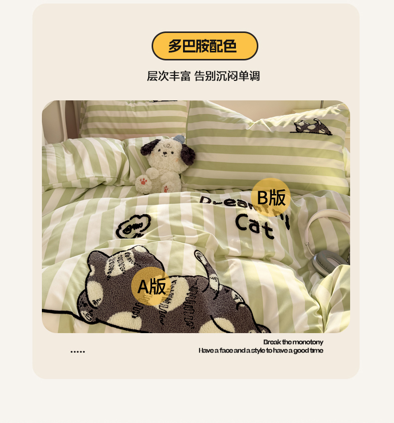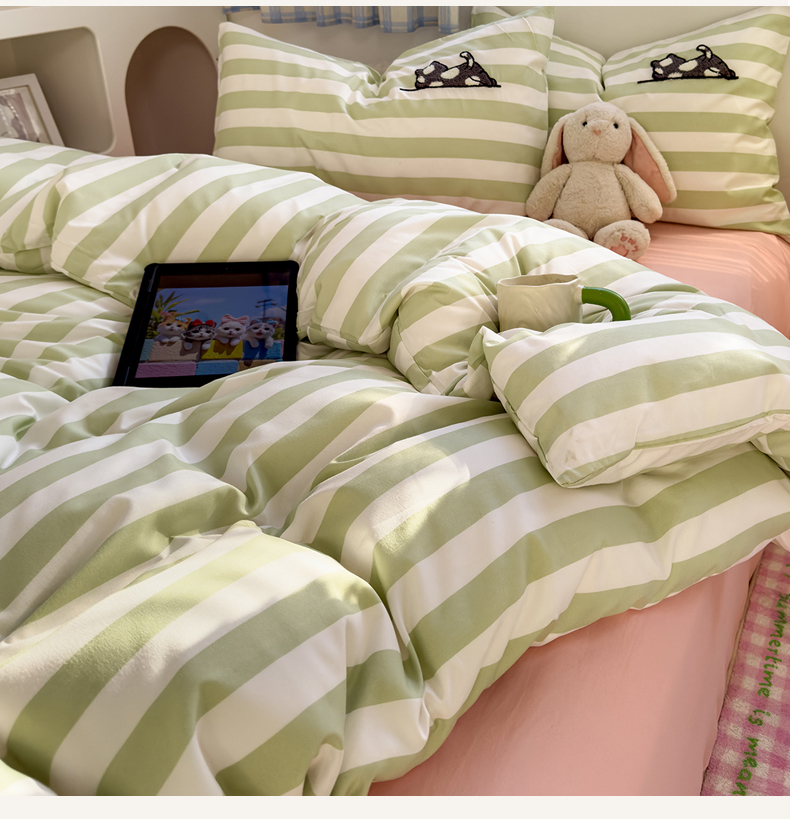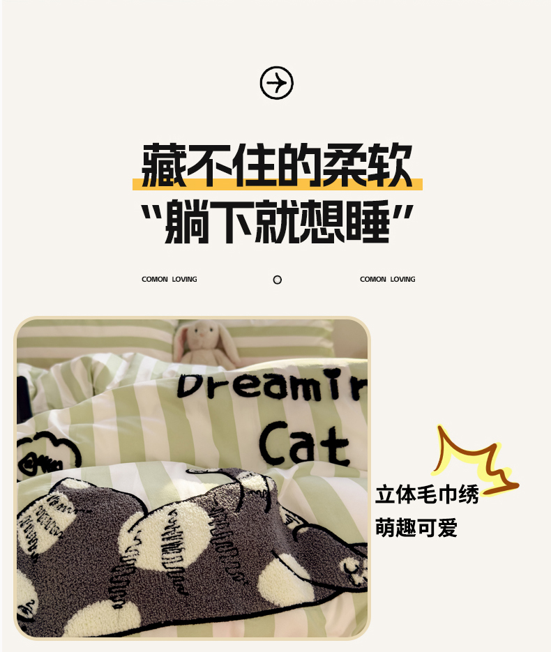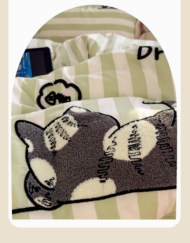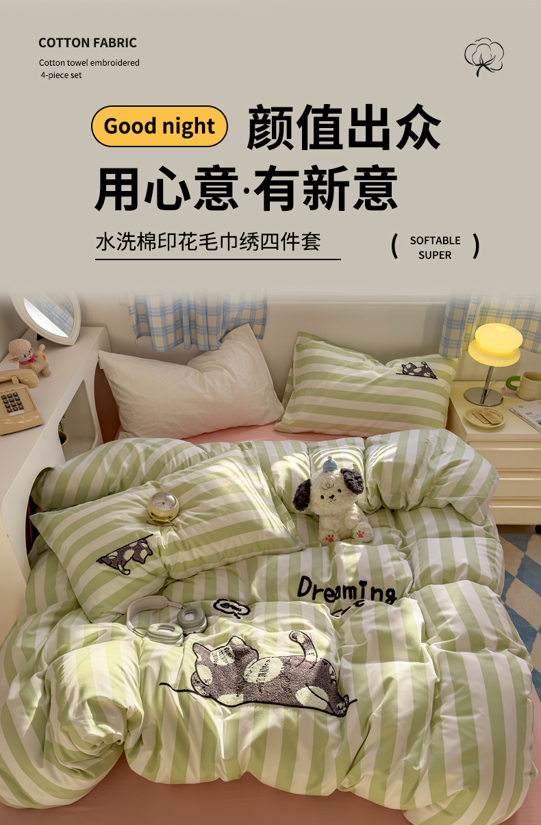 当前位置: 91家纺网 > 商品网购 > 床品套件 > 四件套 > 水洗棉四件套 > 优兰朵 2025新款亲肤卡通水洗棉毛巾绣学生床品四件套 黑猫-条纹绿