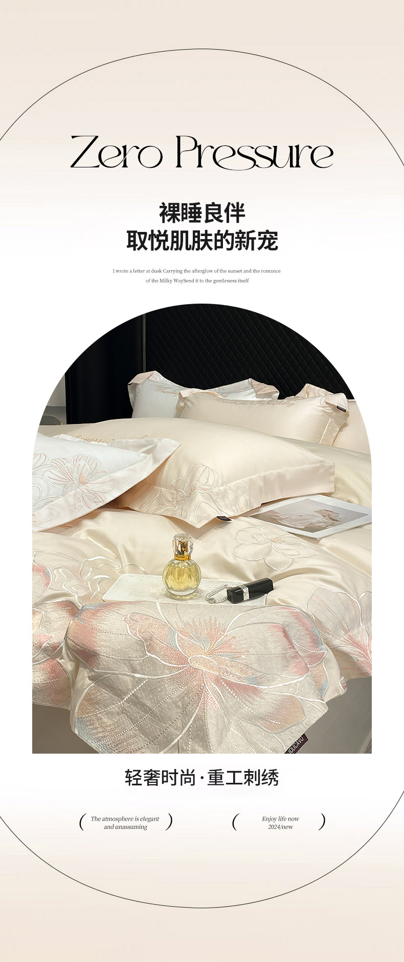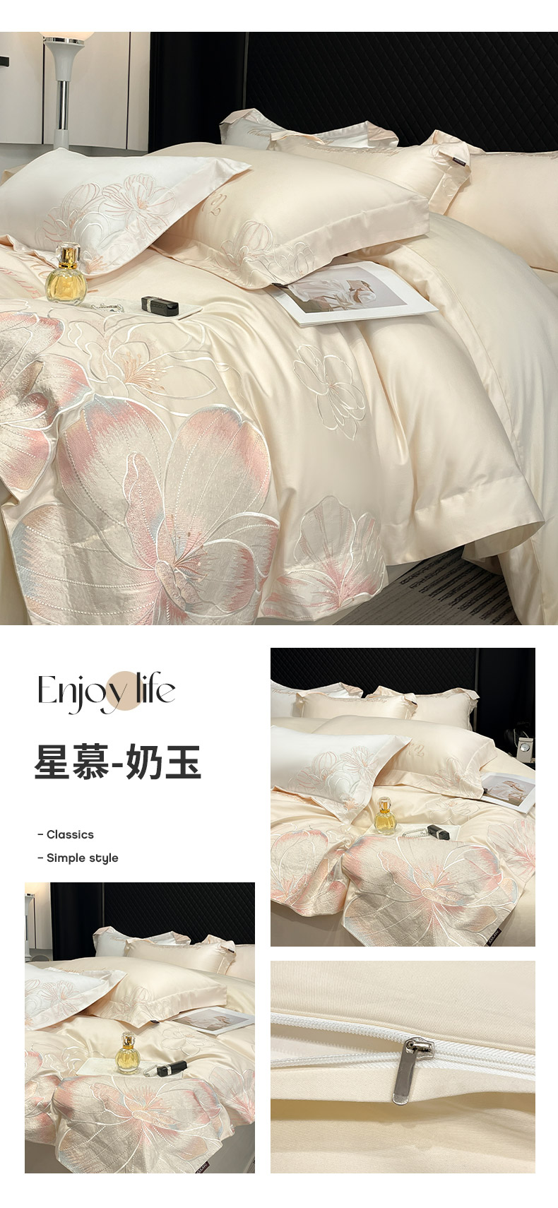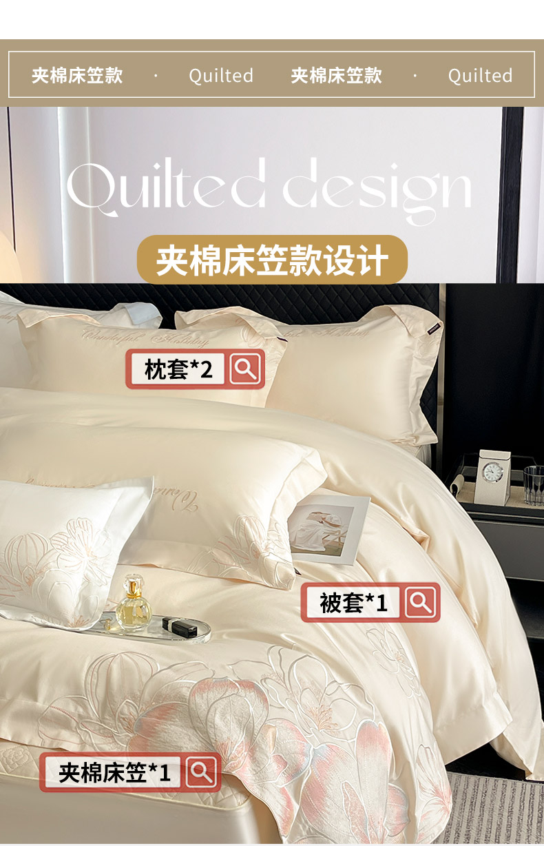 商品名称:2025新款轻奢风A类100支长绒棉四件套全棉纯棉重工刺绣床单床笠夹棉床笠床盖款高端床上用品-星慕 奶玉