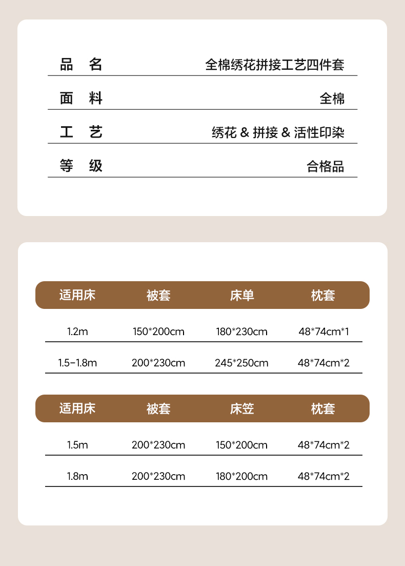 标准四件套:被套200*230床单245*250枕套48*74*2只 | ¥135.00 |