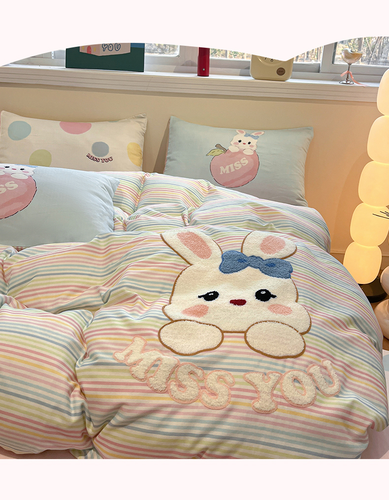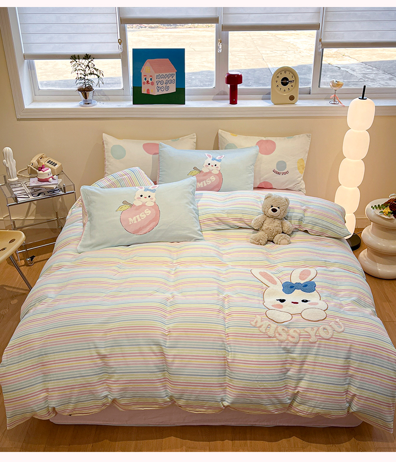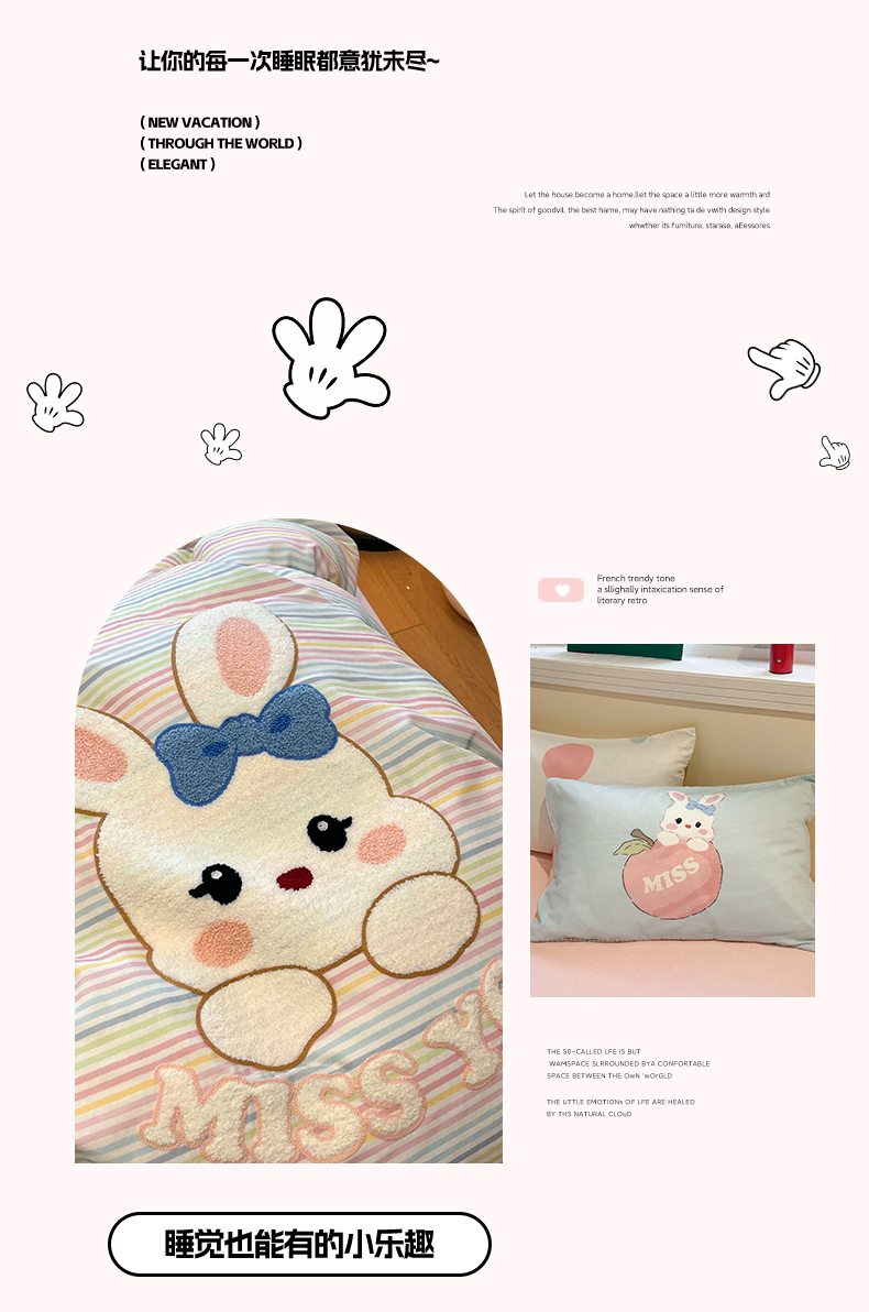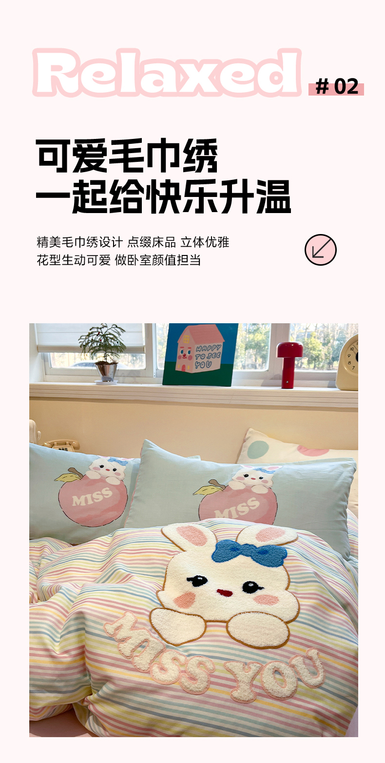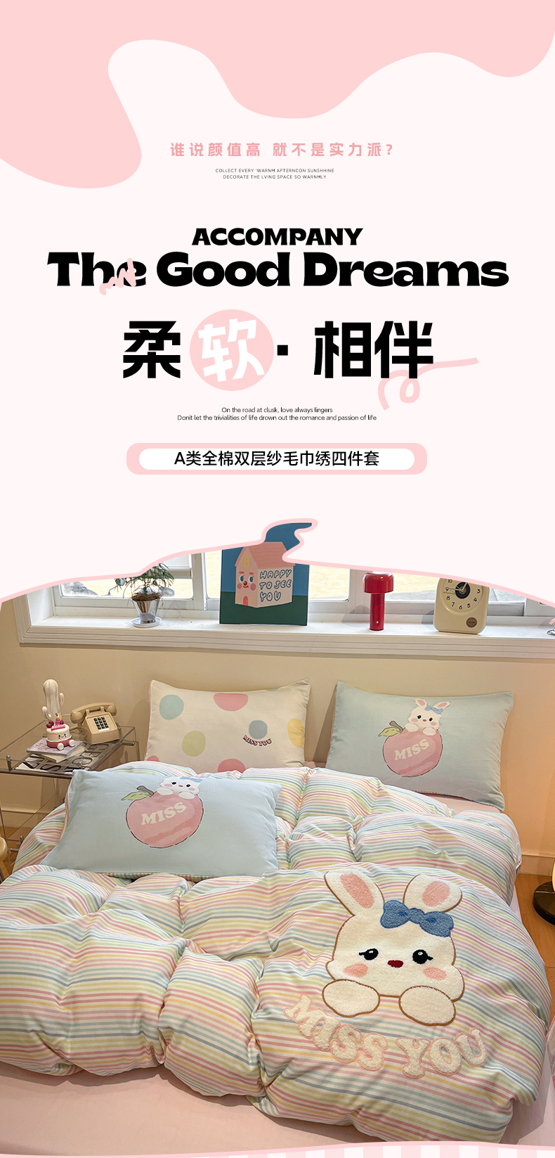 当前位置: 91家纺网 > 商品网购 > 床品套件 > 四件套 > 其它四件套 > 蓝邻家纺 2025年新款全棉双层纱毛巾绣四件套系列 彩虹兔趣