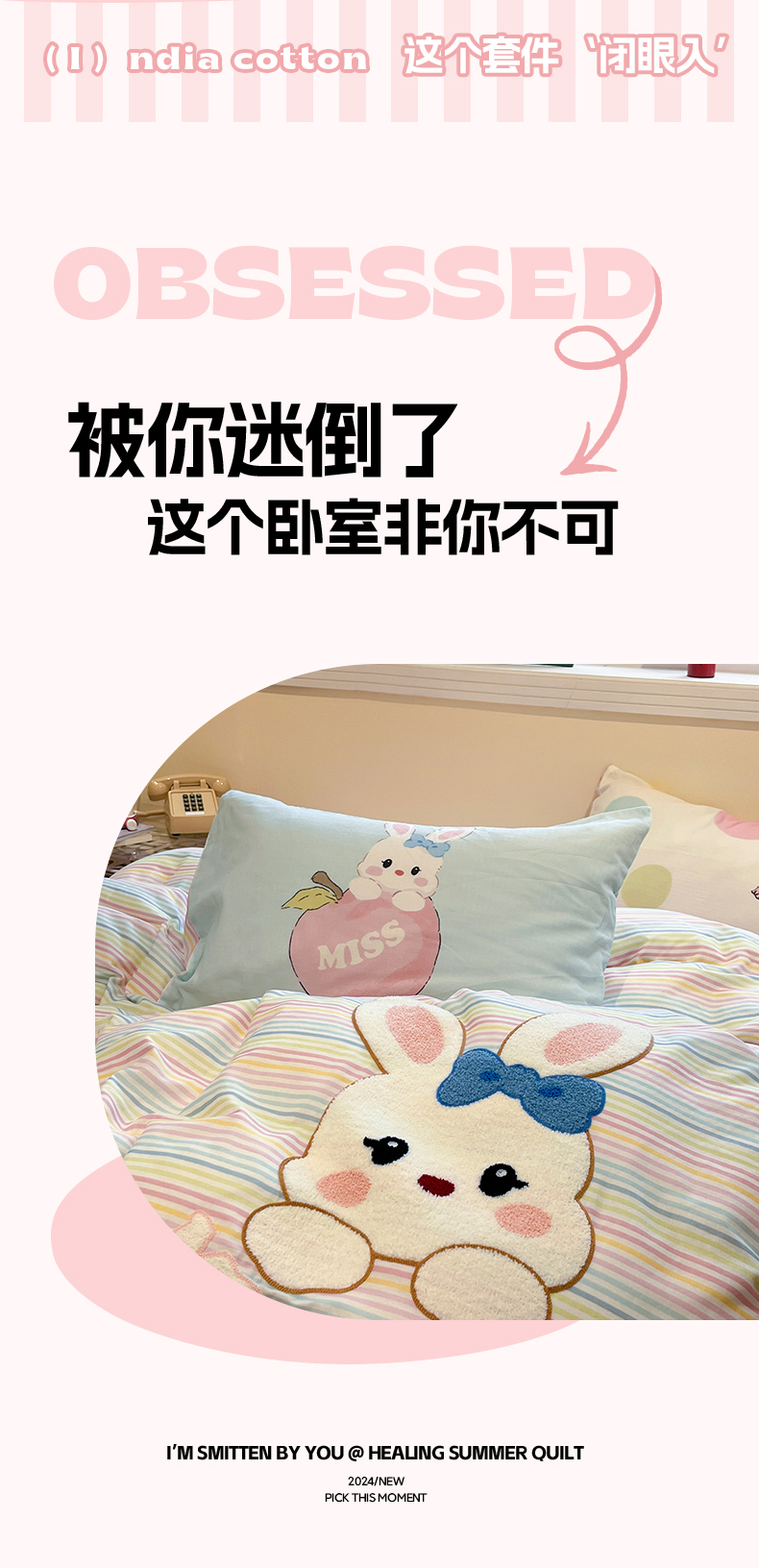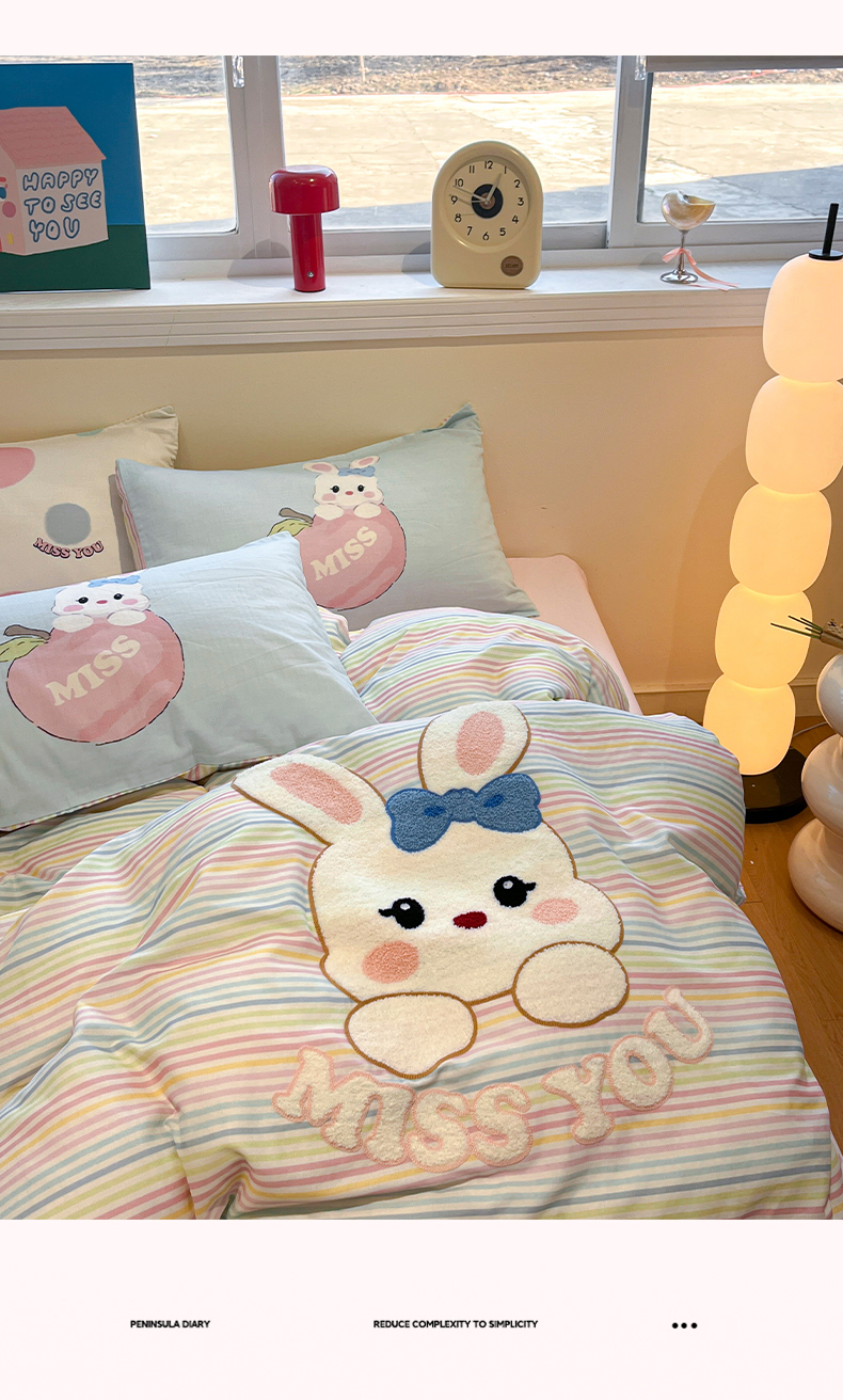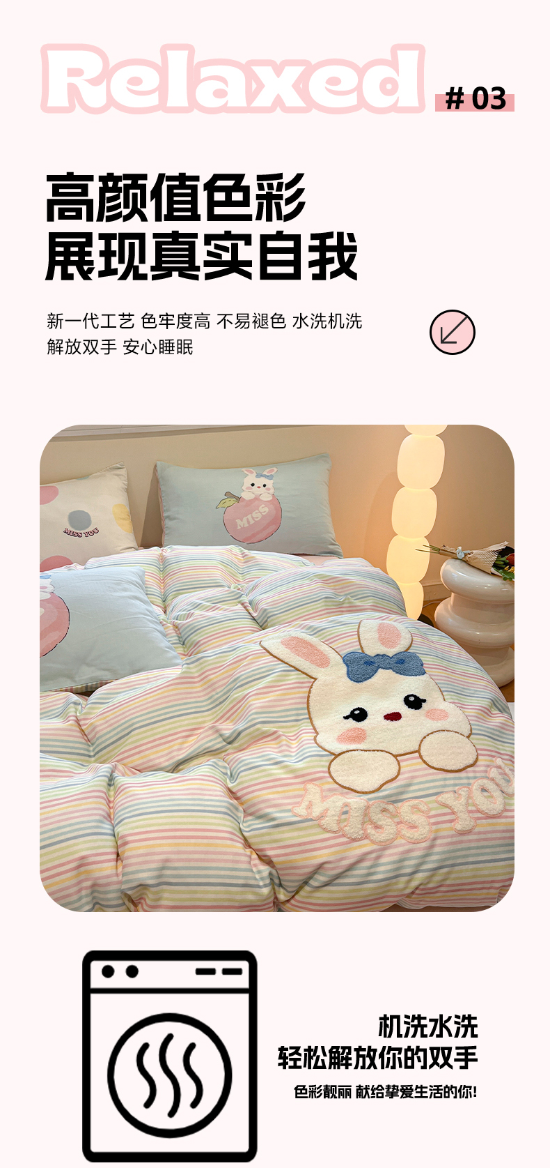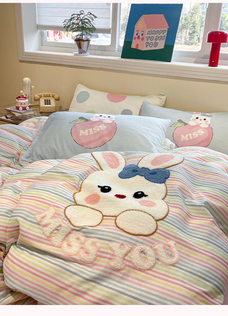 当前位置: 91家纺网 > 商品网购 > 床品套件 > 四件套 > 其它四件套 > 蓝邻家纺 2025年新款全棉双层纱毛巾绣四件套系列 彩虹兔趣