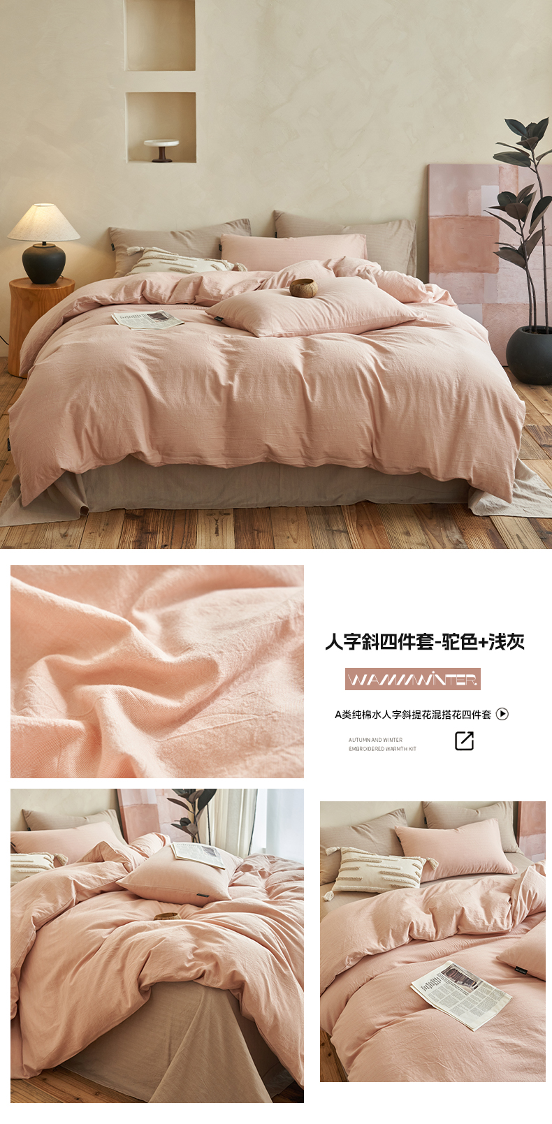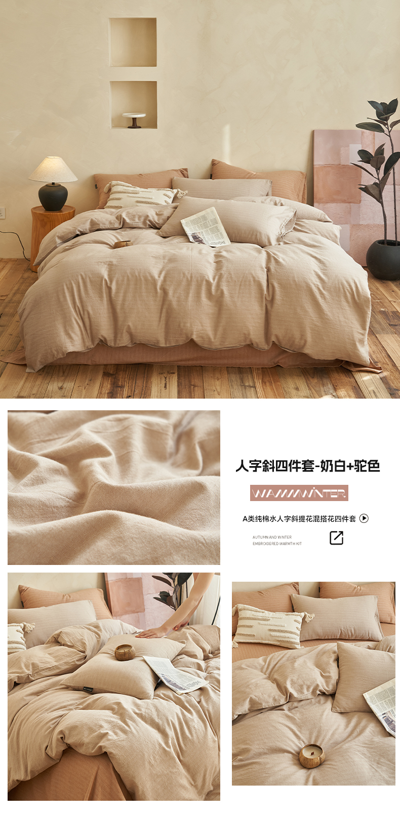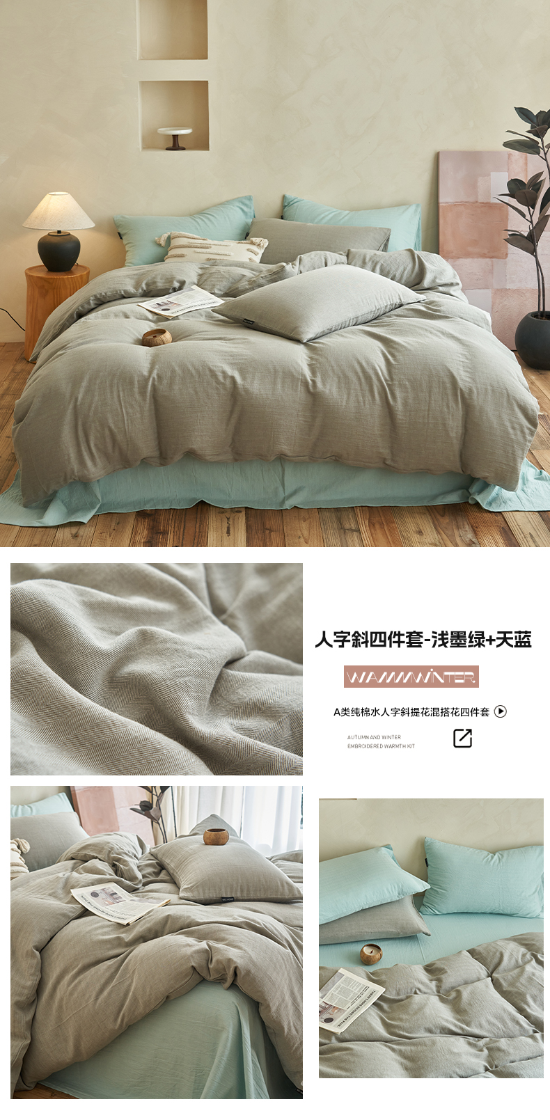 当前位置: 91家纺网 > 商品网购 > 床品套件 > 四件套 > 水洗棉四件套 > 2025新款色织水洗棉人字斜提花混搭四件套 人字斜四件套-深绿+驼色