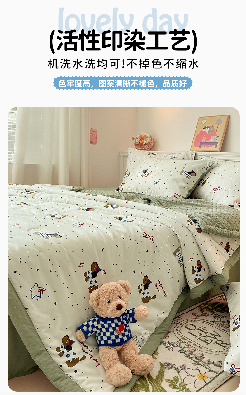 (总)盛秋家纺 2026新款皱皱纱印花夏被-萝拉,生日派对+清新绿,格子花园+奶油粉,格子铺粉+天空蓝,花丛小熊+奶油粉,可可颂蓝+天空蓝,恐龙游记+天空蓝,快乐时光+深咖,麻薯团+米驼,派对狗+深咖,森林小象+奶油粉,小狗来信+奶油粉,小伙伴+米驼,小熊小花+麦绿,修勾咖+米驼