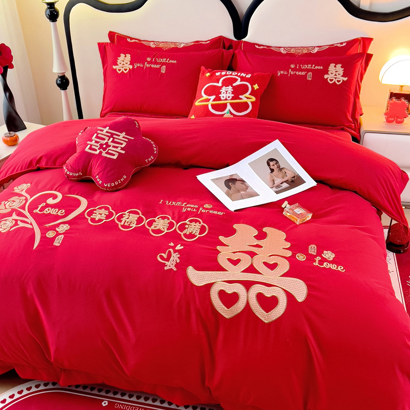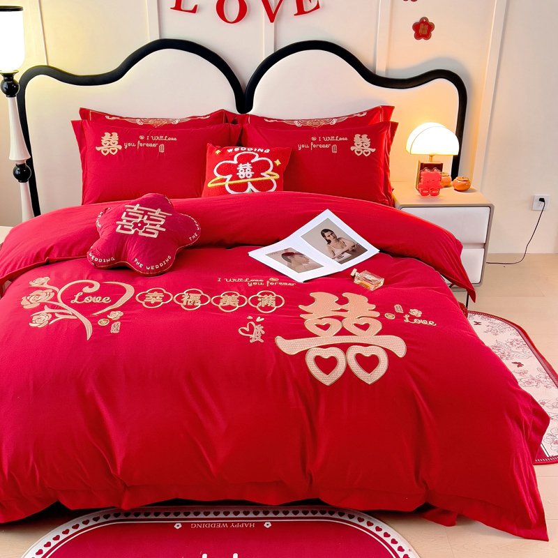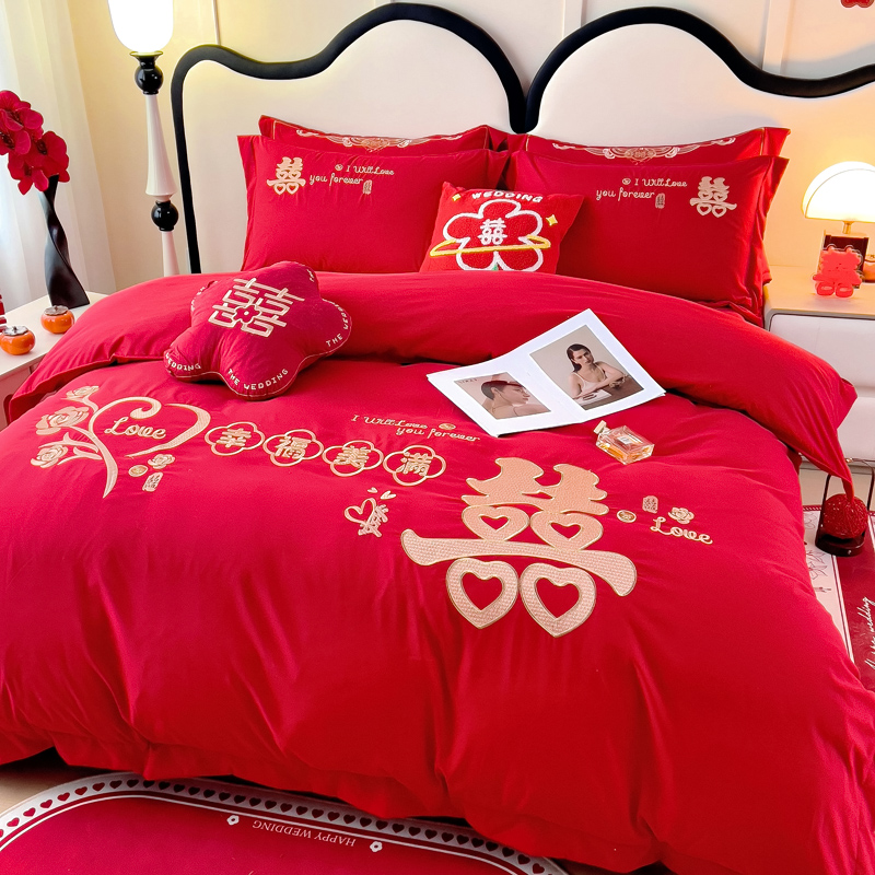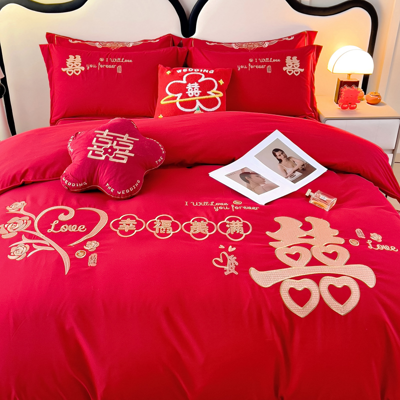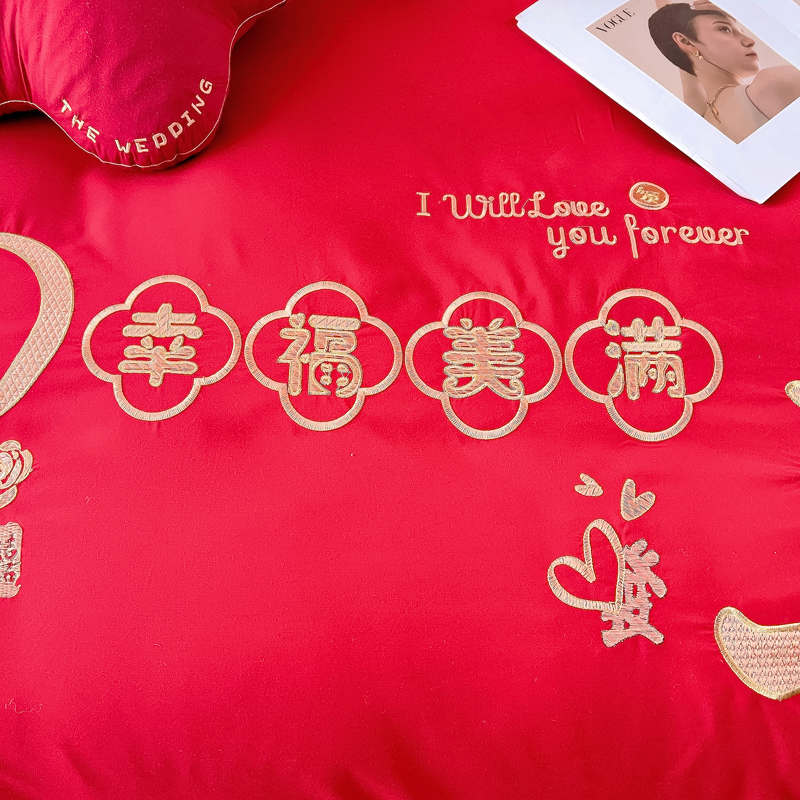 2025新款100支150克双面长绒棉婚庆绣花四件套 幸福美满