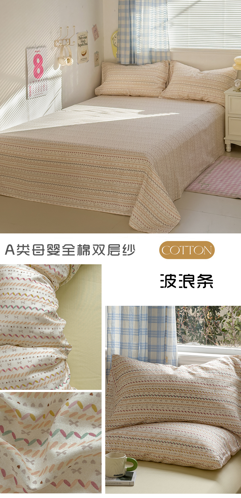 • 91家纺网 家纺一手货源 找家纺 塔塔家居  2025新款全棉纯棉双层纱床单床笠单品 波浪条
