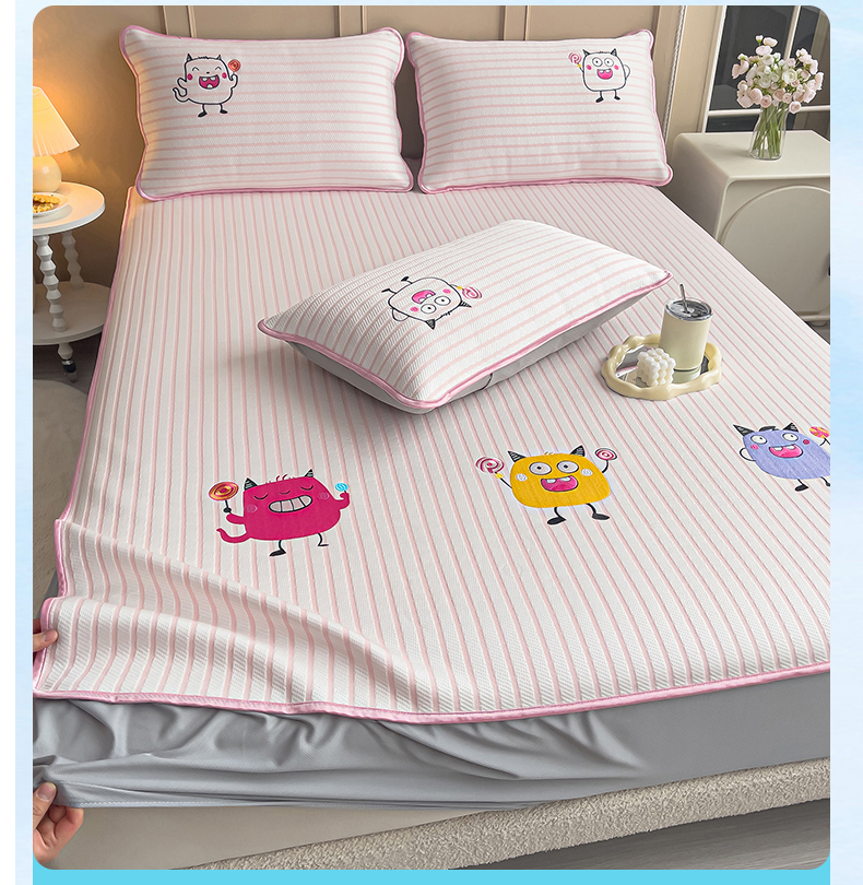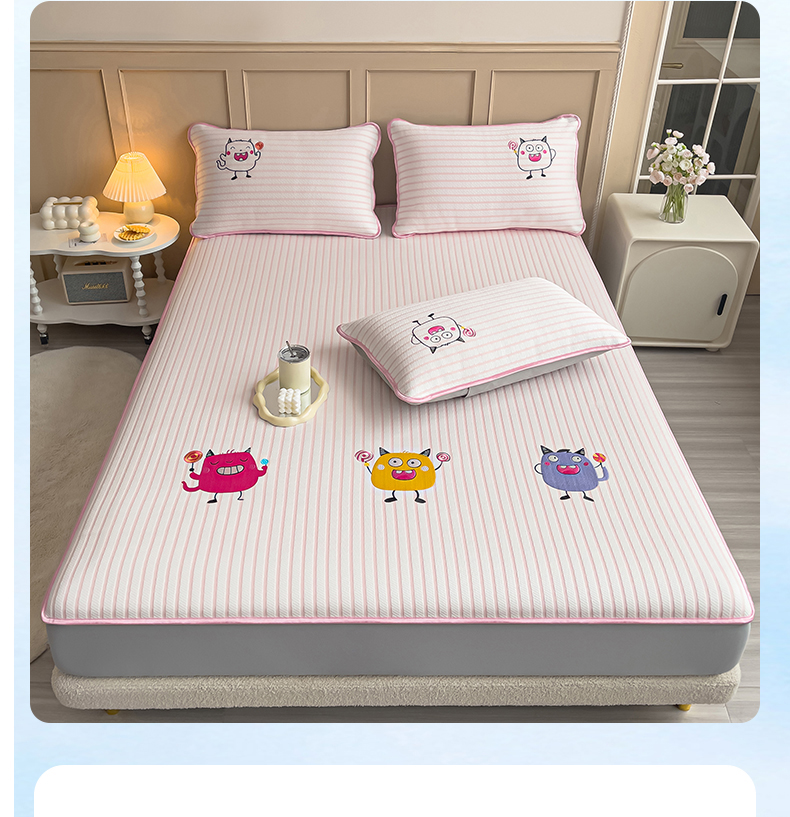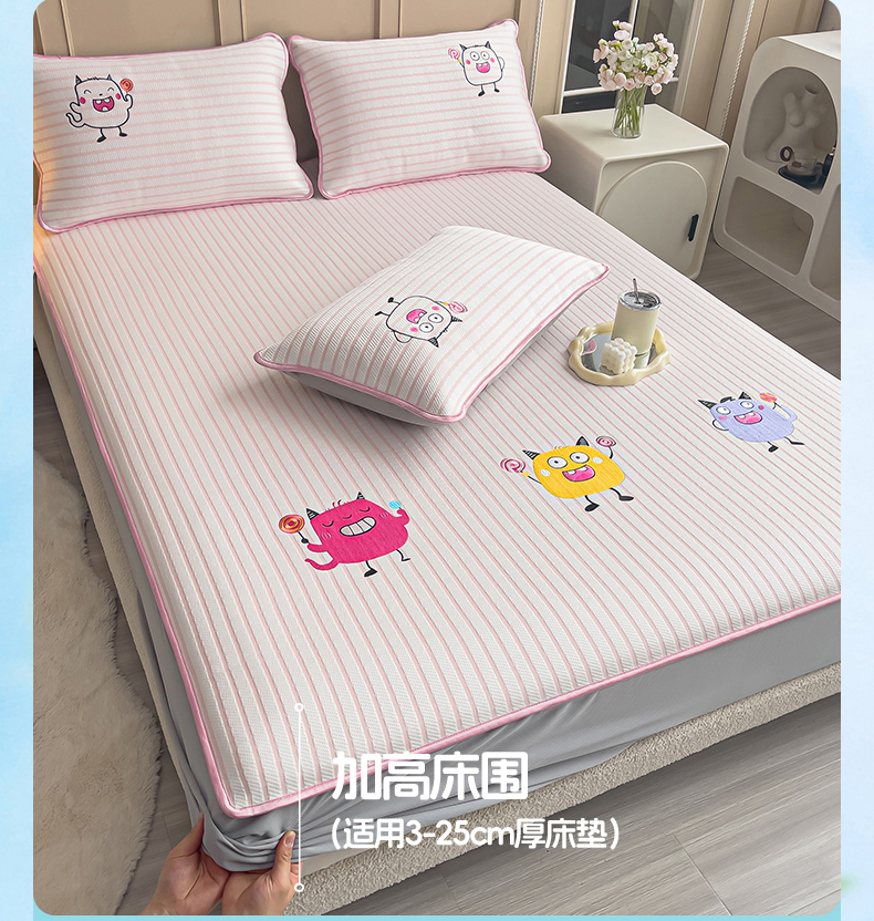 炫拼 2025新款A类凉豆豆提花条纹卡通刺绣床笠席三件套 小怪兽糖糖