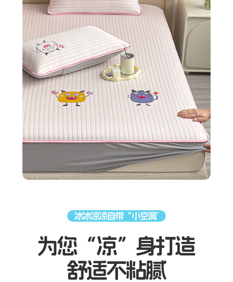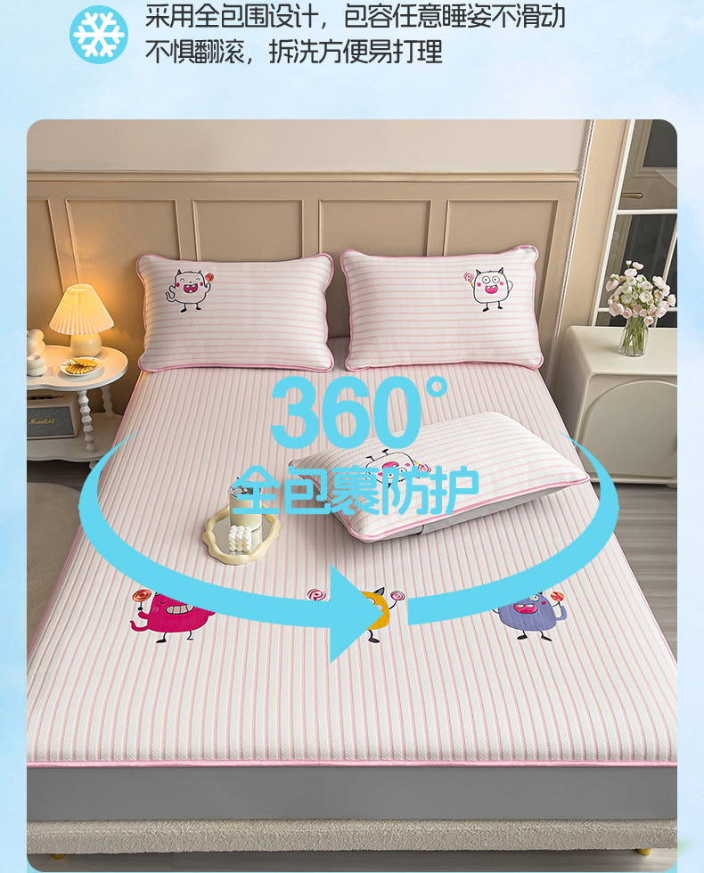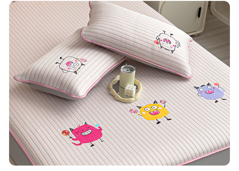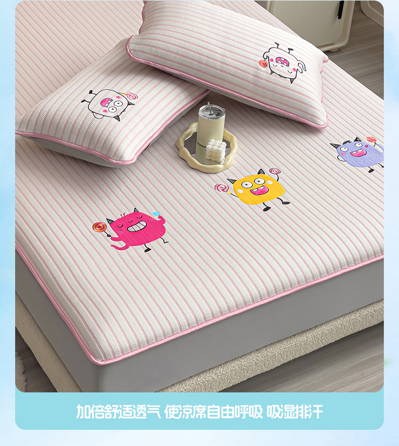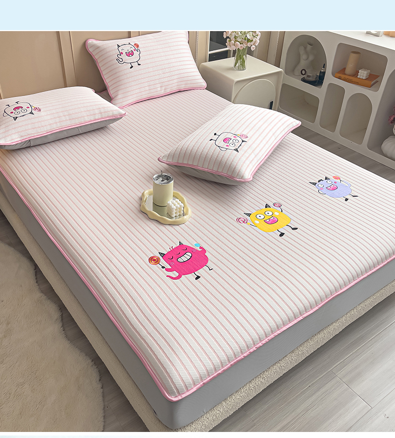商品名称:炫拼 2025新款A类凉豆豆提花条纹卡通刺绣床笠席三件套 小怪兽糖糖