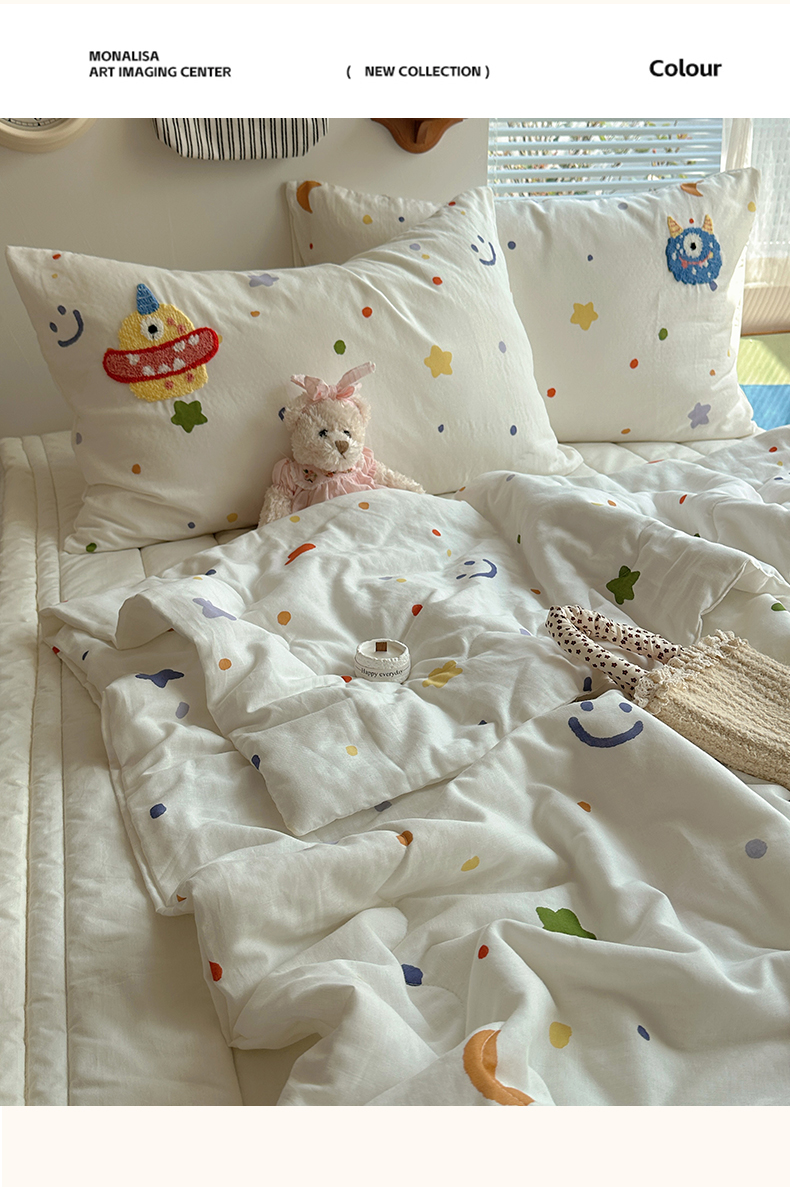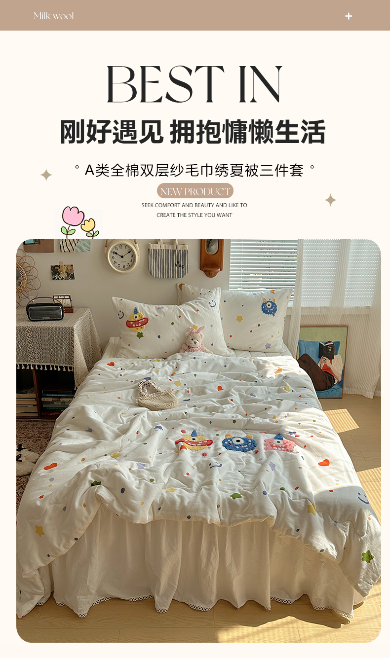 曼町家居 全棉双层纱毛巾绣夏被三件套 哆啦趣梦