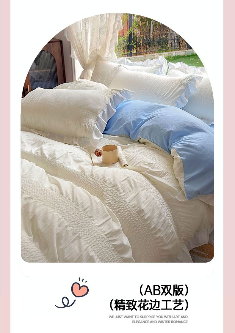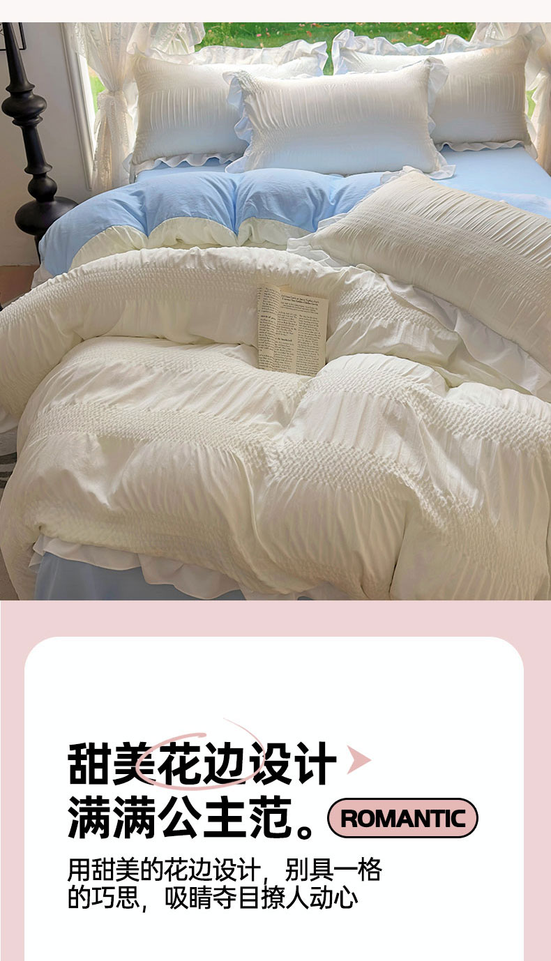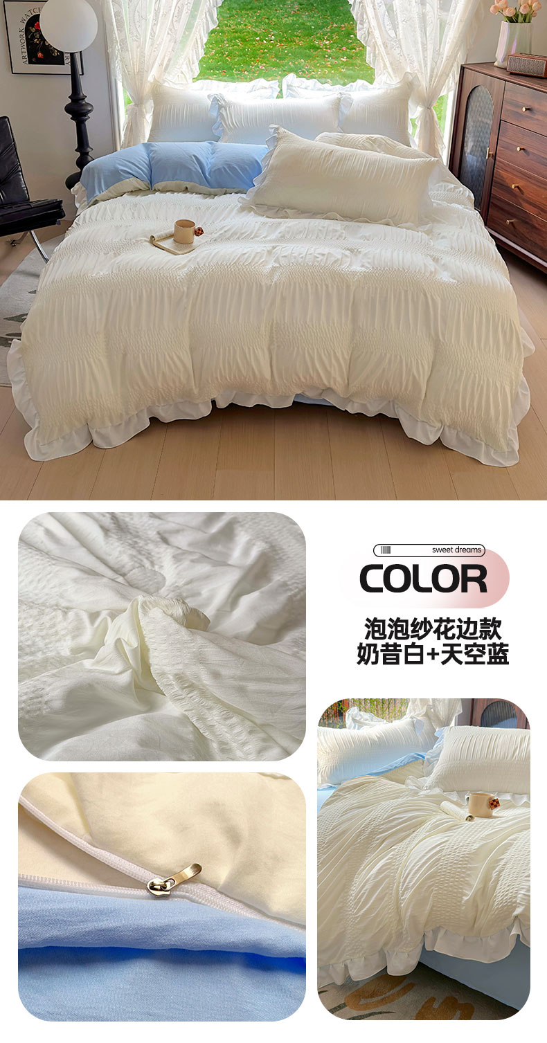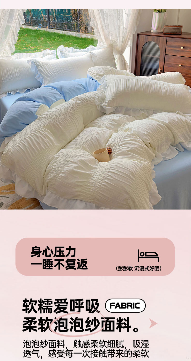 当前位置: 91家纺网 > 商品网购 > 床品套件 > 四件套 > 其它四件套 > 灰鲸2025新款泡泡纱公主风花边款四件套 泡泡纱花边款-奶昔白+天空蓝