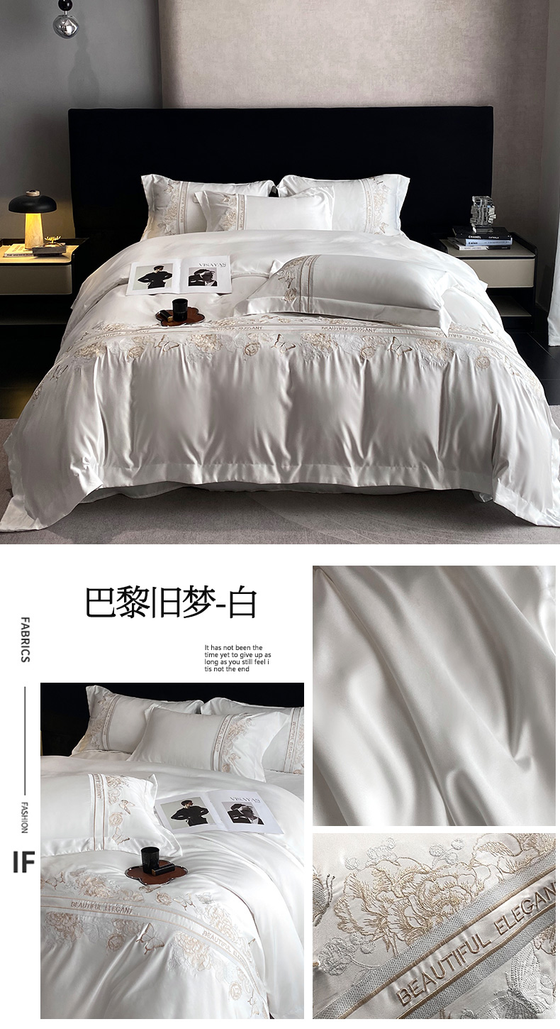 商品名称:优悦 2025新款冰丝简奢绣花四件套 巴黎旧梦-白