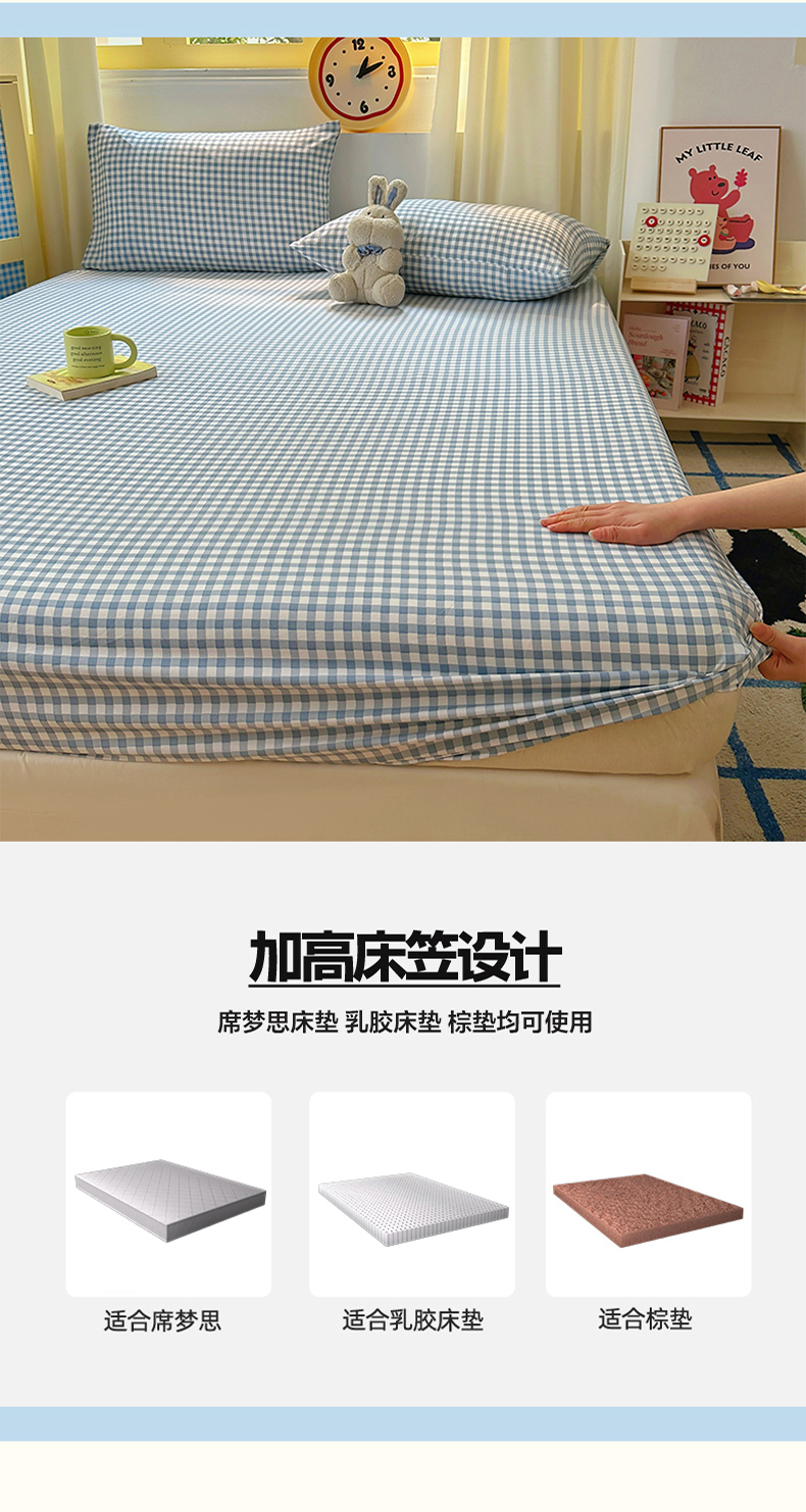 十一家居 2025新款亲肤裸睡云朵棉水洗棉床笠-洛可系列 蓝咖小格