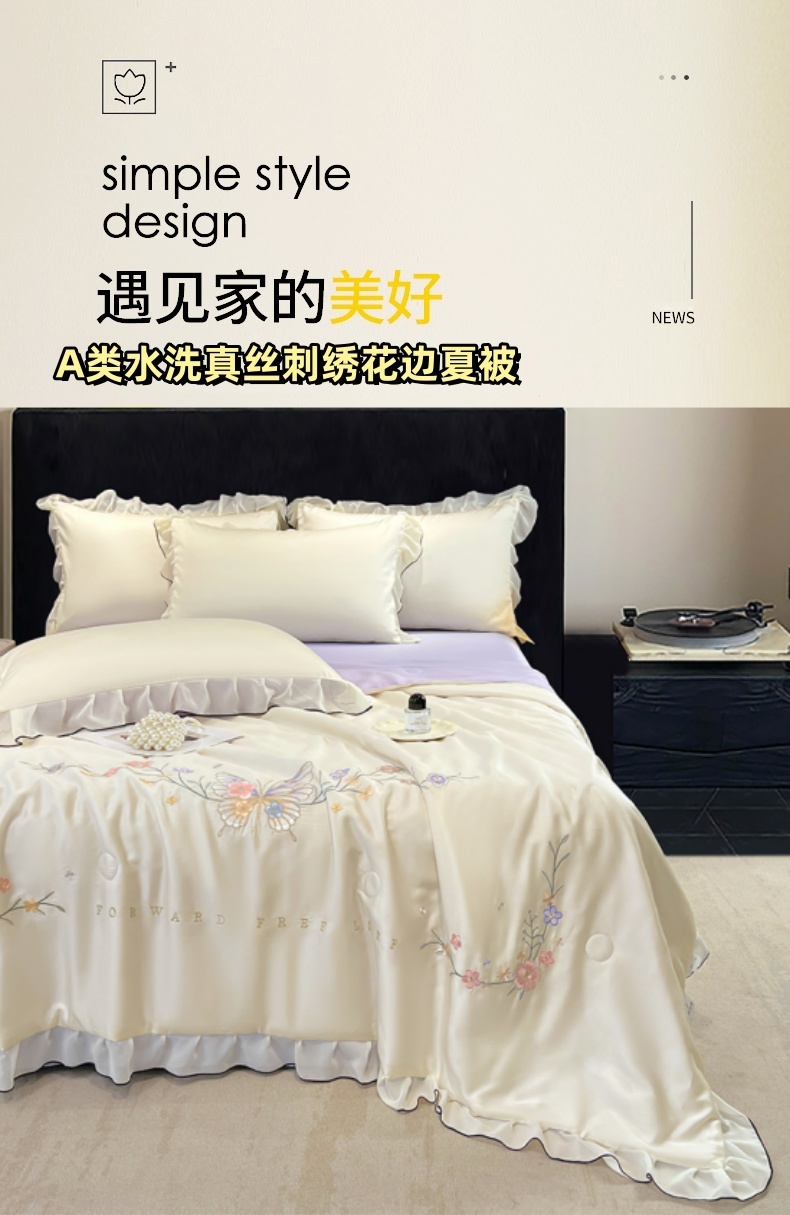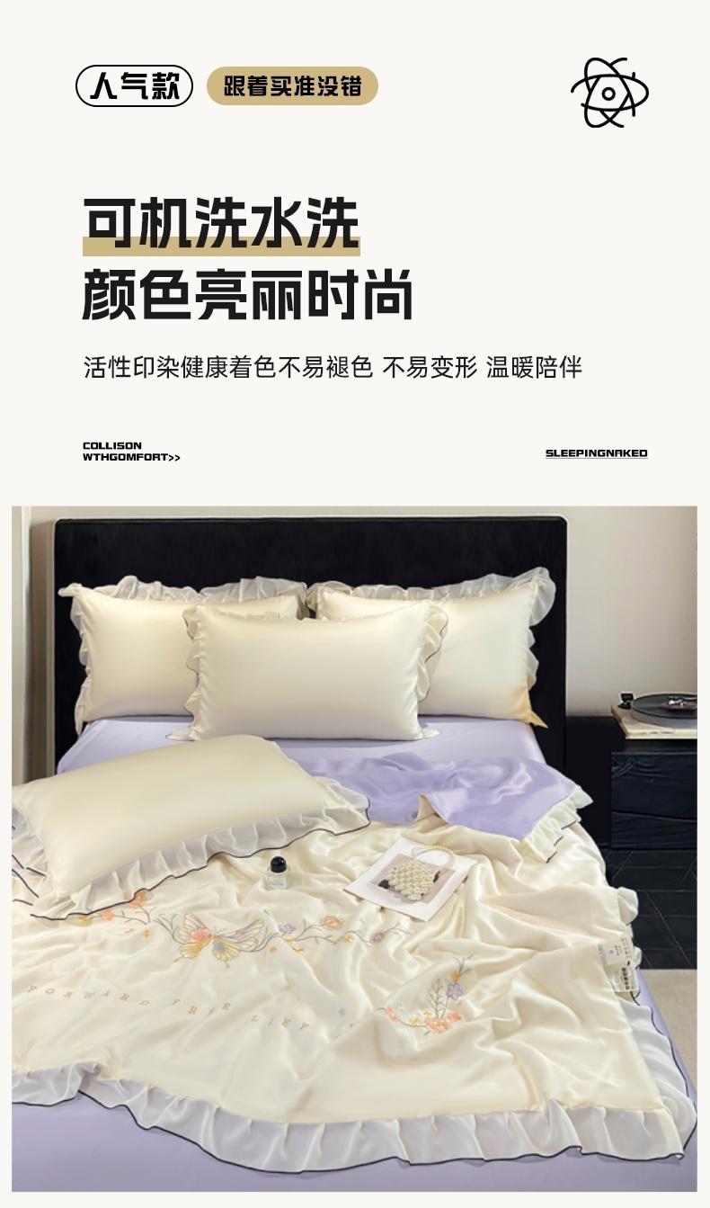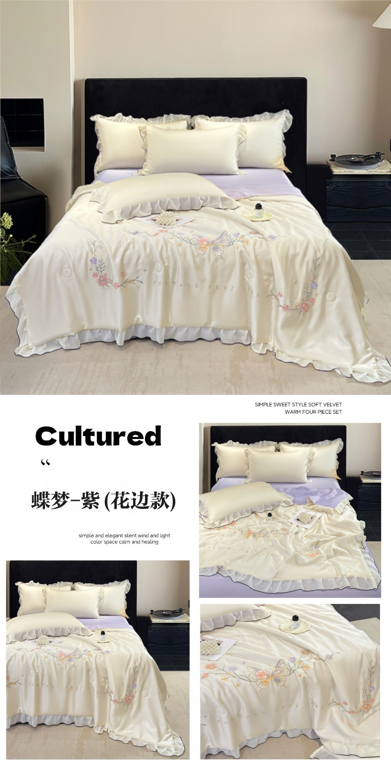 当前位置: 91家纺网 > 商品网购 > 床品套件 > 四件套 > 其它四件套 > 梦舒羽 2025新款刺绣水洗真丝花边夏被四件套宿舍夏凉被床单枕套三件套-蝶梦花边款 蝶梦-紫 花边款